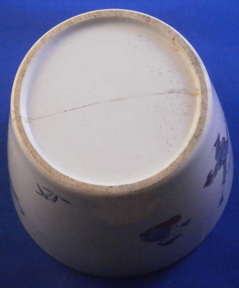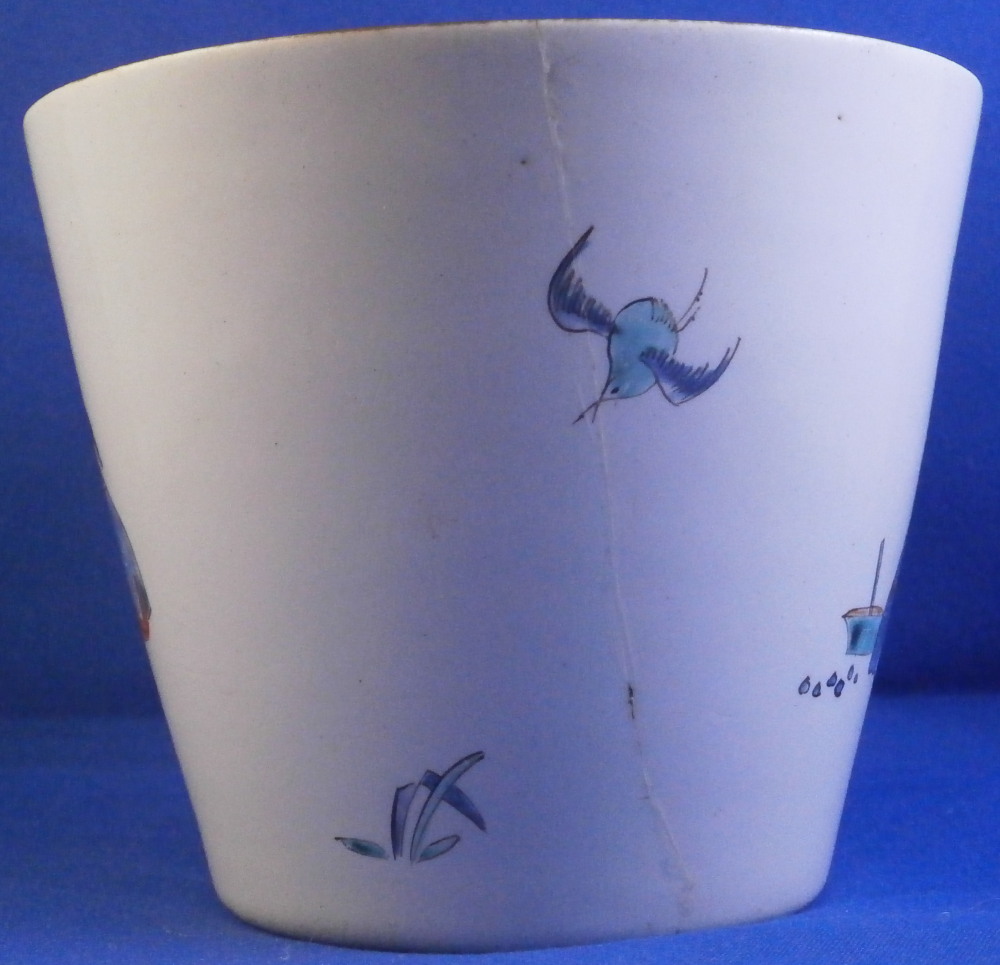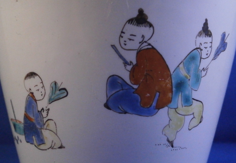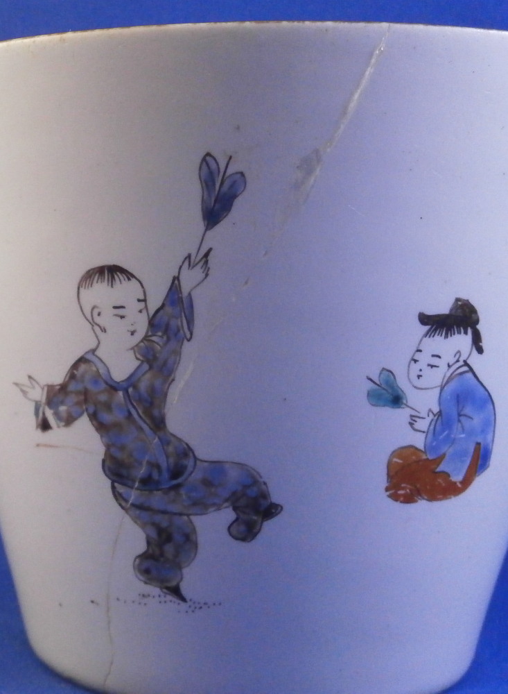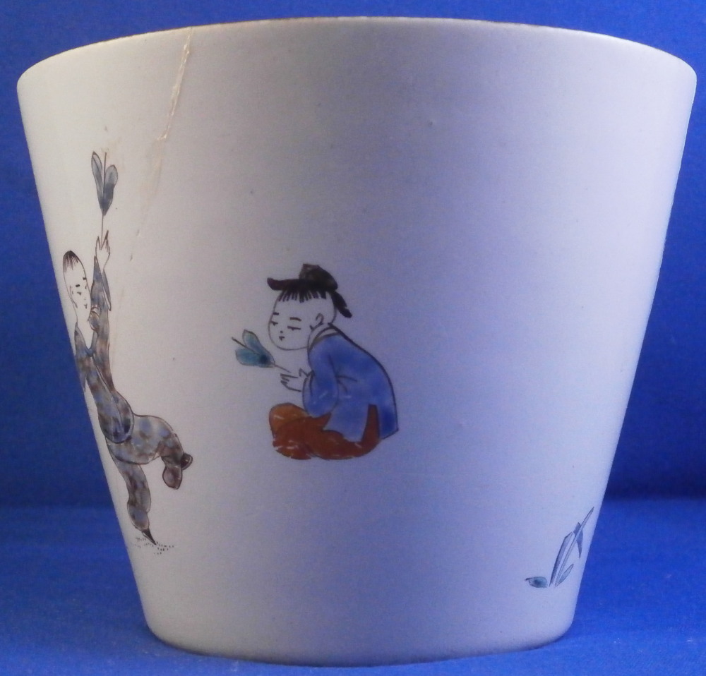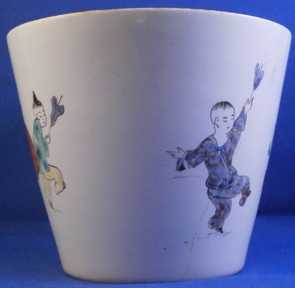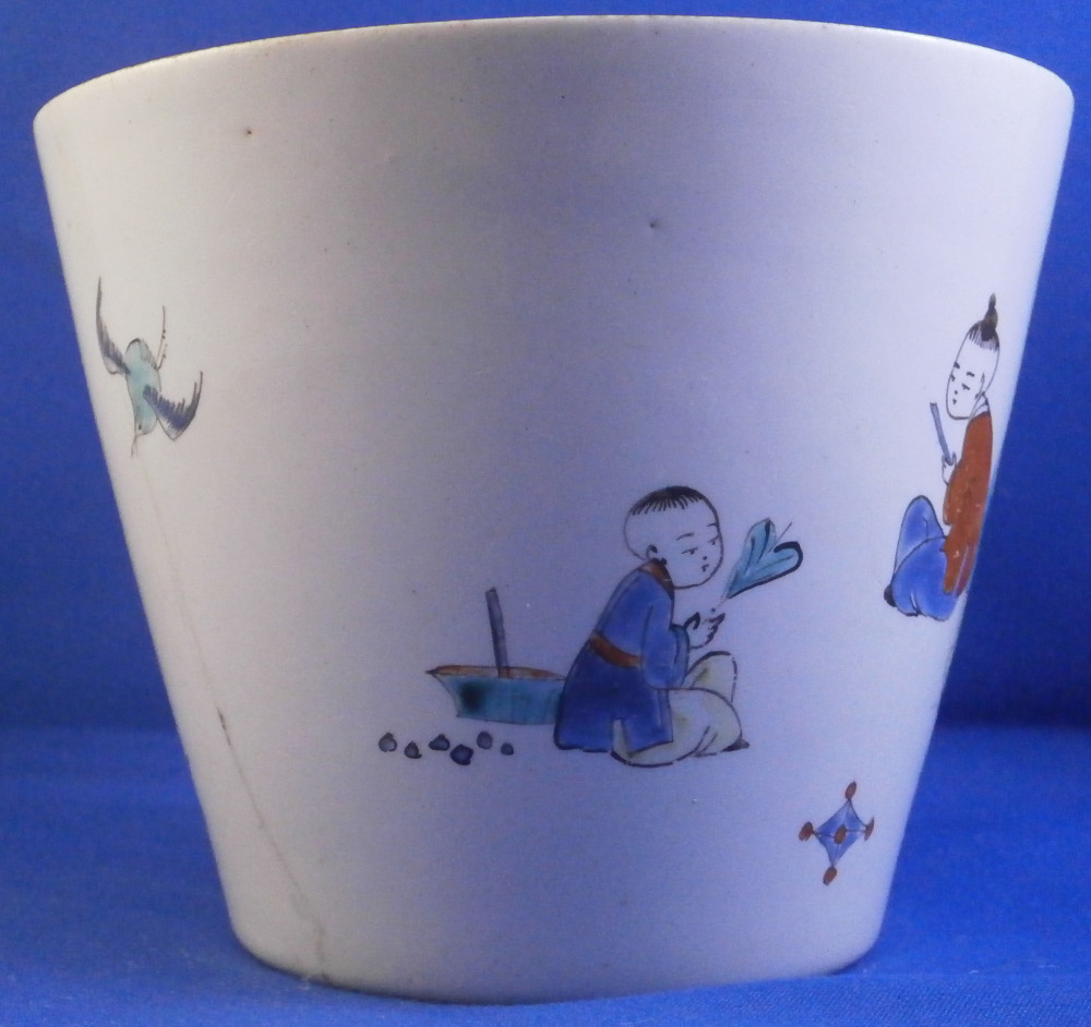 This is a superb little pot made by Chantilly in the 1730s. I am pretty sure it is a little flower pot since they made some small ones but I could not find this exact example. It is made of soft paste porcelain with a tin glaze (to make it appear whiter) and their famous and amazing enamel colors. The piece is hand painted in the Japanese Kakiemon palette colors with with a Chinoiserie design including five children doing different things as well as a bird, a grass and some type of item I cannot figure out as shown. The scene goes all around which is nice. Brown trim to the top edge. Sparingly painted but in my view this is the best porcelain ever got. Absolutely amazing to look at. As good as it gets for me. While the piece displays nicely it has been broken in two in the past and reglued. A good restorer could hide it perfectly but I think it is fine the way it is. All in all something very special that one rarely if ever gets to see outside of museums anymore. The pot is 3.5 inches tall with a diameter of 4.25 inches. The piece is unmarked underneath which is common on their early wares. Please email me for more information or other pictures.