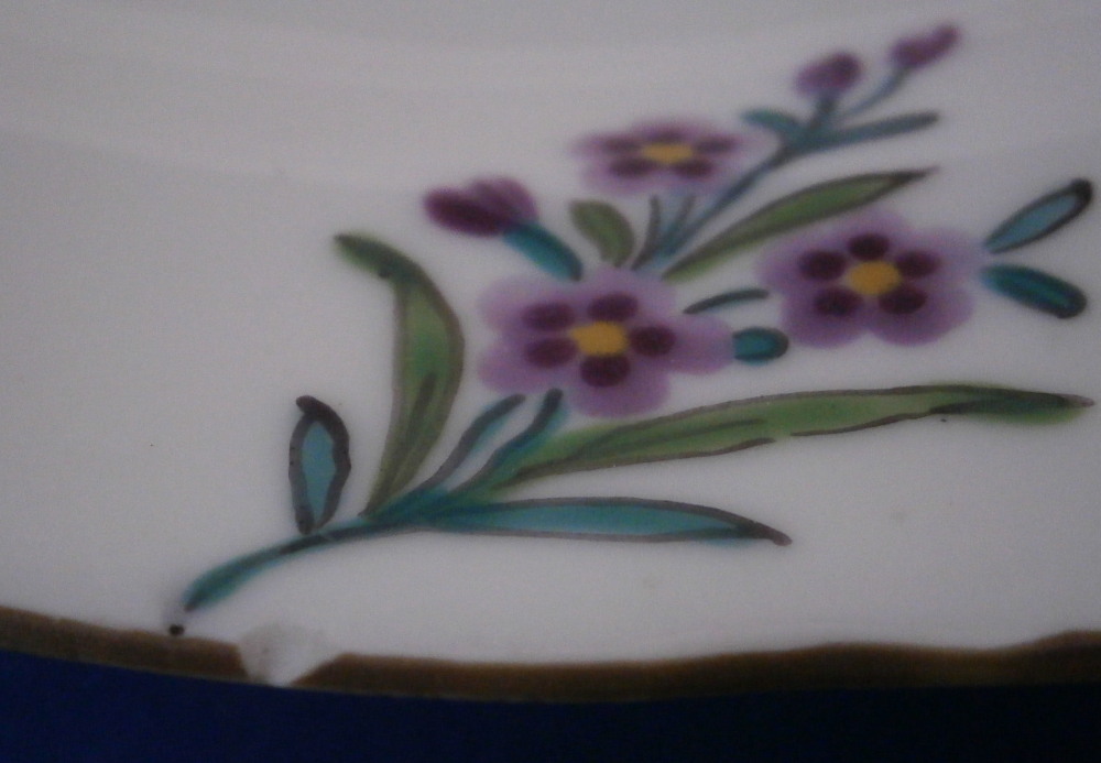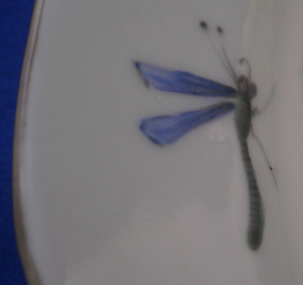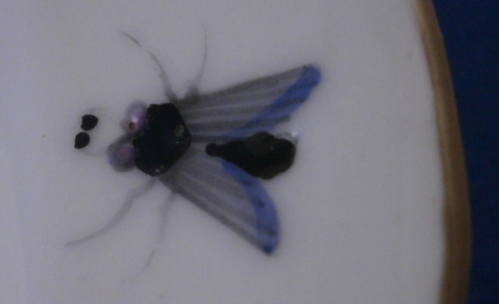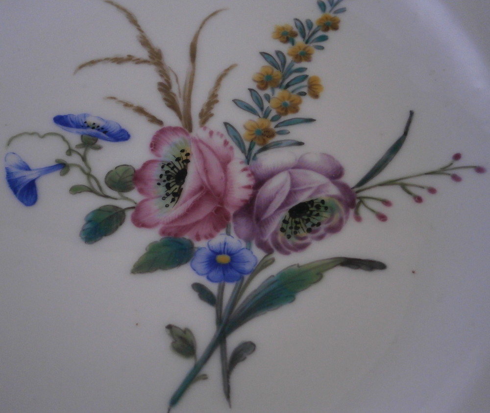 This is a really nice plate made by Chantilly in the 18th century. It is made of soft paste porcelain which has this warm creamy color to it and is hand painted with a nice floral arrangement in the center as well as two smaller flowers and four bugs on the rim. The nicely shaped edge has a brown trim to it. The plate is in good condition with a small chip right by one of the smaller flowers on the edge and a slight abrasion in another spot on the edge. Some minor use marks to the clear glaze normal to softpaste pieces. It displays very well! The piece is not marked underneath which is a bit unusual but not unheard of but the design is a known one for this maker and in fact I ahve another plate up on the site with this design that is marked as a reference. The plate is 9.125 inches in diameter and 1.25 inches tall. Please email me for more information or other pictures.