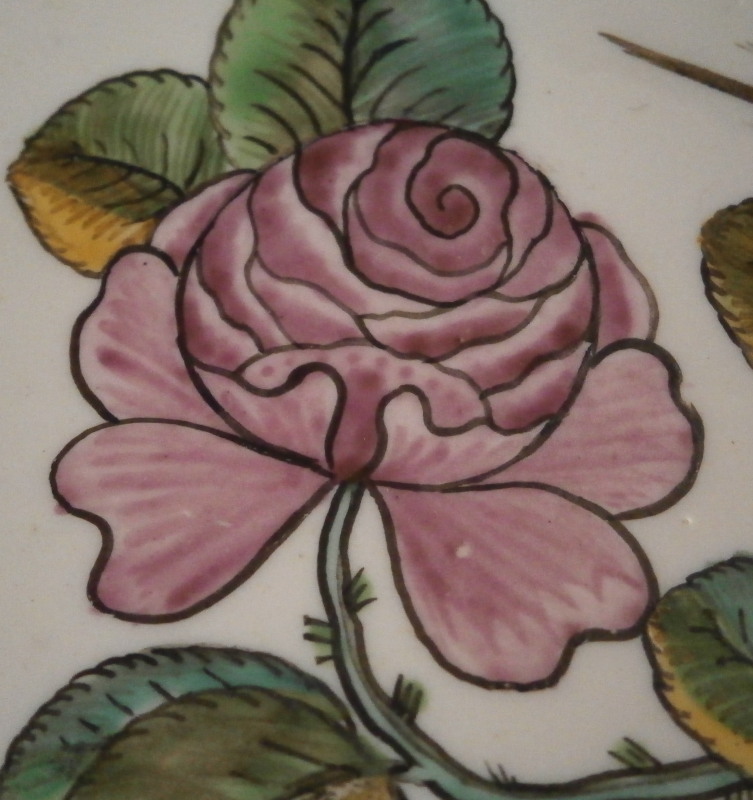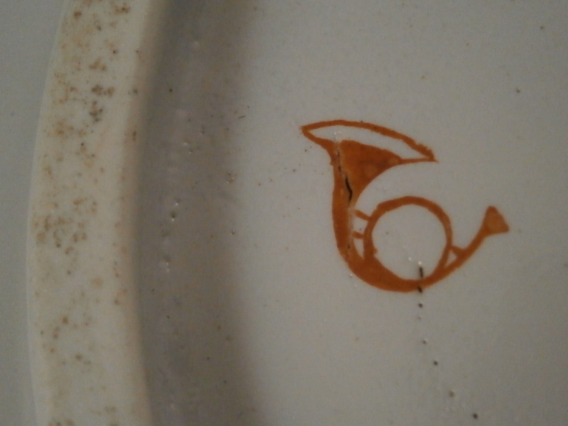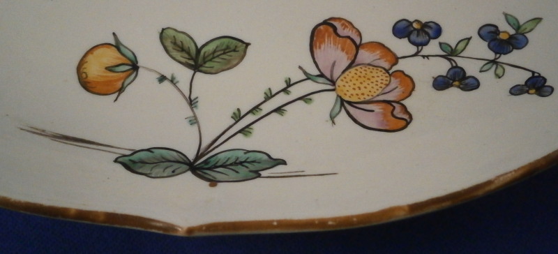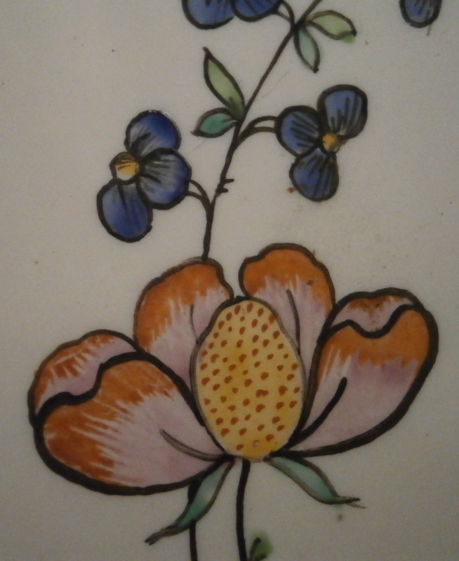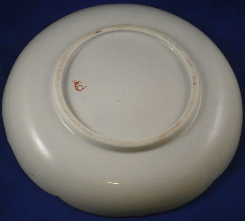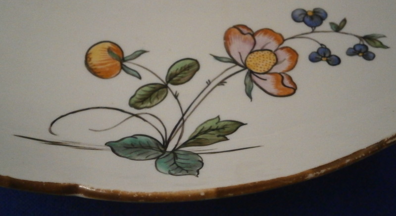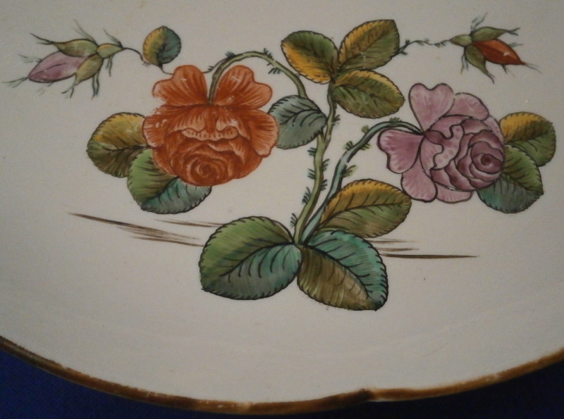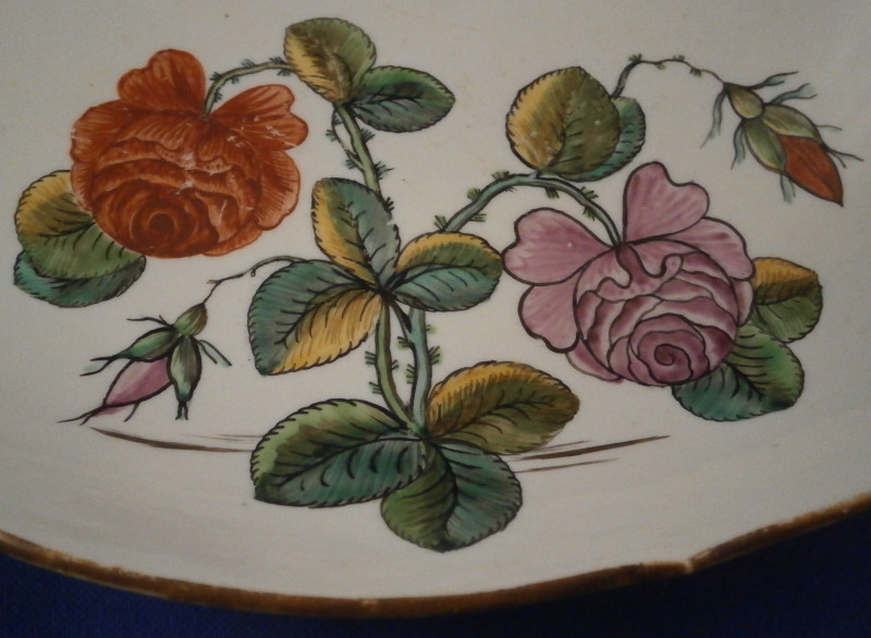 This is a superb large dish or plate made by Chantilly around the mid 18th century. It is made of soft paste porcelain and hand painted with four nice floral arrangements - two in each style. The flwoers on the one set including the red and pink roses are reminescent of Meissen woodcut style flowers which they used for a short period around 1750, The flwoers are superb and outlines with a black line trim which is very typical for this maker. The rim has a nice shape to it with a brown trim to the edge. Not sure if this is considered a plate or a serving dish with the rim shape like this but either way it is superb and looks great in my cabinet. The piece is in great condition with some minor wear to thewhich is common on softpaste porcelain and does not affect the look when on display. It is marked underneath with the reddish hunting horn mark. The dish is 1.125 inches tall and has a diameter of 9.625 inches. Please email me for more information or other pictures.