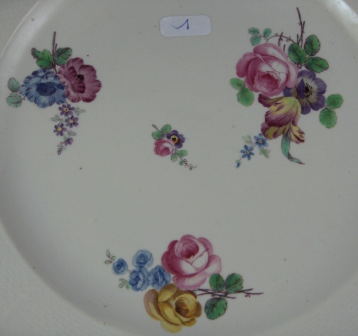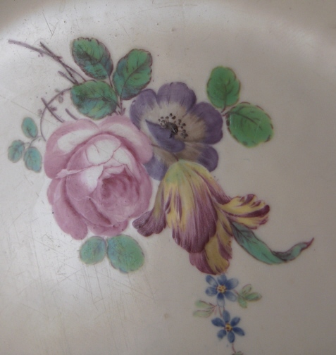 This is a plate made by Chantilly in the 18th century. It is made of soft paste porcelain and handpainted with three nice floral arrangements in the center as well as one smaller one in the middle. (Very much reminiscent of Sevres plates of the period) The nicely shaped edge has a basket weave design to the paste and a greenish brownish yellow trim (the color changes betwen a dirty orange to a light brown between all these plates). The plate is in great condition with two small nicks to the edge one of which looks to be the result of a firing issue. Some of the usual use marks which are common to softpaste porcelain but don't take away from the piece at all! It is marked underneath with the puce hunting horn mark as well as the letter G and an incised T. It is 9.375 inches in diameter and 1.125 inches tall. Please email me for more information or other pictures.