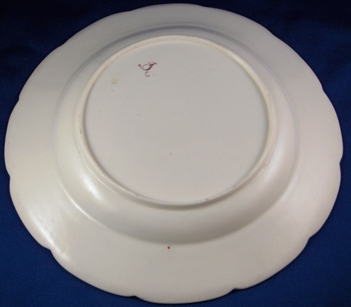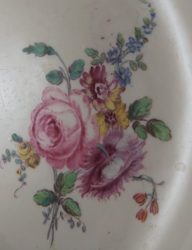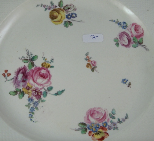 This is a plate made by Chantilly in the 18th century. It is made of soft paste porcelain and handpainted with four nice floral arrangements in the center as well as a smaller one and a small single flower. (Very much reminiscent of Sevres plates of the period) The nicely shaped edge has a basket weave design to the paste and a greenish yellow trim (the color changes betwen a dirty orange to a light brown between all these plates). The plate is in superb condition with just the usual use marks to the clear glaze which are common on softpaste porcelain but don't take away from the piece at all! One scratch does go through the purple rose but it is not that obvious. It is marked underneath with the puce hunting horn mark as well as the letter C and an incised mark that's hard to make out. It is 9.625 inches in diameter and 1.125 inches tall. Please email me for more information or other pictures.