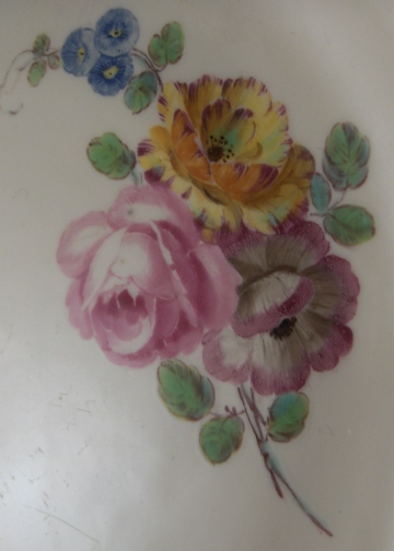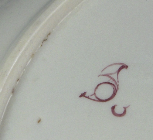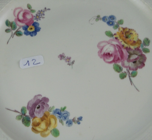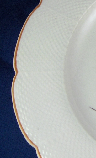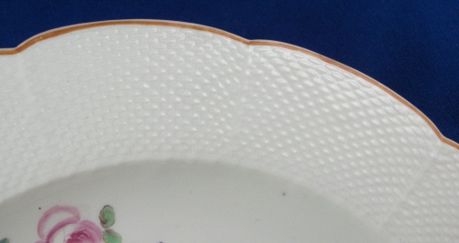 This is a plate made by Chantilly in the 18th century. It is made of soft paste porcelain and handpainted with three nice floral arrangements in the center as well as single flower in the middle. (Very much reminiscent of Sevres plates of the period) The nicely shaped edge has a basket weave design to the paste and a brownish orange trim (the color changes betwen a dirty orange to a light brown between all these plates). The plate is in superb condition with a tiny tiny fleabite to the edge. It is marked underneath with the puce hunting horn mark as well as the letter G and an incised C. It is 9.5 inches in diameter and 1 inch tall. Please email me for more information or other pictures.