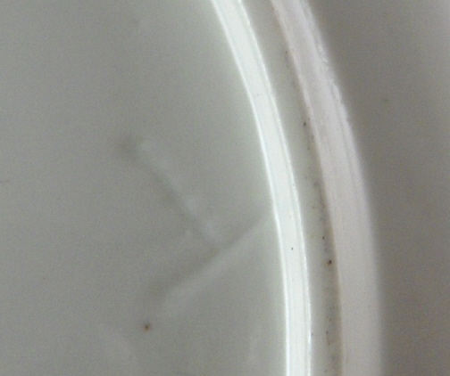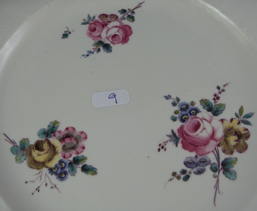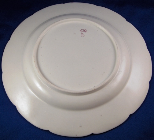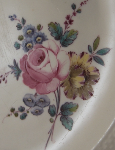 This is a plate made by Chantilly in the 18th century. It is made of soft paste porcelain and handpainted with three nice floral arrangements in the center as well as a small leaf. (Very much reminiscent of Sevres plates of the period) The nicely shaped edge has a basket weave design to the paste and a yellowish brown trim (the color changes betwen a dirty orange to a light brown between all these plates). The plate is in superb condition with just the usual use marks to the clear glaze (mostly concentrated in a section in the center of the plate) which are common on softpaste porcelain but don't take away from the piece at all! It is marked underneath with the puce hunting horn mark as well as the letter B and an incised T. It is 9.5 inches in diameter and 1 inch tall. Please email me for more information or other pictures.