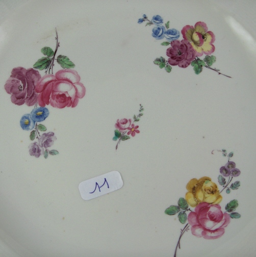 This is a plate made by Chantilly in the 18th century. It is made of soft paste porcelain and handpainted with three nice floral arrangements in the center as well as a smaller one in the middle. (Very much reminiscent of Sevres plates of the period) The nicely shaped edge has a basket weave design to the paste and a light brown trim (the color changes betwen a dirty orange to a light brown between all these plates). The plate is in superb condition. It is marked underneath with the puce hunting horn mark as well as the letter C and an incised T. It is 9.625 inches in diameter and 1.125 inches tall. Please email me for more information or other pictures.
