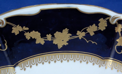 This is a very nice oval dish made by Chelsea around 1760. It is made of softpaste porcelain and handpainted with a classical urn draped in floral garlands in the center, some small scattered flowers throughout the middle and their famous Mazarine blue ground color on the rim with a superb gold design to finish off this elegant dish! Their peices from this period are among the most notable of English porcelain and their mazarine blue was originally an imitation of the even more famous Sevres blue which is even today impossible to copy perfectly. I love the shape which is not common at all either. The dish is in great condition and pretty much perfect from the top but there must have been some shallow outside rim chips which were restored and the color has slightly changed over time. No big deal as it displays perfectly! The piece is marked underneath with the gold anchor and still has some old stickers from previous dealers / auctions on it that I always enjoy. The piece displays the typical moons when you shine a light through it. It is 1.5 inches tall, 7.625 inches deep and 10.25 inches wide.