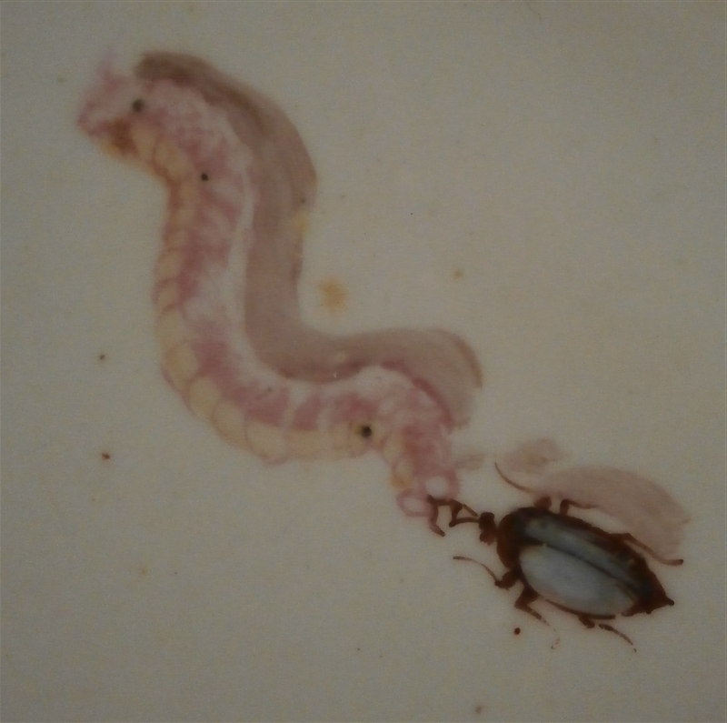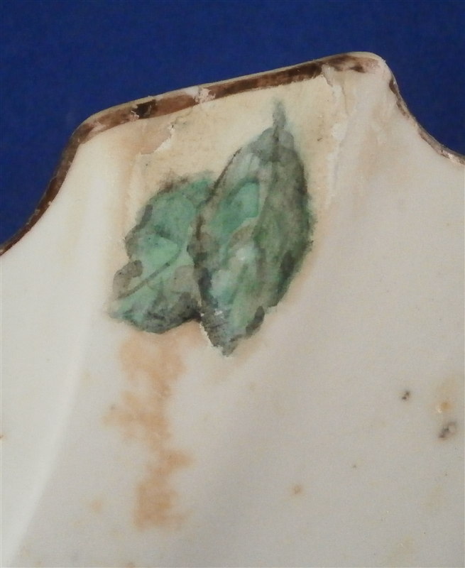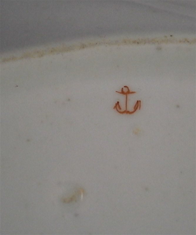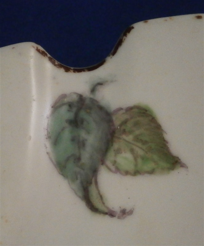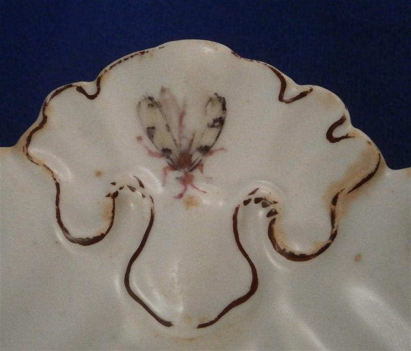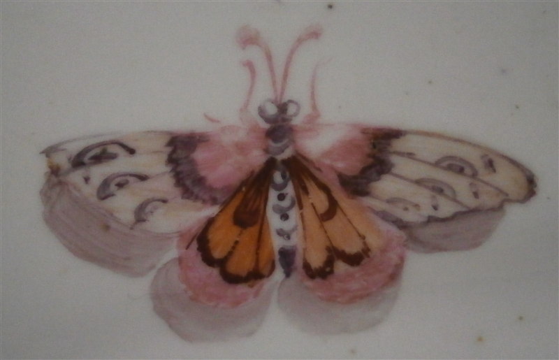This is a silver shaped dish made by Chelsea around 1755. It is made of soft paste porcelain and hand painted with some nice bugs with their shades after Klinger at Meissen including butterflies, a lady bug and a caterpillar as well as some leaves to hide flaws, shell shaped handles and a nice reddish brown trim along the edges. The piece is in good condition with some firing issues in the shape of tiny black firing spots, some staining in places, a line to the underside footring, a bit of wear to the brown trim and a shallow chip by one of the sets of leaves as shown that was reglued back in and painted over a bit. It displays nicely! The piece is marked with the tiny red anchor underneath as shown and it has the typical spur marks on the back from firing and the moons when you shine a light through it. The dish is 1.375 inches tall, 9.5 inches wide and 7.5 inches deep. Please email me for more information or other pictures.