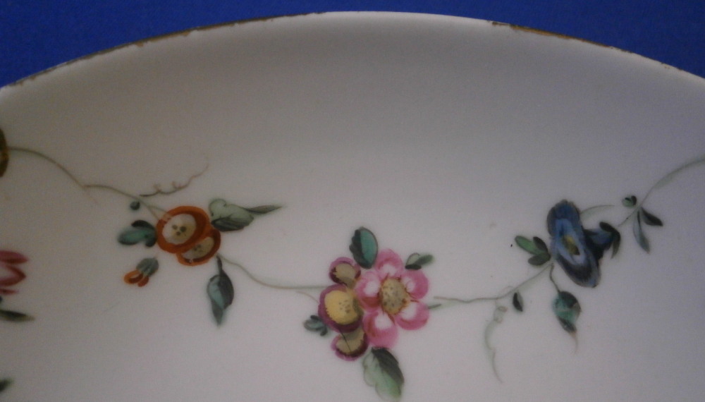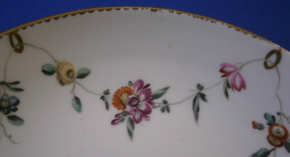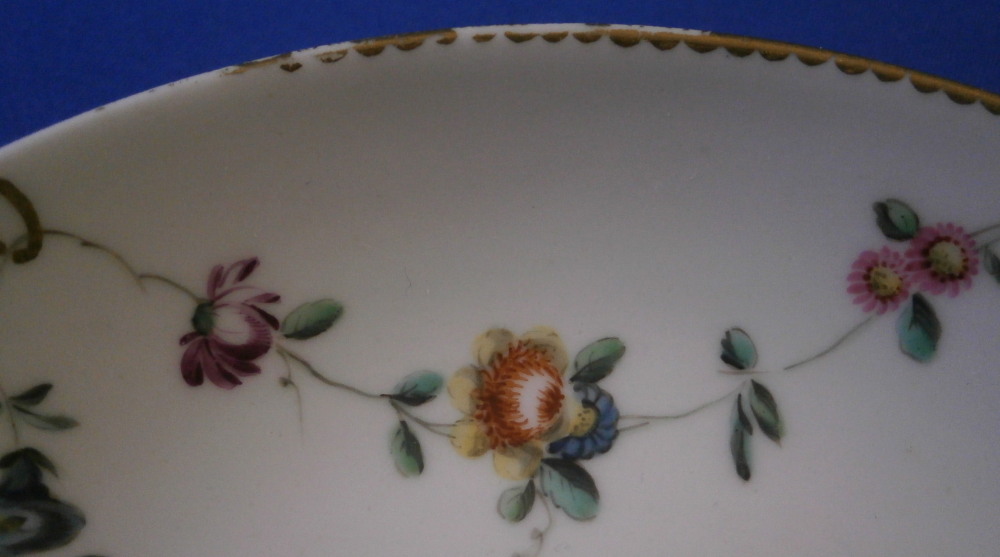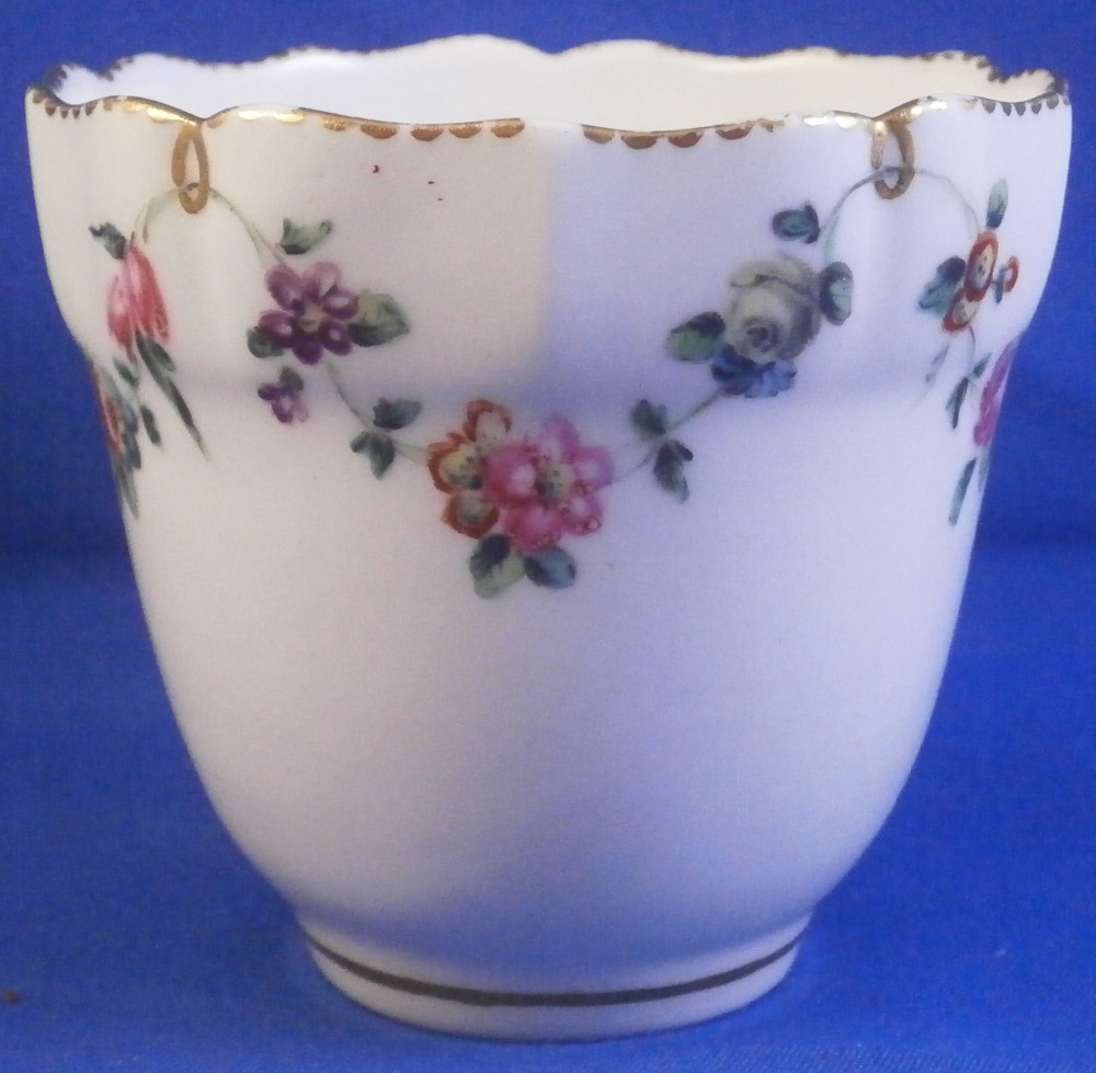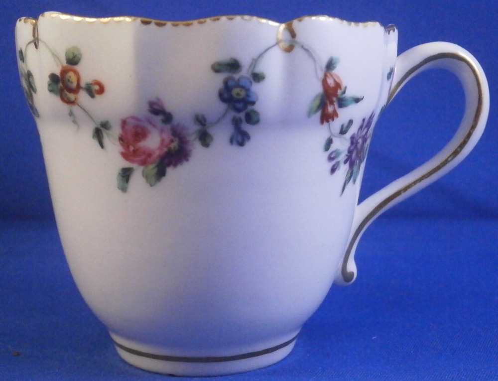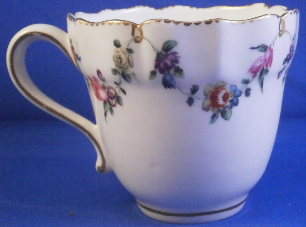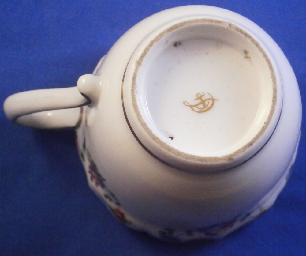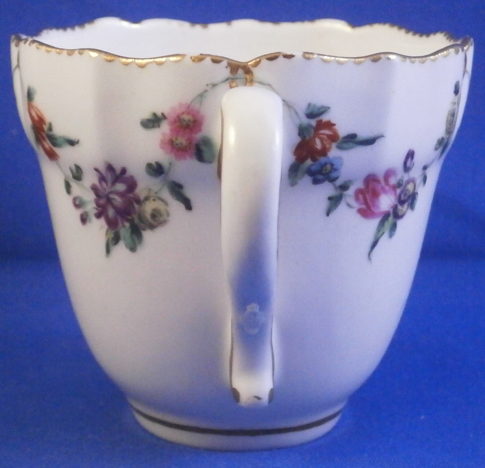 This is a nicecup and saucer made by Chelsea Derby during the 18th century. I believe this period lasted from 1770 until 1784. Both pieces are hand painted with polychrome floral swags hung by small gold rings along the edge. Nice gold trim to the edges and a simple gold trim to the handle. A single flower in the center of the saucer and a leaf design tot he bottom inside of the cup - always a sure sign of a quality early piece. Both are nicely made and quite typical of this period. The set is in great condition with some use marks and the gilding along the top edges are worn in places as shown. The cup is 2.5 inches tall and 2.75 inches in diameter. The saucer is just over 1 inch tall with a diameter of just under 5 inches. Both are marked underneath with the gold anchor crossing the letter D in script mark though it has mostly worn off underneath the saucer. Please email me for more information or other pictures.