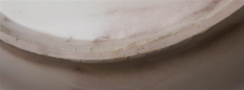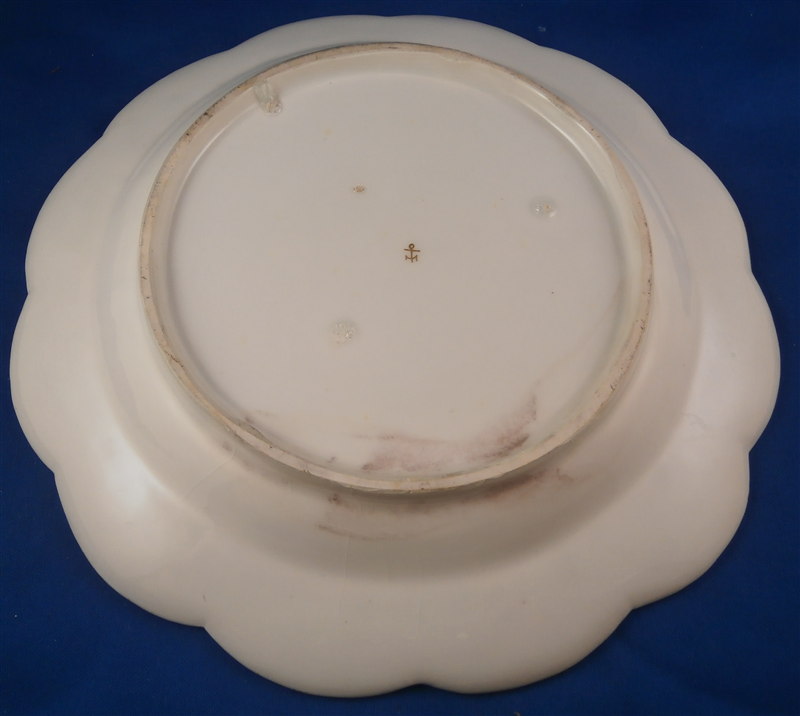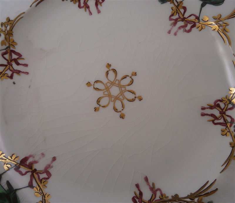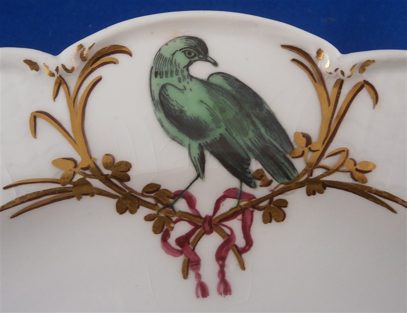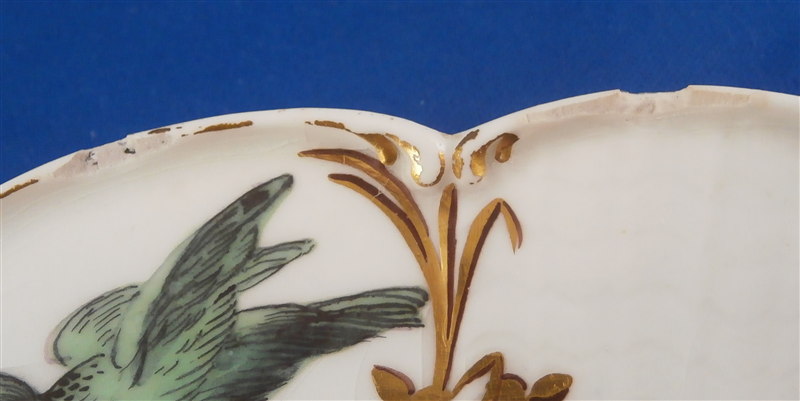 This is a bit of an unusual plate made by Chelsea in the mid 18th century around 1765. It is made of softpaste porcelain with a thick glaze. The plate is handpainted with green birds all around the rim surrounded by a black and gold leafy trim held together by a puce bow. Gold and black central design. The paste in between the bird cartouches has a nice relief design to it but the thick glaze makes it hard to see. The plate is in good condition with some wear mainly to the gold trim on the very edge, three edge chips as shown and the glaze has crazing to it also shown.A little staining to one area. It displays very nicely! I have never seen glaze this thick as I tried to show in the pictures - it looks like glass over the porcelain in some areas 2mm thick. Amazing! The piece is marked with the tiny gold anchor underneath and it has the three typical spur or stilt marks on the back from firing. The plate is 1.25 inches tall and has a diameter of 8.875 inches. Please email me for more information or other pictures.