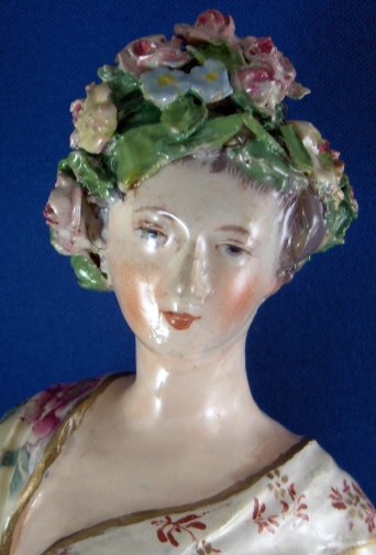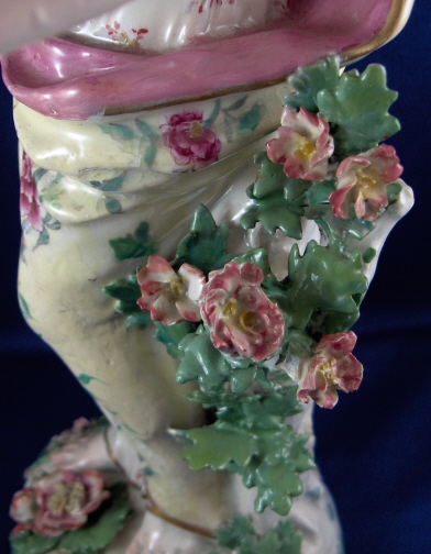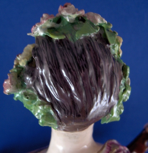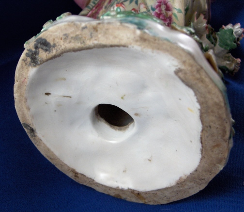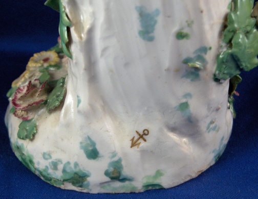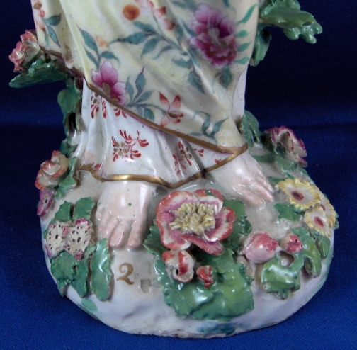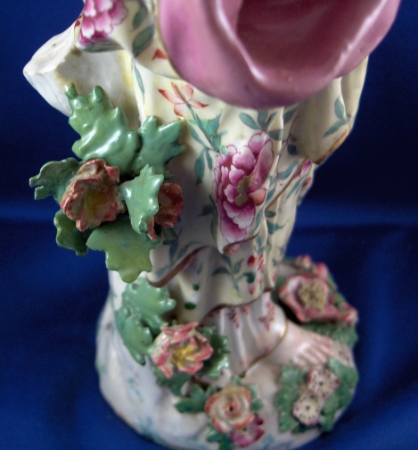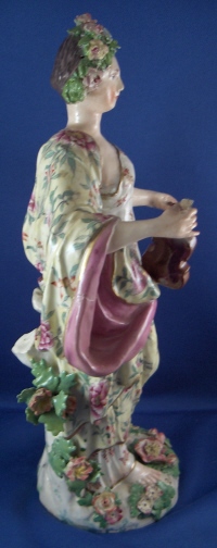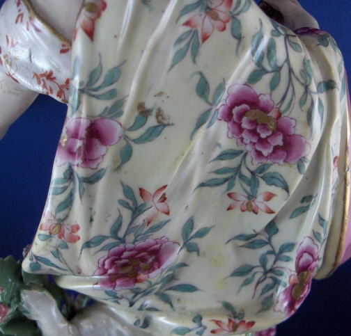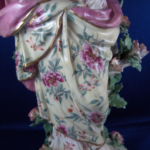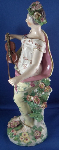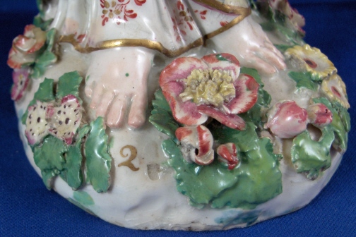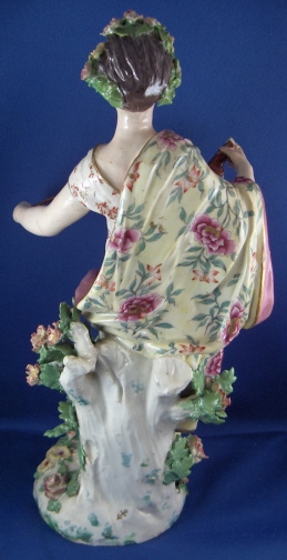 This is a figurine of a lady made by Chelsea around 1765. She is superbly modeled and painted especially the yellow ground skirt with the fancy Asian style flowers on it (peonies?). Especially nice are also the flowers on the base including the typical sunflower looking ones. She is holding a violin in her right hand and the bow in her left hand. The figurine displays nicely but is in restored condition and I cannot tell exactly how bad she is due to the overpaint job so many restorers tend to use and I never understood. The head was off I am fairly sure and the flwoers and leaves on top of the head as well as the entire back of the head is severely overpainted and been worked on. He left arm was off and the left hand as well as the right hand are replacements. The violin bow is a replacement and the violin was overpainted and the end is missing again. The leaves and flwoers of the boccage are overpainted and at least some are new but I suspect a lot are original. Some of the leaves are overpainted on the base but I don't think many if any were restored. I think they just tried to match all the colors! He left leg by the knee has been worked on as did the fold under her right arm. Sadly I cannot tell the real damage but I suspect the overpainted much more than was necessary. She is a beauty and looks very ncie on display! Some crazing to the glaze as well here and there! The figurine is marked with the gold anchor in the back and a number 2 in the front. She is just over 12 inches tall, 5.5 inches wide and 4.75 inches deep. Please email me for more information or other pictures.
