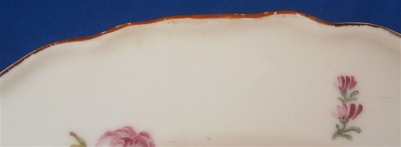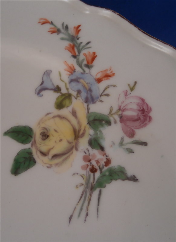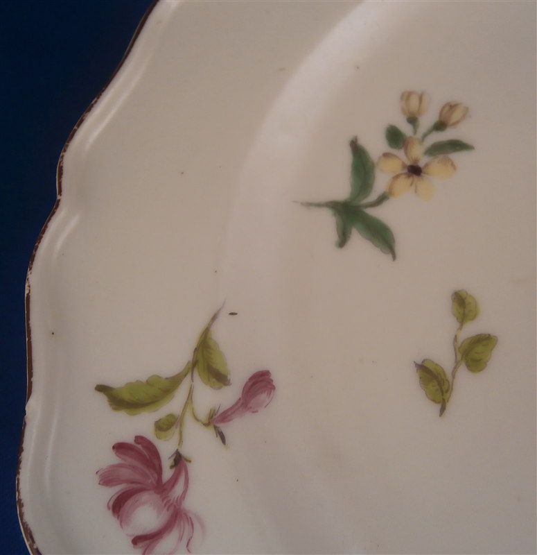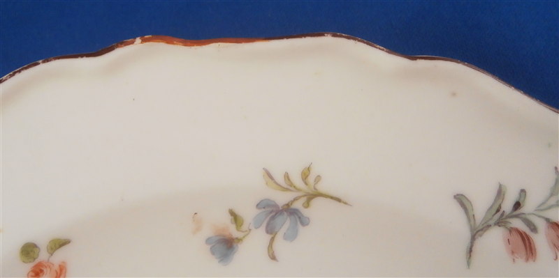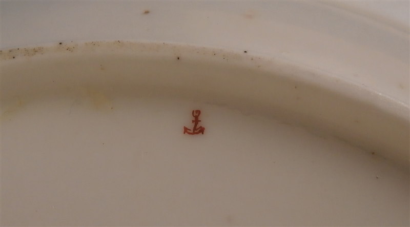 This is a plate made by Chelsea around 1754. It is made of softpaste porcelain and handpainted with a nice floral arrangement as well as some single flowers scattered throughout. The rim has a nice design to it and the edge has a brown trim. The plate is in great condition with two areas on the very edge where the brown trim is lighter than the rest of the edge. There are no major chips here but might have been tiny dings that were covered or the brown trim was worn and repainted either way nothing that takes away from the piece! There is a tiny bit of wear mostly to one spot in the floral arrangment. Chelsea porcelain is hard to find for sure! The piece is marked with the tiny red anchor underneath as shown and it has the three typical spur marks on the back from firing and the moons when you shine a light through it. It is 1.125 inches tall and has a diameter of 8.625 inches. Please email me for more information or other pictures.