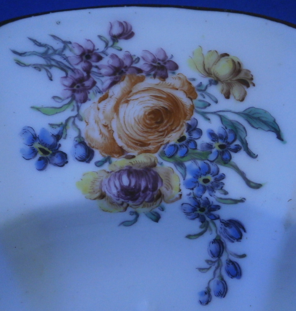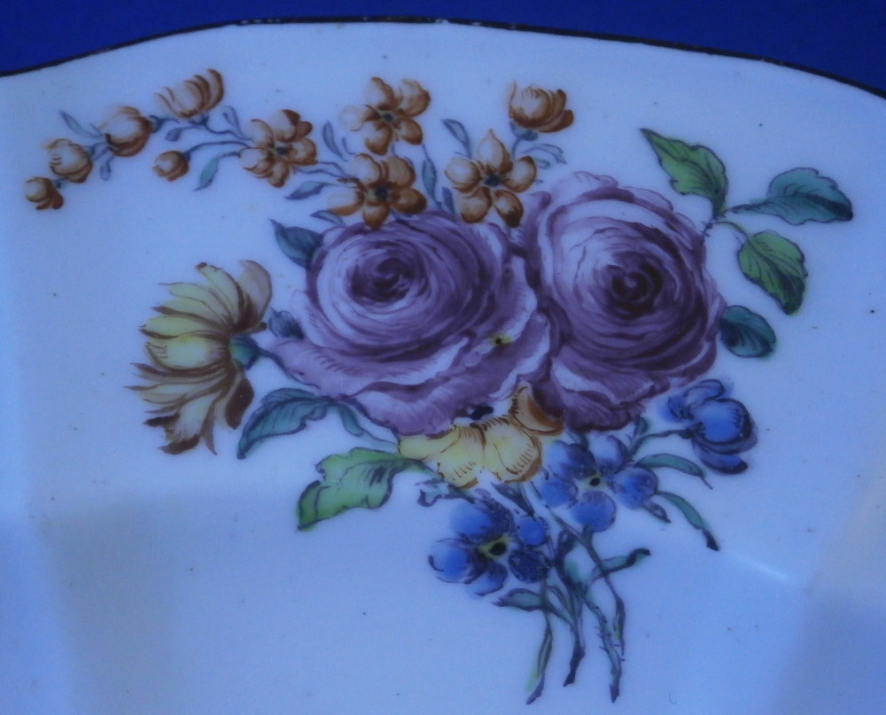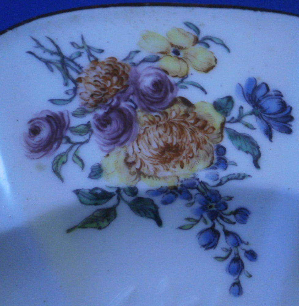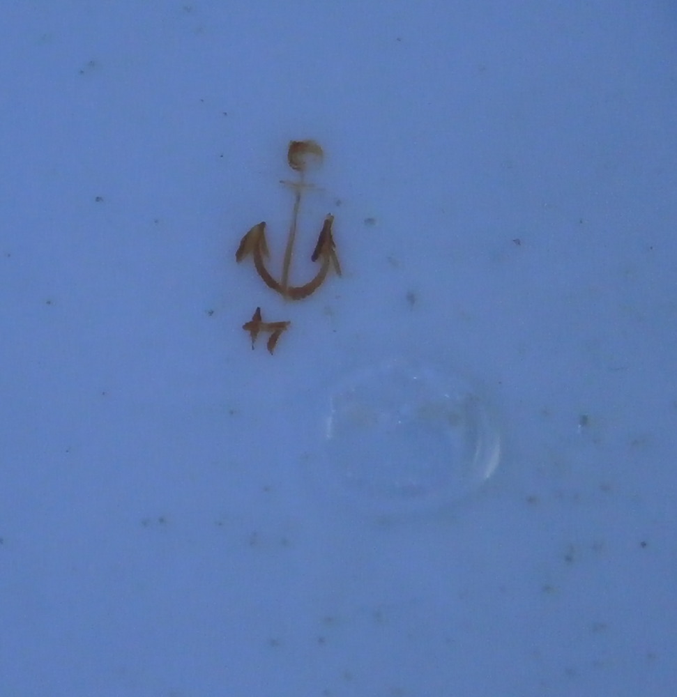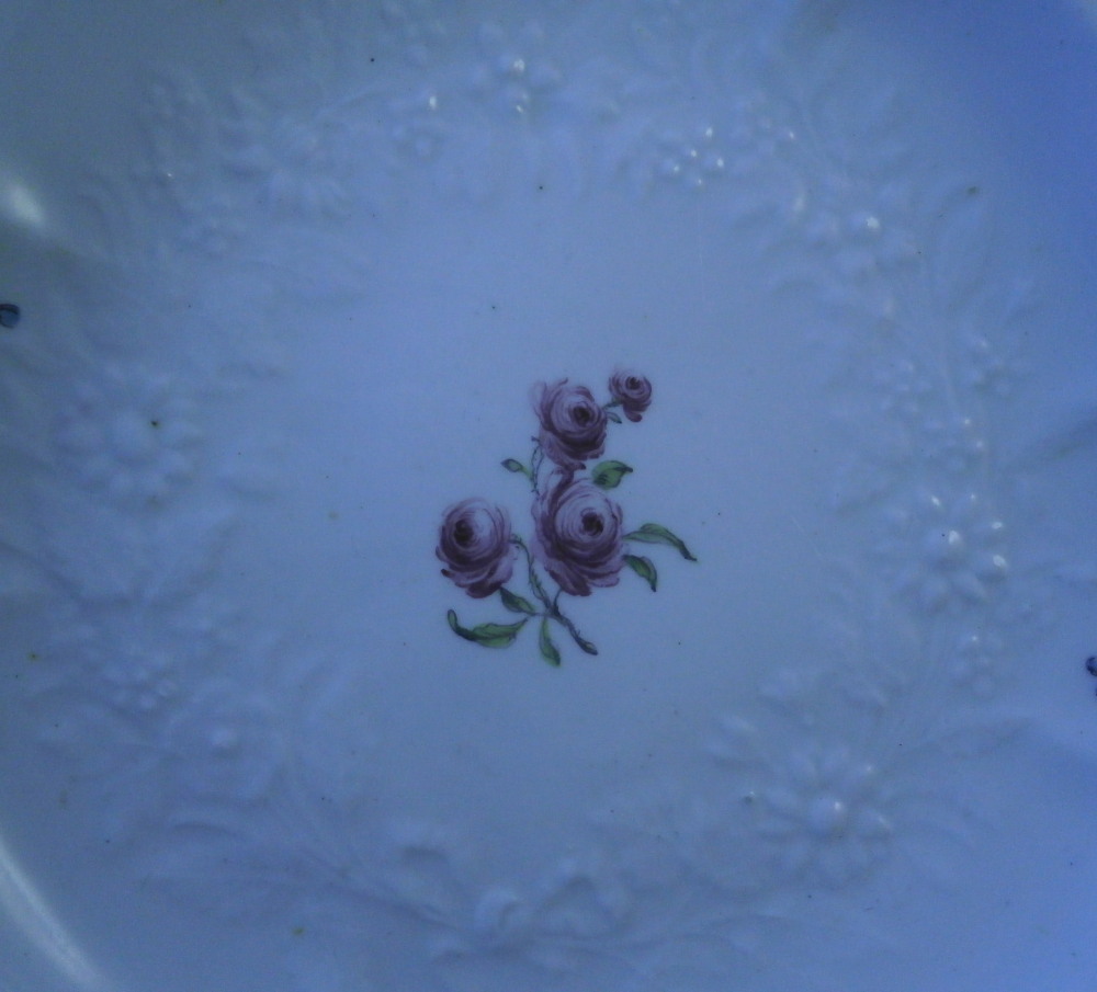 This is a rare plate made by Chelsea around 1755. It is made of soft paste porcelain and hand painted with four nice floral arrangements along the rim with the spaces between them having a relief floral design to the paste. The center has a single rose to it with multiple blossoms and there is another relief design around the outer well. The porcelain has a nice shape to it and the rim has their typical brown trim to it. Very reminiscent of the Gotzkovsky design made by Meissen. The softpaste combo with their enamel is stunning and dare I say nicer than the German original :) A really nice looking plate. This piece is extremely well done and in pretty much the same condition as the day it was made. No chips, etc. and only very minor wear to the brown trim and a chip to the foot ring that is glazed and from when it was made. A couple of small firing spots as is normal to their early wares. A really nice example! The dish is marked with their red anchor mark as well as a number 4 as shown. Likely a pattern mark rather than a painter's mark. It also has the typical spur marks on the back from firing and the moons when you shine a light through it. The piece is 1.125 inches tall and just over 9.125 inches in diameter. Please email me for more information or other pictures.