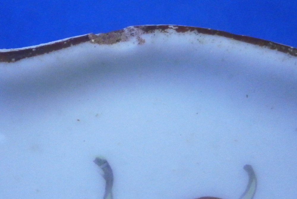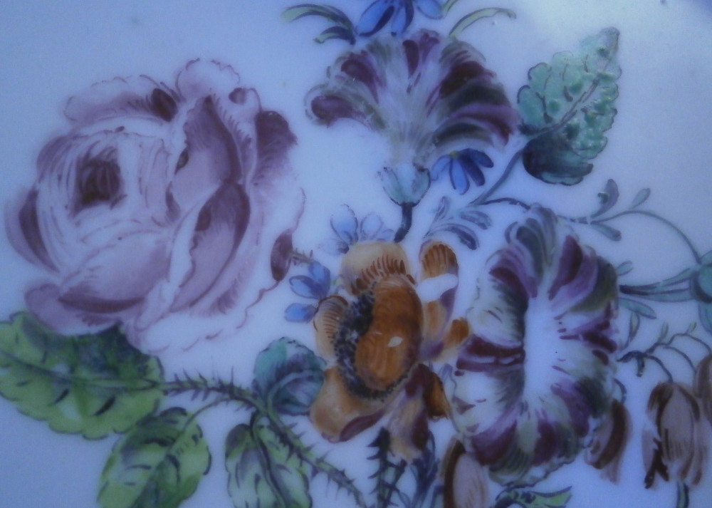 This is a nice plate made by Chelsea around 1755. It is made of soft paste porcelain and that combination with their amazing polychrome enamels is just stunning. The piece is hand painted with a large floral arrangement to one sides with the rest of the plate filled in with fours larger and three smaller flowers. Nicely shaped edge with their typical brown trim to it. The plate is in good condition with some small chips along the very edge painted in to hide them perfectly. Only one is slightl larger and is visible when on display but does not take away from the piece. All chips are shown. A bit of stacking wear to the large arrangement and more visibly to the flower opposite of it as shown. Chelsea porcelain is hard to find for sure! The piece is marked with the tiny red anchor underneath as shown and it has the three typical spur marks on the back from firing and the moons when you shine a light through it. It is 1.125 inches tall and has a diameter of 8.75 inches. Please email me for more information or other pictures.