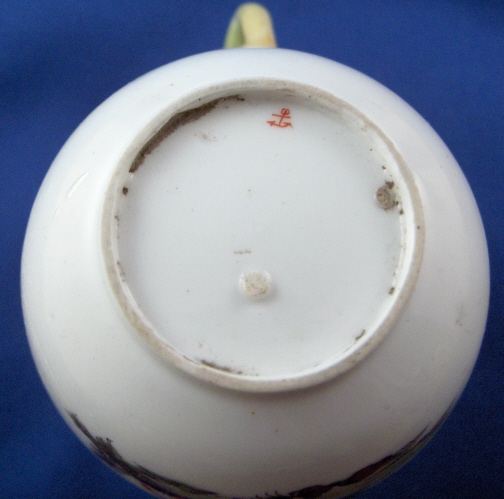 This is a very rare cup made by Chelsea in about 1754. It is made of softpaste porcelain and handpainted with a really nice scene of two putto in a landscape surrounding as well as a bug of some sort, some tiny birds and a very nice branch handle with raised leaves and flowers next to it. Brown trim to the top rim. The cup is in not so hot condition but it was still a must have example for me. It has a large chip to the top rim, a small chip, wear to the brown trim and a large chunk was broken out of the cup and perfectly reglued. The piece is marked with the red anchor mark and has the three spur marks from firing. The cup is 2.5 inches tall and 2.5 inches in diameter. Please email me for more information or other pictures.