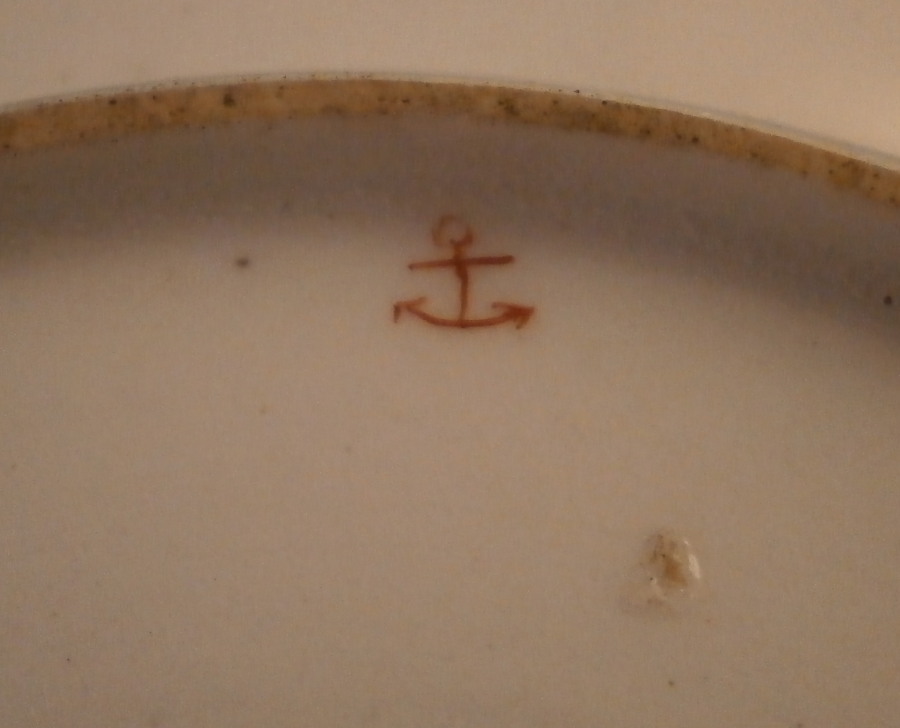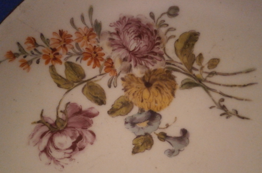This is a saucer made by Chelsea in the mid 18th century. It is made of softpaste porcelain and hand painted with a nice floral arrangement as well as lots of single flowers scattered throughout. The edge has the typical brown trim to it. The flowers are in the German style which is superb. Looks very much like a Meissen saucer from the same period!The piece is in great condition with some minor use and wear marks. It displays perfectly. The piece is marked with the tiny red anchor along the foot ring underneath as shown and it has the three typical spur marks on the back from firing. The saucer is 0.875 inches tall and has a diameter of 5 inches. Please email me for more information or other pictures.