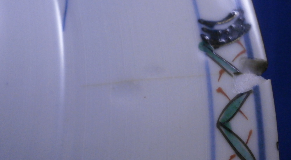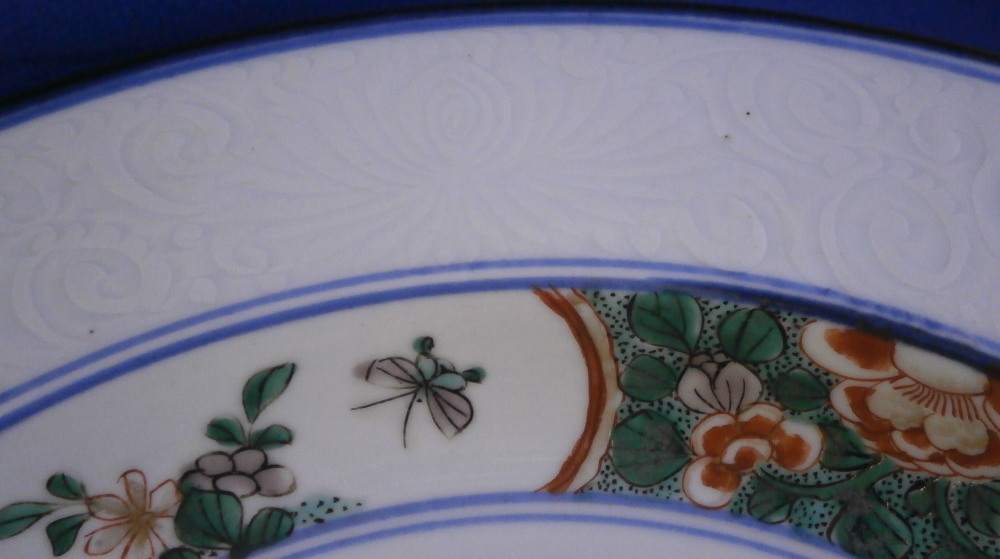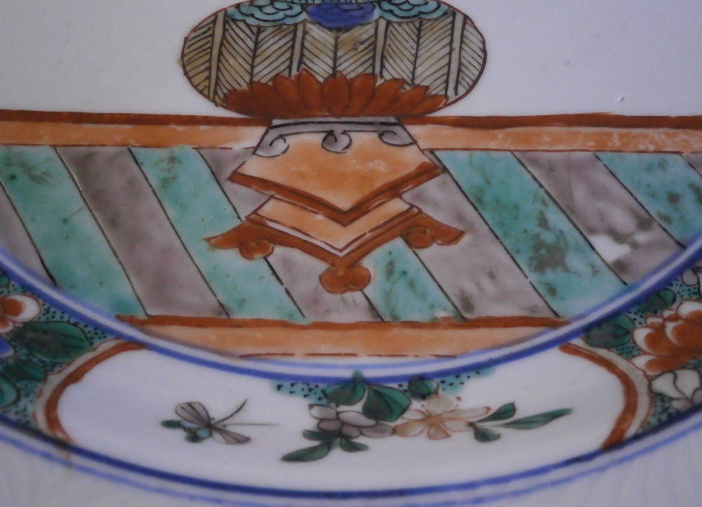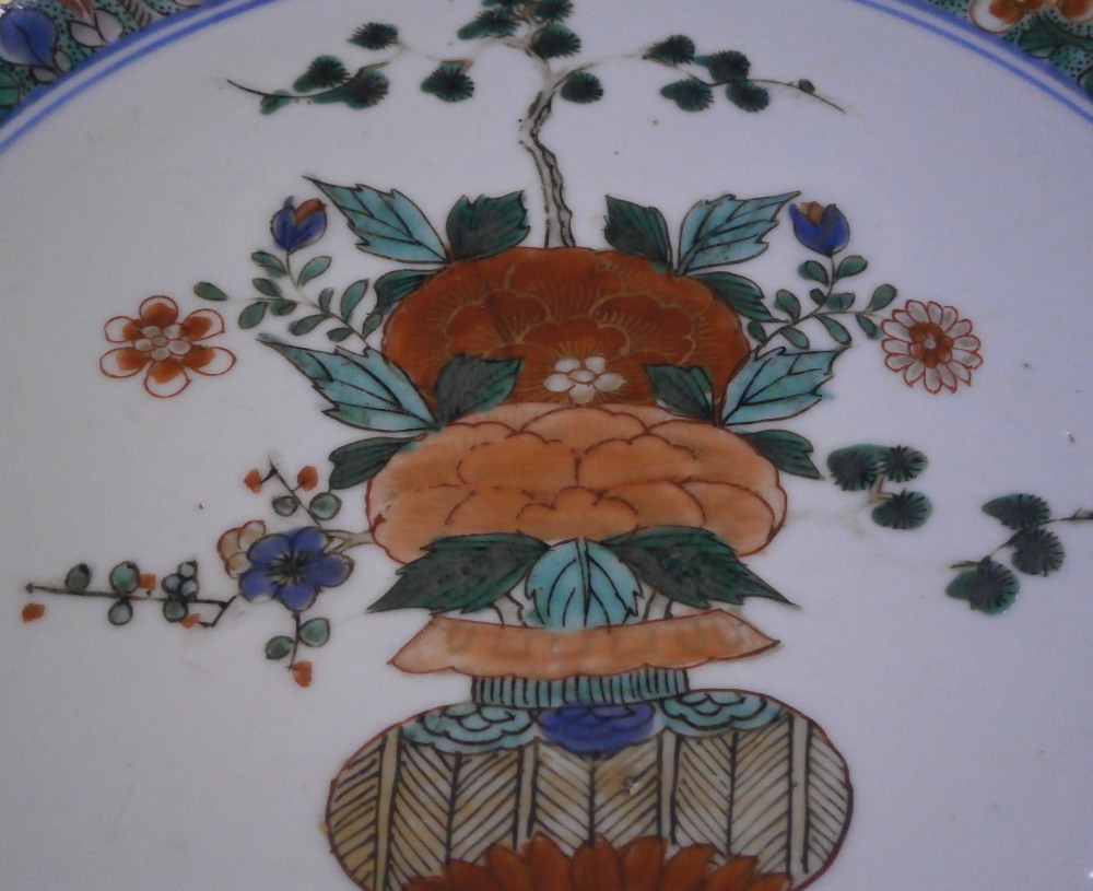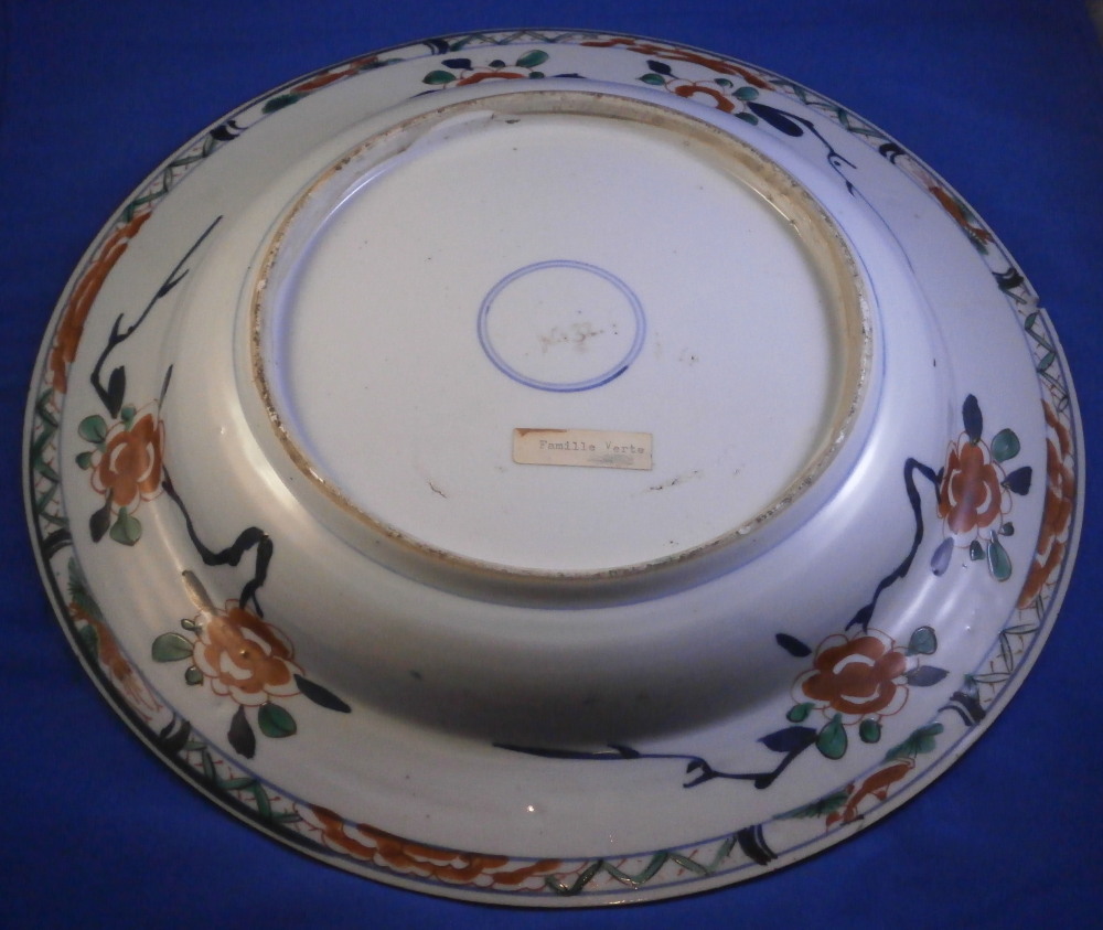 This is a superb large deep plate / charger / serving dish made in China in the early 18th century - around 1720 or maybe a touch earlier. In Asian porcelain dating it is Jingdezhen , Qing dynasty (1644 - 1911), Kangxi period (1662 - 1722). The piece is hand painted with a famille verte design of double lines in under glaze blue along the edges of the rim as well as the well, a lotus blossom design in relief to the rim (I tried to show that but it didn't come out too great), a polychrome central design of a vase filled with flowers sitting on a small table and a polychrome design between the well of the plate and the rim of flowers and little cartouches of flowers and an insect. Brown trim to the very edge of the plate. There is even a polychrome design to the udnerside rim as shown. How cool is that! Really a nice looking piece! What makes it extra special is the fact that it once belonged to the collection of August the Strong one of the most powerful rulers in German history and the guy behind the start of the Meissen porcelain factory. The plate is in good condition but not perfect - it does have a small rim chip as shown from which a hairline goes into the rim about 1.5 inches long. It is stable and could be restored perfectly but does display really well the way it is. The piece is not marked underneath which is common on Chinese porcelain from this period but does have the incised Johanneum number as shown. N.132 over I (The I is for famille verte pieces and the number is correct for this design). The dish is 1.75 inches tall and has a diameter of 12.875 inches so rather large. It also has an old museum ID underneath that is only visible when held at a proper angle to the light. It looks to be S0413 RJGLA or something along those lines. Please email me for more information or other pictures.