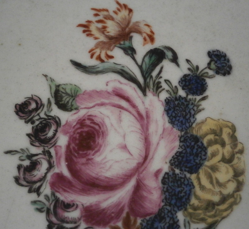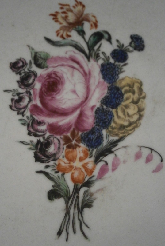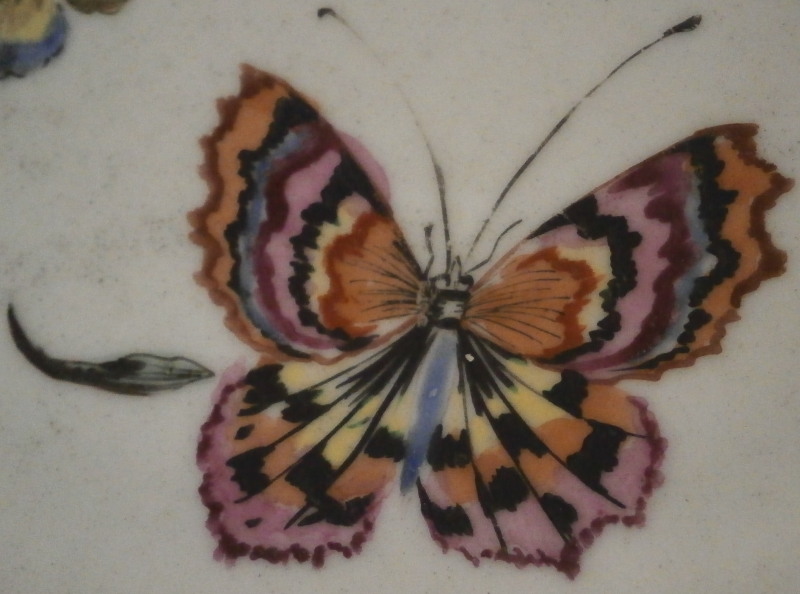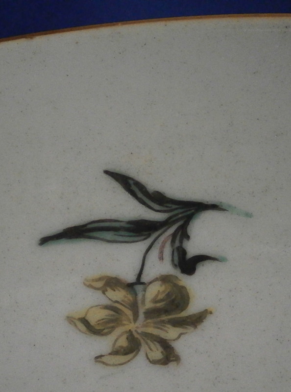 This is an interesting deep dish made in CHina and decorated in England in the mid 18th century. It once belonged to the Bernard Watney collection and was then sold about 20 years ago by an auction house as having been painted in West Pans (the factory that came after Longton Hall). A much more likely option seems to be that is was painted by James Giles either senior or junior. I ahve no way of figuring out which one it was or even if there is a way to tell them apart. Either way it is a superb plate / dish that is hand painted with some a really nice floral arrangement as well as single flowers ad some bugs of which the butterfly is just amazing! The glaze has that nice blue tinge to it which is hard to find and much nicer than jsut plain white. The edge has a light brown trim to it and there is some evidence left that it was gilded over. The saucer dish is in great condition with the gold edge trim mostly gone, a little wear to the painting - mainly on the one bug and a tight hairline to the rim as shown. So tight that the piece still rings nicely. The piece is not marked underneath but definitely Chinese Export that was painted in England / London . It was a must have for me since I did not own anything like it yet. The piece is 1.5 inches tall and 8.625 inches in diameter. Please email me for more information or other pictures.