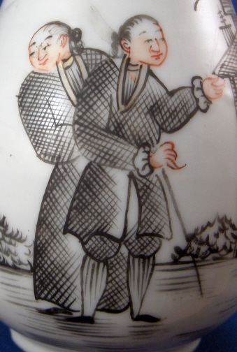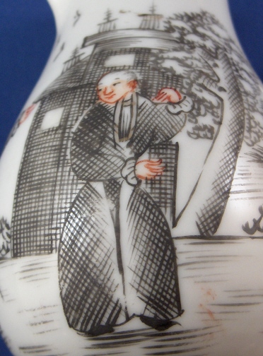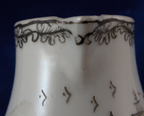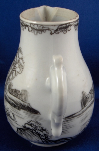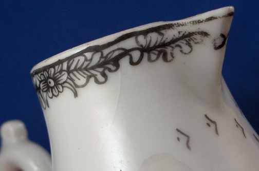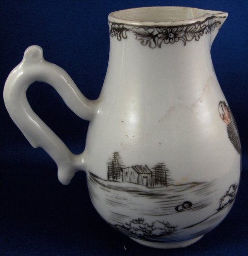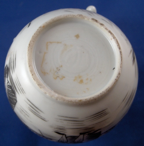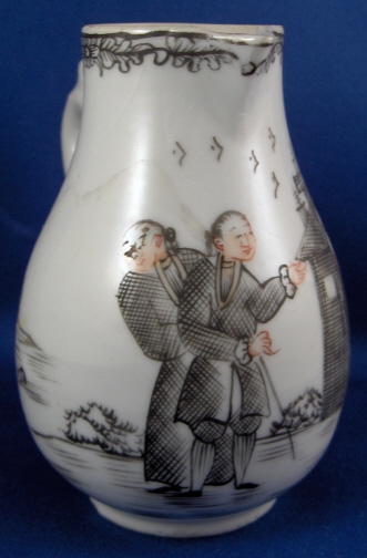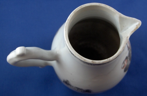 This is a creamer made in China around in the 18th century. It is handpainted with what is called en grisaille European inspired scenes which are mostly in black tones with flesh colors to the faces and hands. Really a nice piece and not easy to find these days! The creamer is in good condition with a hairline to the left side top looking at the spout and a chip that never quite was a chip on the spout where it got knocked at some point. The pot is unmarked which is normal. It might have had a lid at some point though that is not for sure. It is 4.25 inches tall, 4.25 inches including the handle and 2.75 inches wide. Please email me for more information or other pictures.