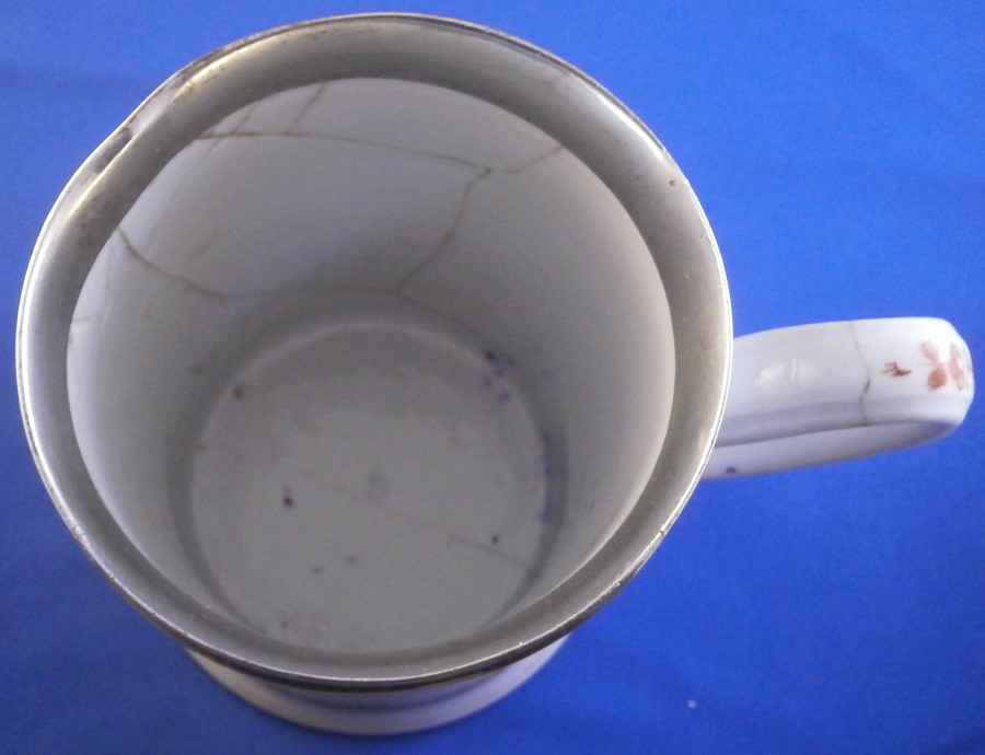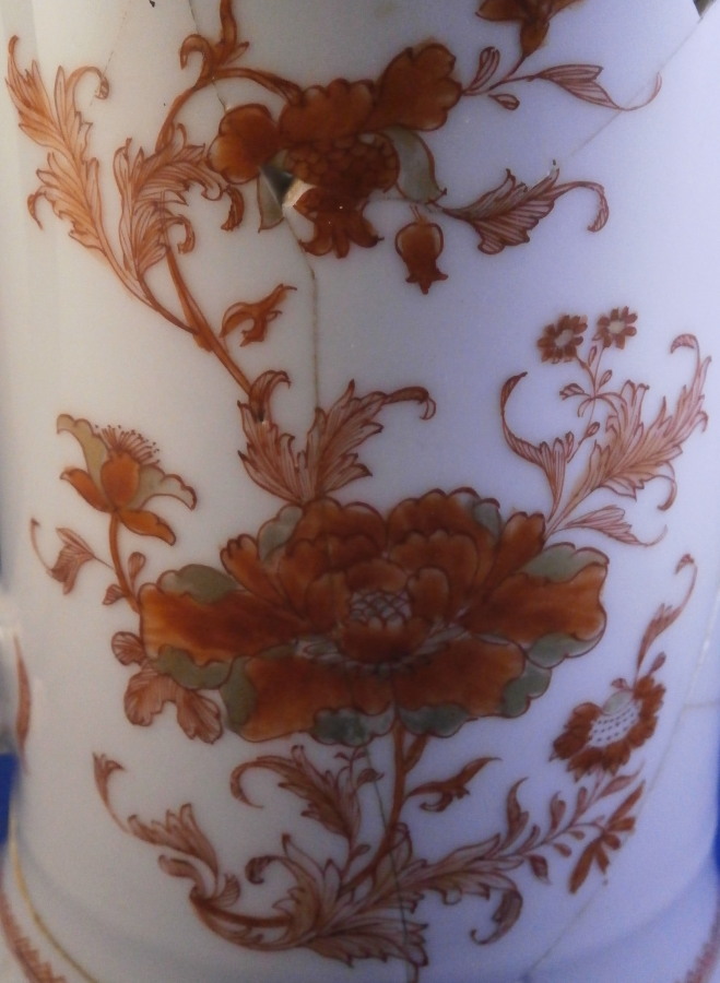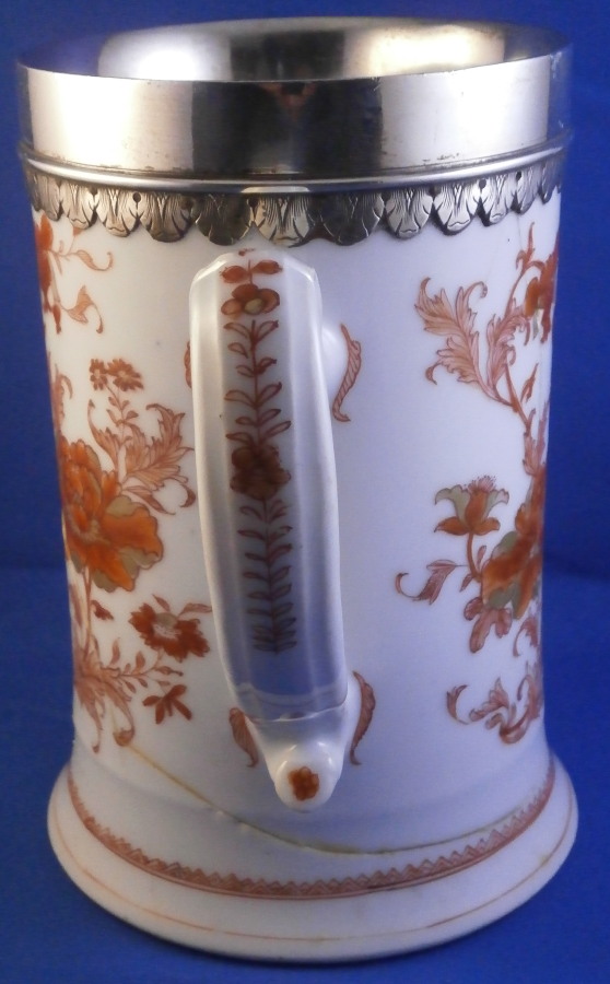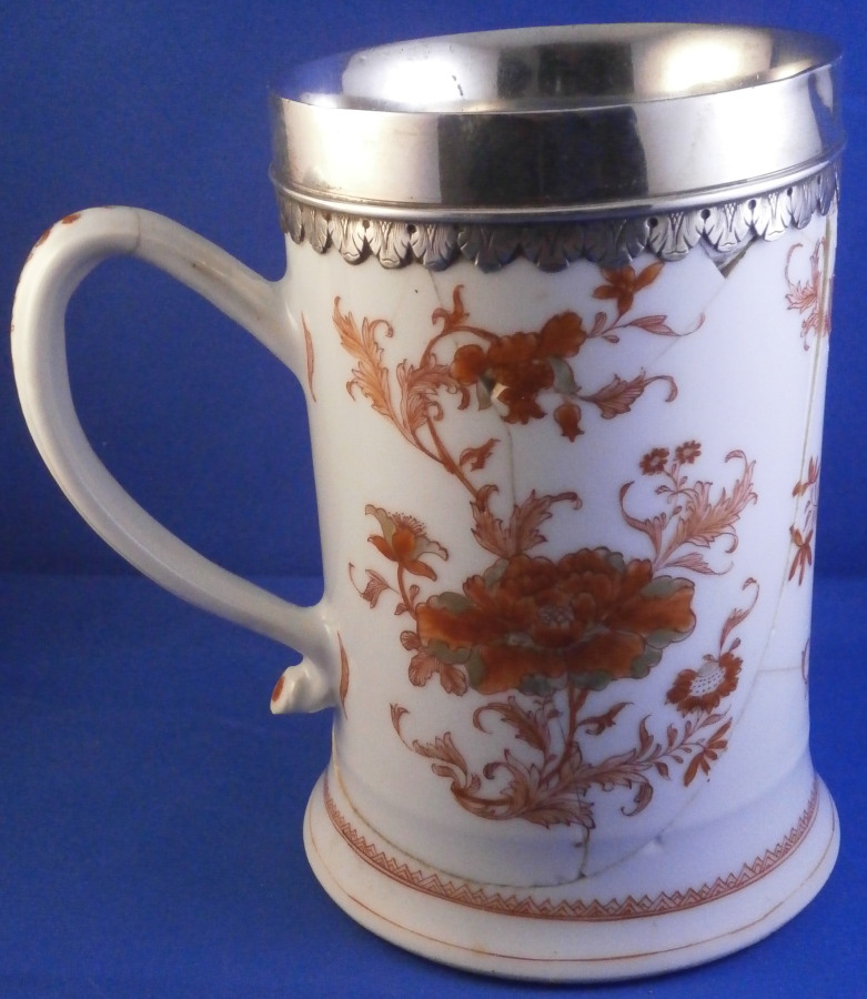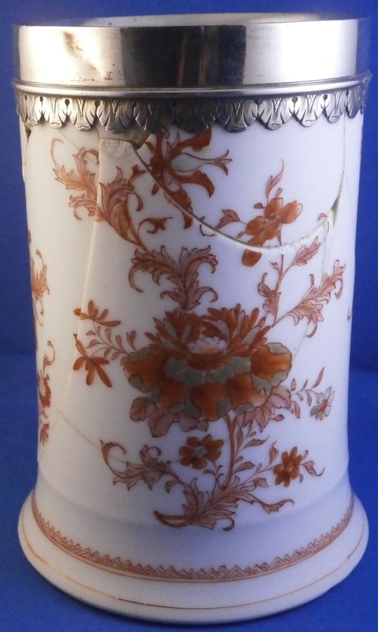 This is a large tankard made in China  during the Chinese Kangxi period ( 1661 - 1722 ). It is definitely a very early piece and possibly earlier than any European porcelain. I bought it because I wanted to see the similarities between this and the Vienna DuPaquier period porcelain I like so much. The paste has that same milkglass type look to it and the decoration is really similar in terms of how they did the leaves and that red trim along the bottom. These pieces must have been what influenced them early on! So it was a learning piece for me which is important since the books only get you so far. The tankard has a thick sterling silver trim to the top and must have fallen at some point as you can see a big dent in it and the porcelain has cracked into a ton of pieces from there. It was held together by the silver though and that is probably the only reason it has made it this long. It's still a great looking piece with the iron red and gold flowers hand painted all around with some red trim along the bottom and handle. It's worthy of being restored but I don't usually do that sort of thing so I will leave the choice to its new owner. I added a pic of one in good condition to the end of the listing. The stein is 6.75 inches tall with a bottom diameter of 4.75 inches. Unmarked as is the norm. Damaged as per pictures. Please email me for more information or other pictures.