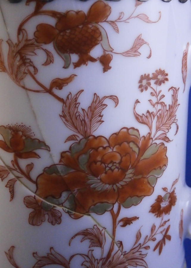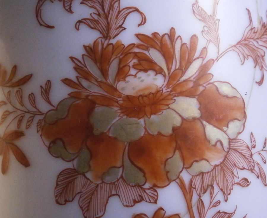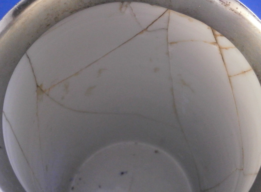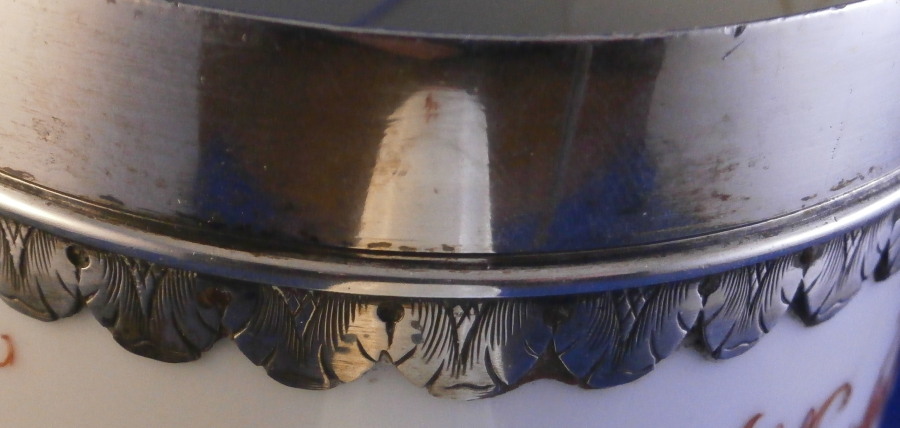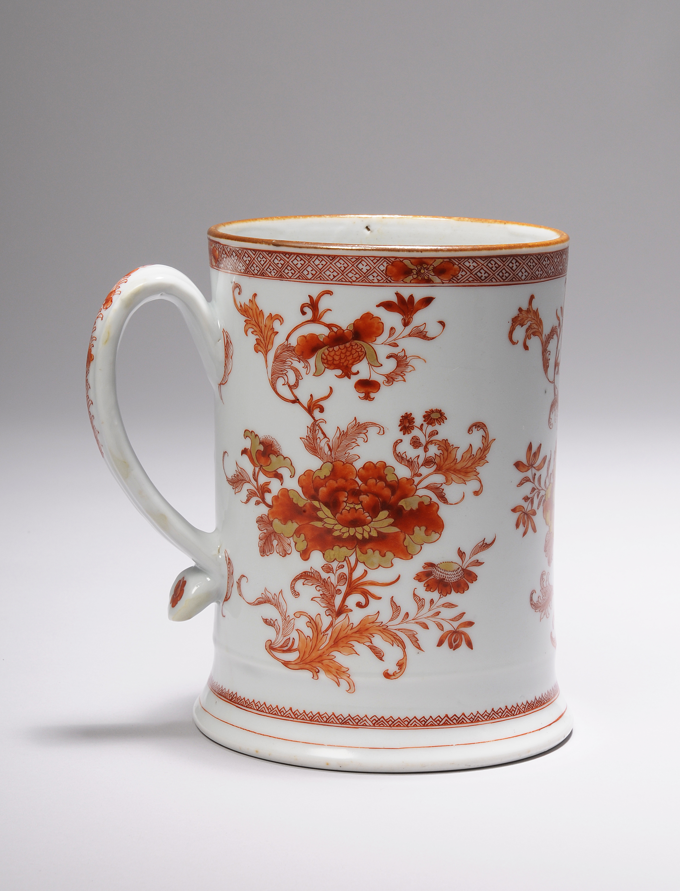 This is a large tankard made in China  during the Chinese Kangxi period ( 1661 - 1722 ). It is definitely a very early piece and possibly earlier than any European porcelain. I bought it because I wanted to see the similarities between this and the Vienna DuPaquier period porcelain I like so much. The paste has that same milkglass type look to it and the decoration is really similar in terms of how they did the leaves and that red trim along the bottom. These pieces must have been what influenced them early on! So it was a learning piece for me which is important since the books only get you so far. The tankard has a thick sterling silver trim to the top and must have fallen at some point as you can see a big dent in it and the porcelain has cracked into a ton of pieces from there. It was held together by the silver though and that is probably the only reason it has made it this long. It's still a great looking piece with the iron red and gold flowers hand painted all around with some red trim along the bottom and handle. It's worthy of being restored but I don't usually do that sort of thing so I will leave the choice to its new owner. I added a pic of one in good condition to the end of the listing. The stein is 6.75 inches tall with a bottom diameter of 4.75 inches. Unmarked as is the norm. Damaged as per pictures. Please email me for more information or other pictures.