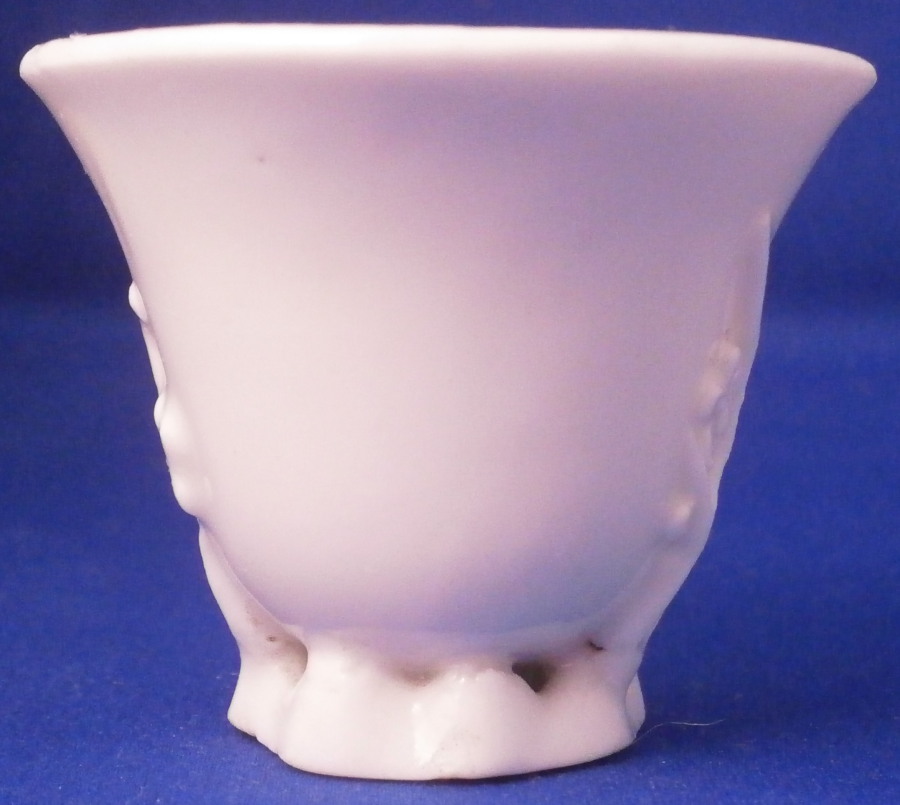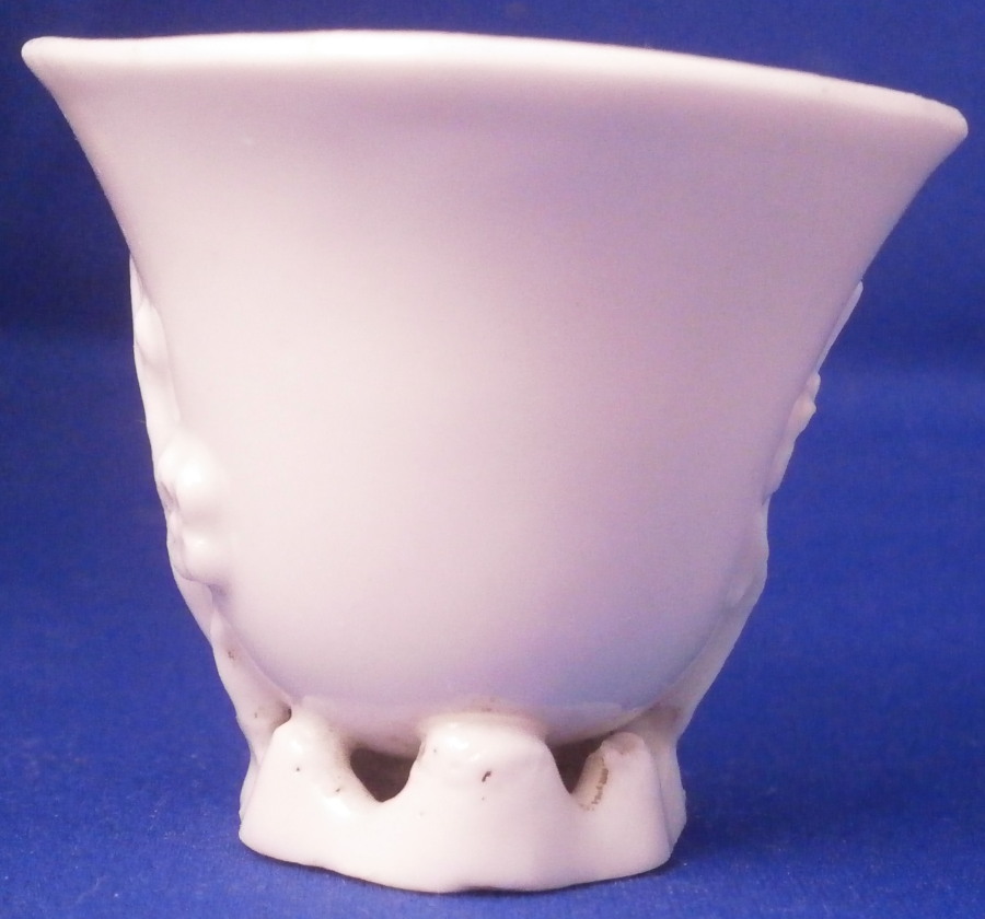 This is a blanc de Chine libation cup made in China in the 18th century or possibly a bit earlier . Libation cups were communal drinking vessels that were used on important ceremonial occasions. The piece is decorated with a prunus blossom relief decoration on the front and back and ahs a nice base. The quality of the porcelain is very nice and white. The cup is in perfect condition with some minor manufacturing flaws - tiny black spots but not many. These are normal on early porcelain! The cup is 1.75 inches tall, just under 2.625 inches wide and just under 2.25 inches deep. It is unmarked which is the norm! Please email me for more information or other pictures.