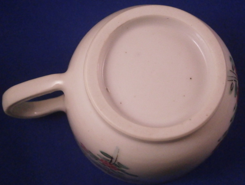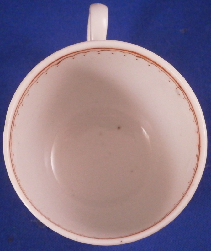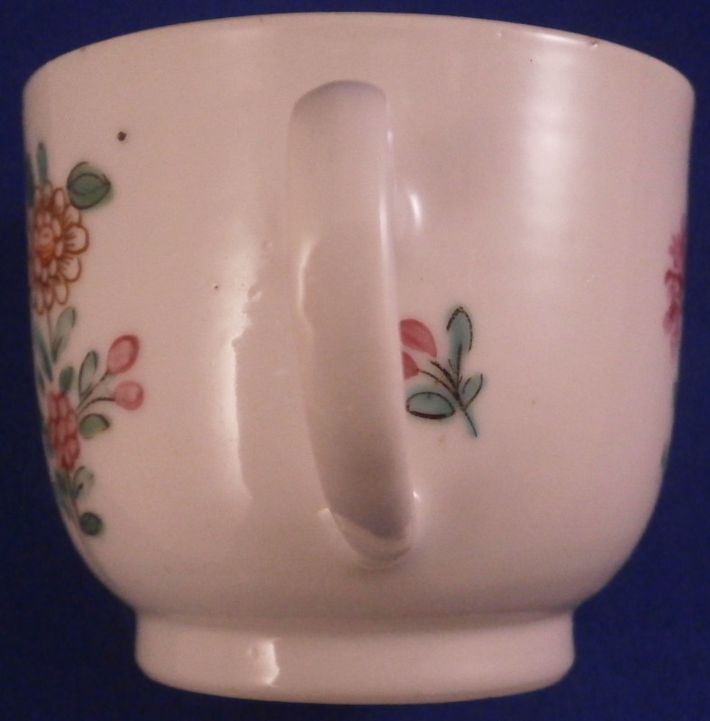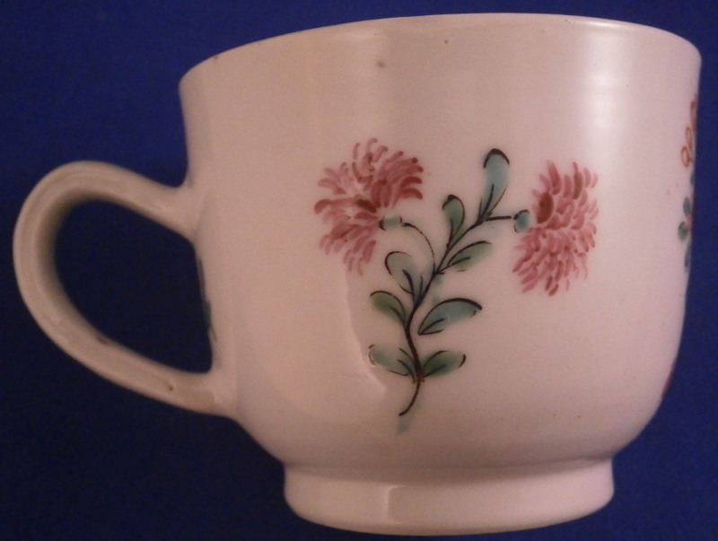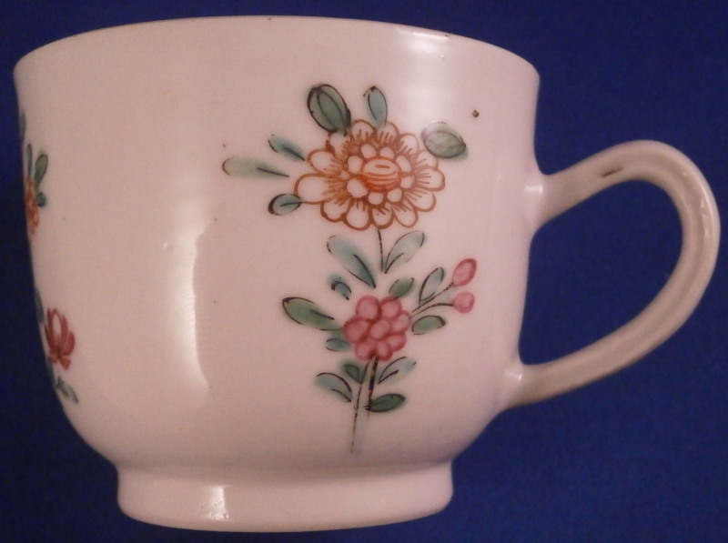 This is a cup made in China in the late 18th century. It is nicely hand painted with a floral arrangement to the front as well as two smaller flowers to the sides and a red trim to the inside edge. Very much trying to copy the English Lowestoft or Liverpool area style except the handle shape does not work. It has a groove to either side which I ahve never seen in English porcelain. Still a fun example and in great condition with some very minor firing flaws like black spots. The cup is 2 inches tall and 2.375 inches in diameter. It is unmarked which is the norm! Please email me for more information or other pictures.