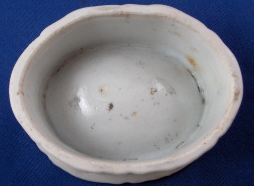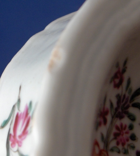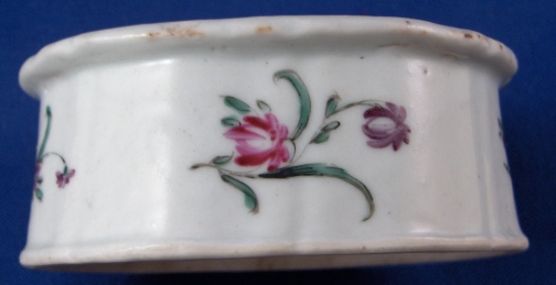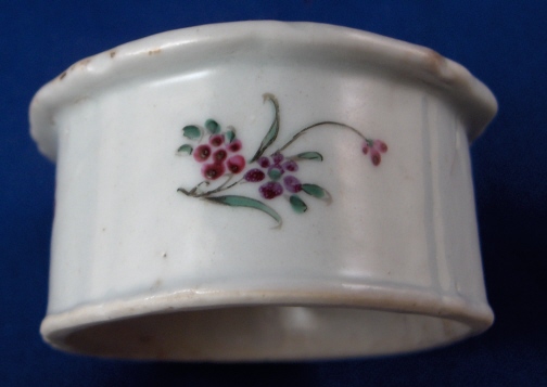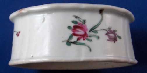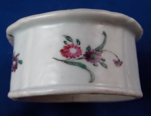 This is a porcelain salt dish made in China for export in the 18th century. Not something I have seen before in this shape as it is more typical for Europe which it was most likely made for. The dish has a nice shape to it being oval with relief rings to the top and is handpainted with a nice floral arrangement as well as a single flower on top and four flowers on the sides. The piece is in superb condition with one small chip to the top edge as well as some firing issues like a firing crack and small black marks but they don't take away from the overall look at all. The salt dish is not marked underneath but that is normal for this type of ware. It is 1.375 inches tall, 3.375 inches wide and about 2.75 inches deep. Please email me for more information or other pictures.