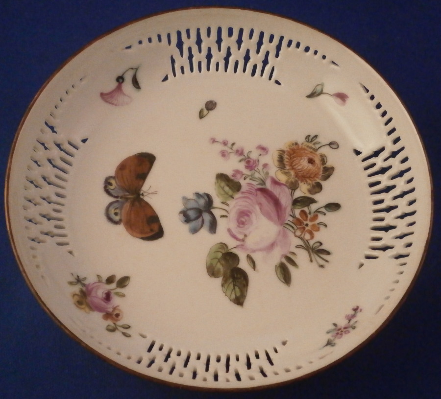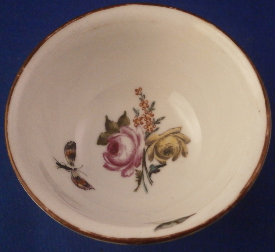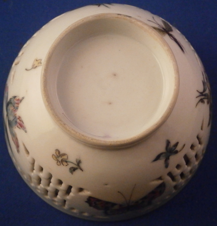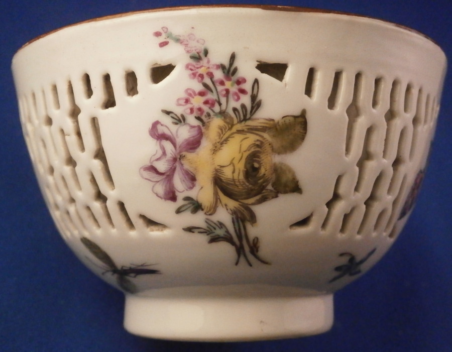 This is a really nice and interesting cup and saucer made in China most likely during the Yongzheng period (1722-1735) but possibly early Qianlong (1735-1796) and decorated in London , England in the mid 18th century most likely by the James Giles studio. The decoration is typical for the work of his studio. floral arrangement style and single flowers as well. The Chinese double - walled reticulated cup and reticulated saucer are rare and superb enough to find but I ahve never come across an example decorated by Giles though I am sure others exist. The cup is hand painted with a superb floral arrangement as well as a bug to the inside bottom with a small single flower covering a paste flaw along the top rim. The outside has two more flower arrangements as well as a nice single flower and a large butterfly in the panels between the reticulated areas and three small flowers and another bug along the bottom near the foot. Brown trim to the edge. The saucer is a single layer with reticulated panels, a small flower arrangement and three small flwoers between them and a large arrangement in the center with a tiny flower and butterly. Same brown trim to the edge. The cup is slightly better in terms of quality of the decoration than the saucer so Giles himself might have done that one. Either way a really nice tea bowl and saucer set. Really nice quality porcelain with a rare design and some superb decoration! The set is in great condition with the cup having just a touch of wear to the brown trim and the saucer has an area along the edge with two hairlines or firing lines. At least one was worked on when this was made not sure about the other one but they are hard to spot and stable. They display perfectly and superbly! The set is not marked underneath but that is normal for this period and maker. The saucer is 1.25 inches tall and 5.5 inches in diameter and the cup is 2.125 inches tall and 3.625 inches in diameter. Please email me for more information or other pictures.