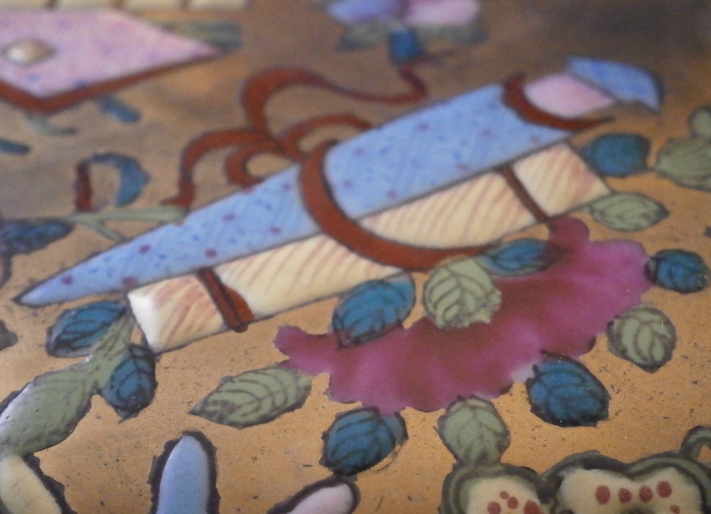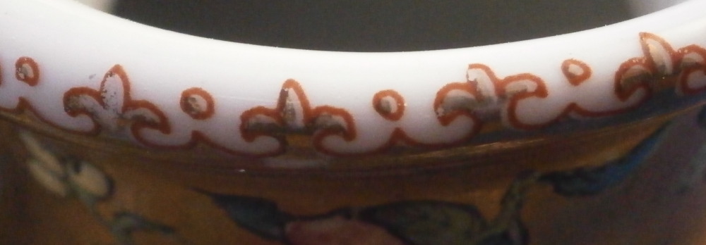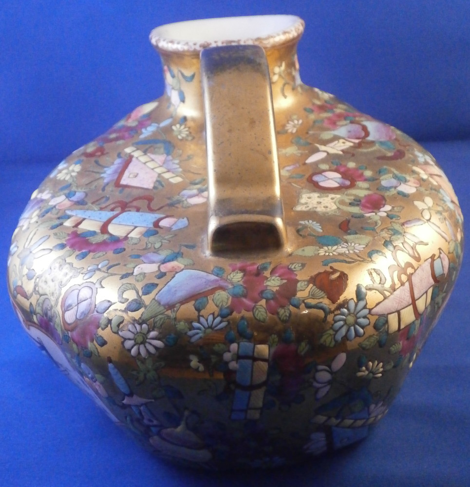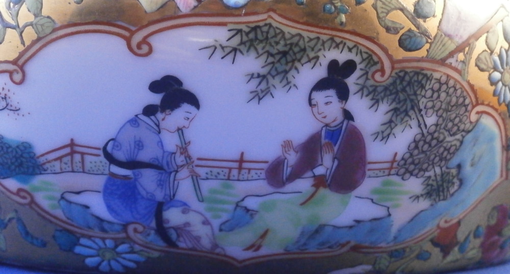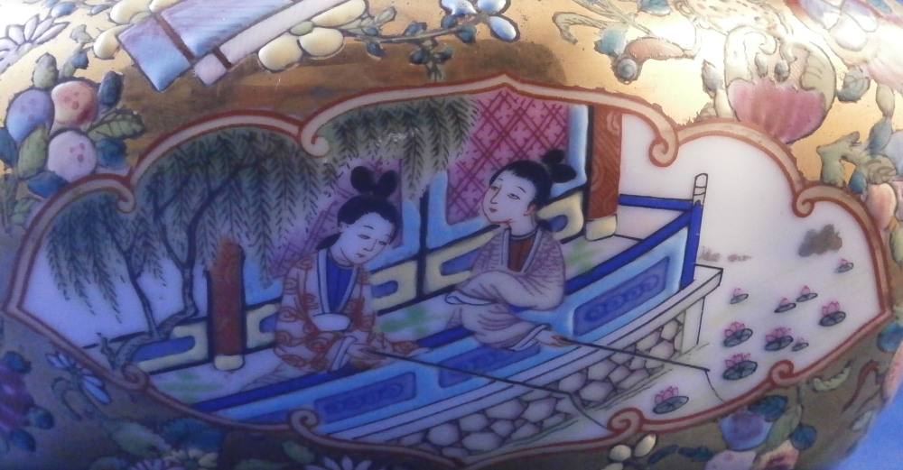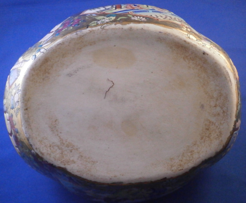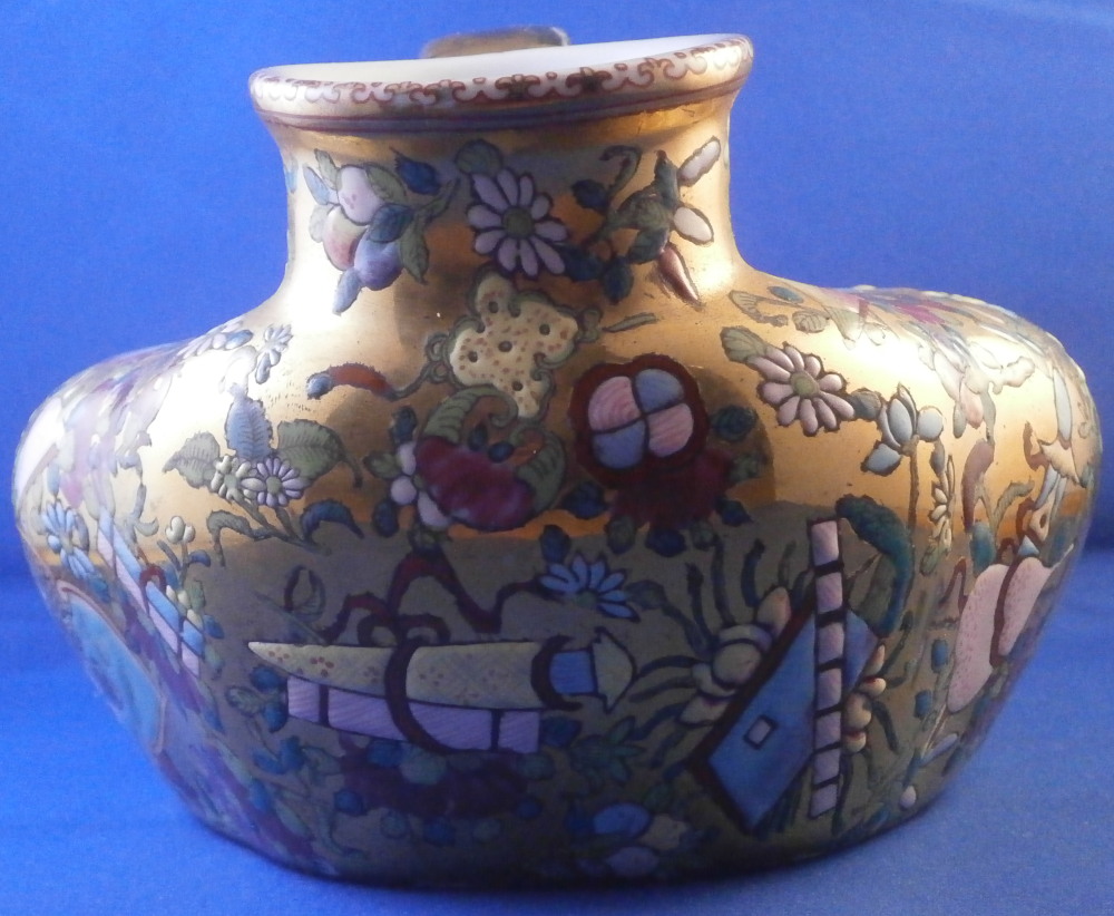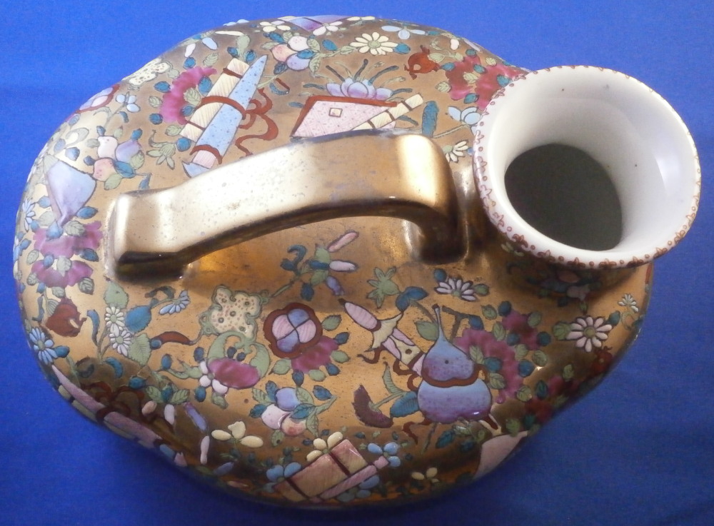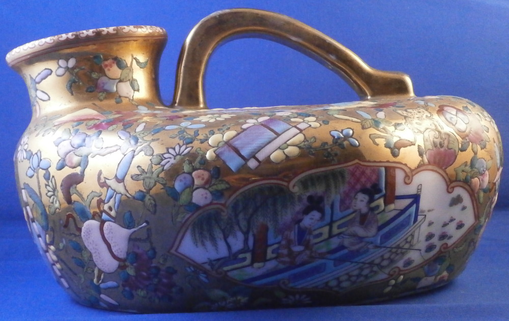 This is an interesting item made in China around the mid 19th century. The few times I have seen these they wre always described as a urinal but I think it's better to say it is a chamberpot or bourdaloue type pot. The piece is hand painted with two nice scenes - one to either side. One includes two ladies fishing while the other has one lady playing the flute with her friend listerning and clapping. The rest of the pot has lots of raised enamel flowers and designs to it as well as fruits and flowers. This type of raised enamel decoration must have been the original that Bayeux in France copied their early pieces from. Interesting to see that and it happens to be one of my favorite makers. The opening has a typical red and gold trim design to it and it comes with a handle to carry it which is fully gilded. A heavy item due to the thick porcelain since you really didn't want this to break while full :) The pot is in great condition with some very minor wear to the gilding and a small firing flaw to the underside. The piece is unmarked which is normal. It is about 4.5 inches tall, 6.75 inches wide and 8.25 inches long. Not an easy to find item. Please email me for more information or other pictures.