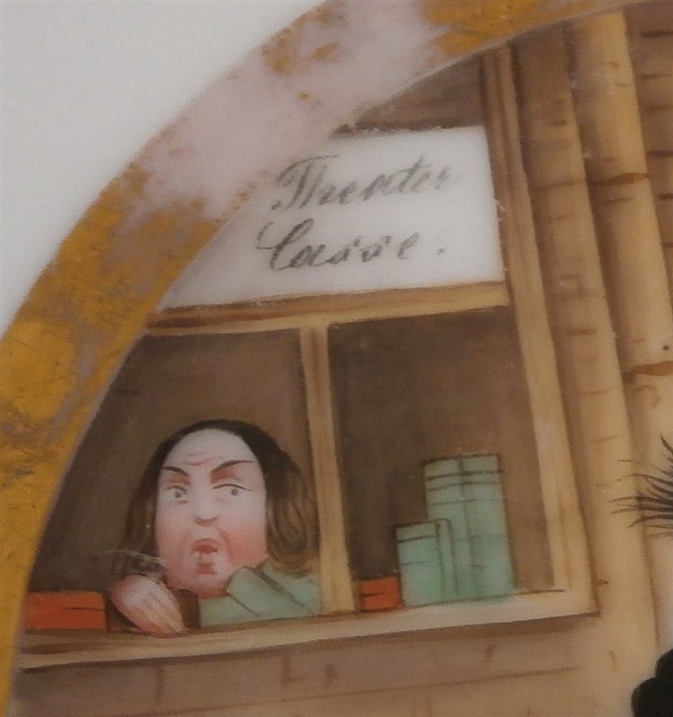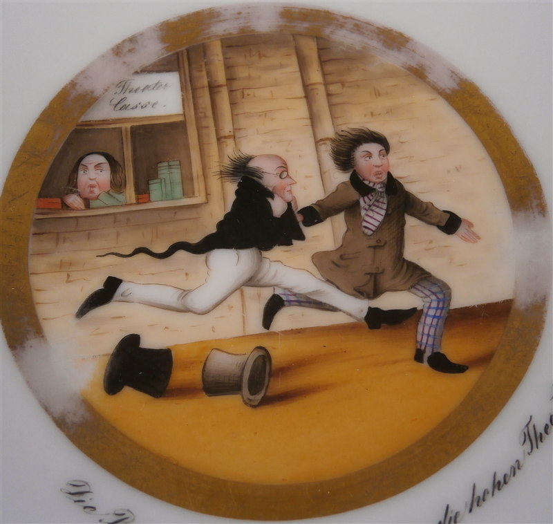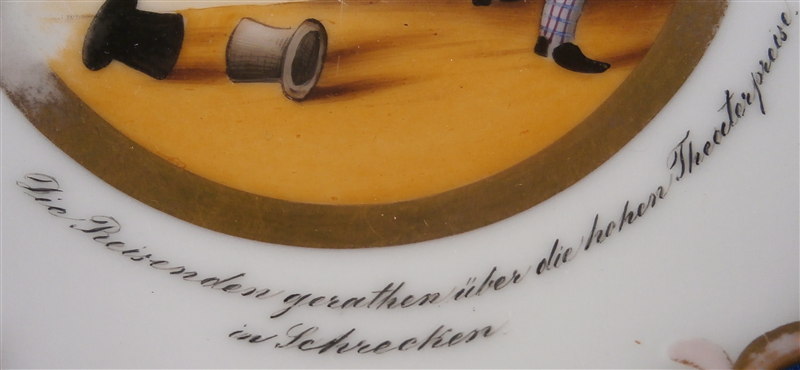 This is a funny porcelain plate made by Chodau ( Chodov ) around 1843. The maker was founded in 1811 by Franz Miessl in Dolní Chodov which is part of the Czech Republic now but was part of the Austrian Empire back then. The plate has a funny scene in the center of two people running away from a Theater Entrance. The writing underneath the scene states "Die Reisenden geraten ueber die hohen Theaterpreise ins Schrecken" which means the travellers were scared by the high theater prices. I guess the prices of shows increased a lot during this period or who knows. The little plate is in great condition with wear to the gilding as shown. It is is marked underneath with the impressed CHODAUER mark as well as an incised VI mark. The piece has a diameter of about 5.25 inches. Please email me for more information or photos.