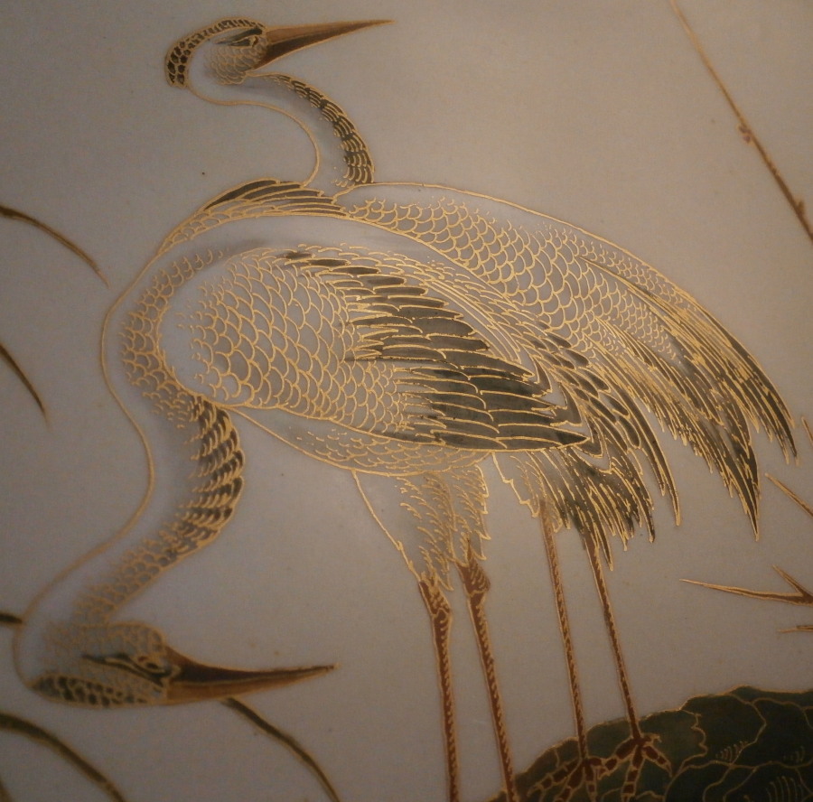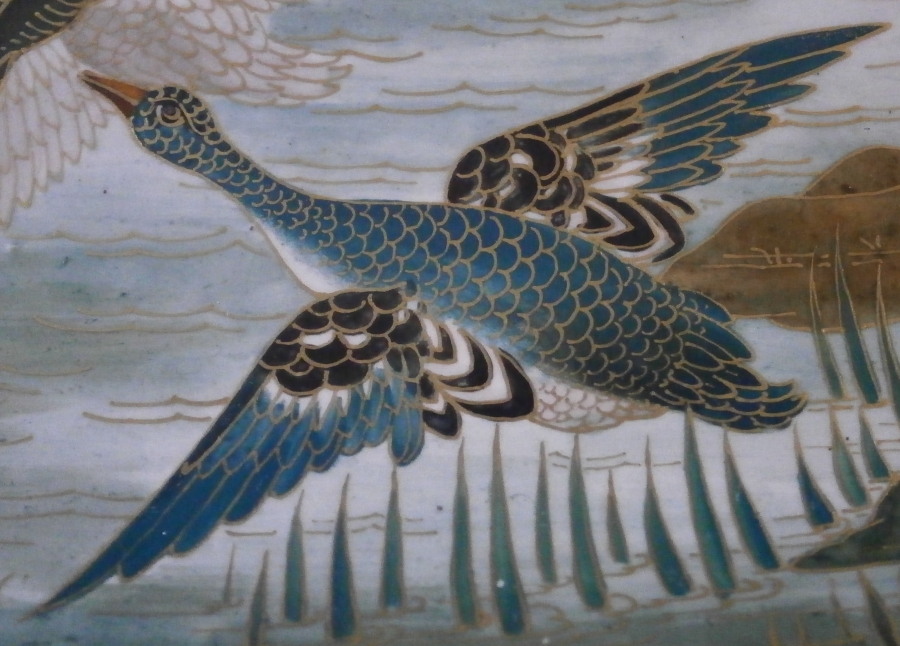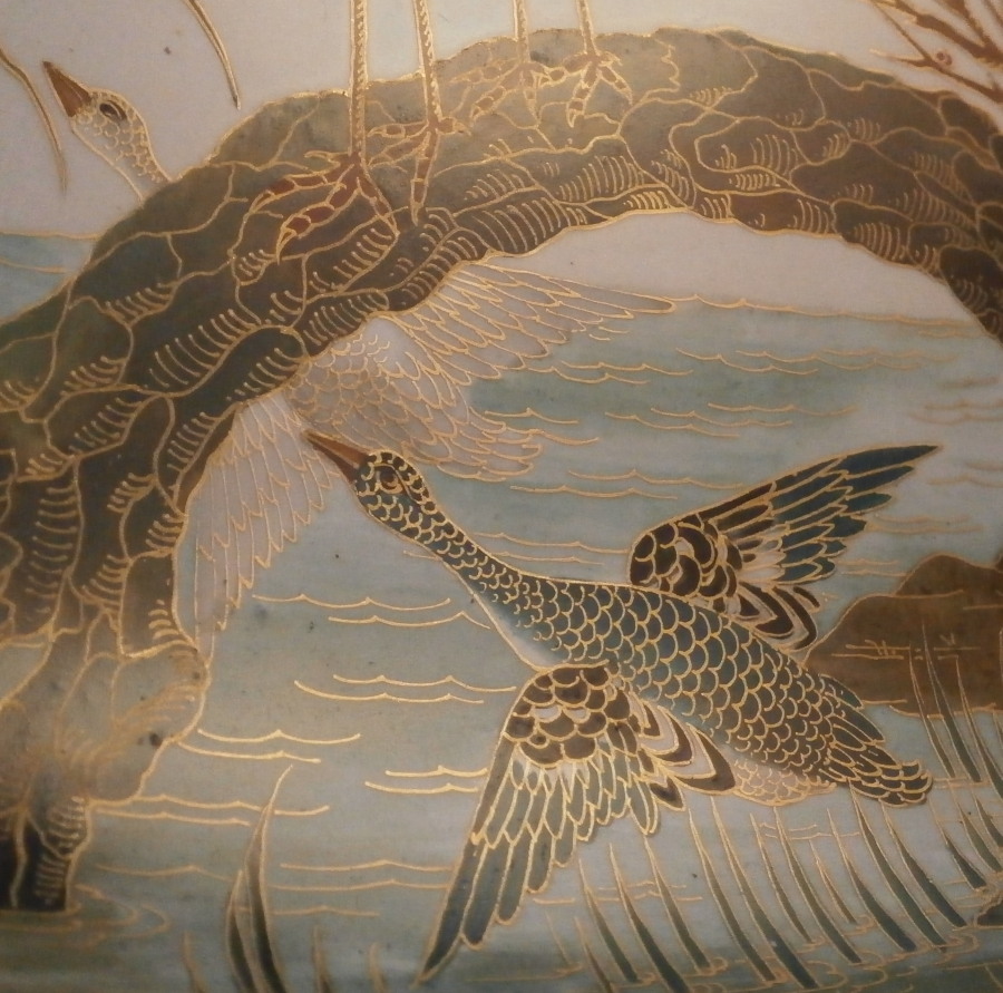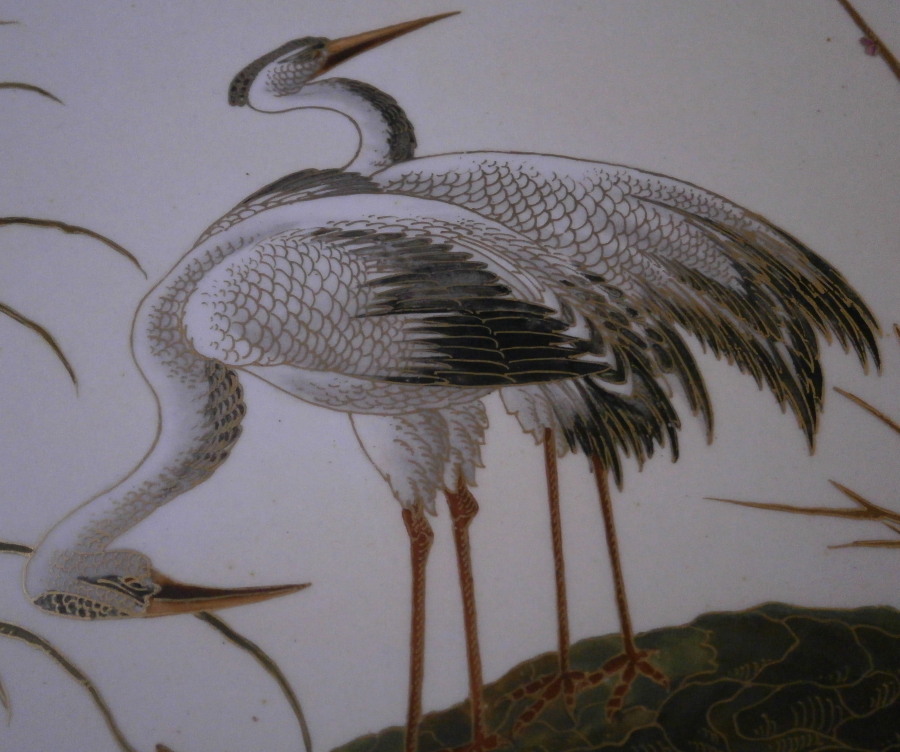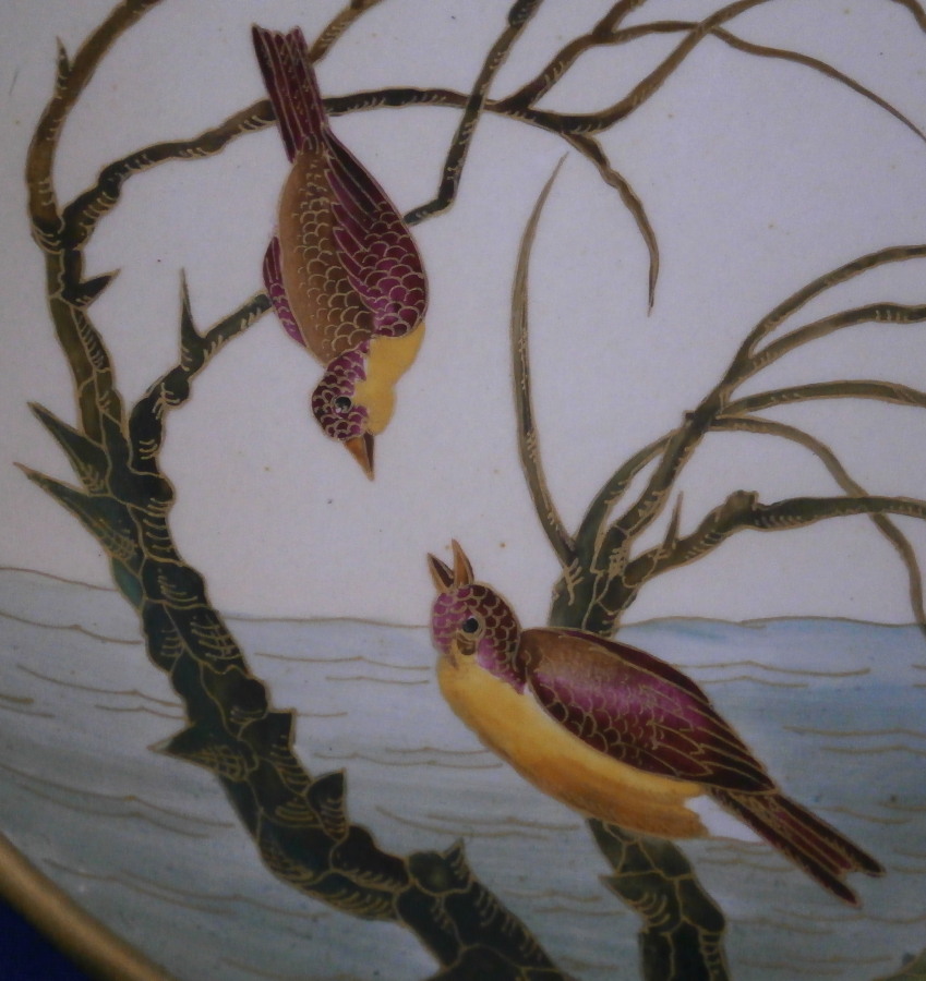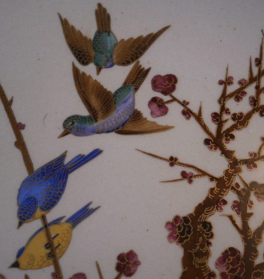 This is a really pretty (to use the words of my youngest kid) oval platter made by Choisy le Roi - Hautin & Boulanger in France in the second half of the 19th century. It is made of a majolica / faience / ironstone type material and has an oval shape to it with an amazing cloisonne look Japanese style decoration to it. There is a bent tree over some water on which two cranes or storks are standing, two ducks are flying through the opening with two smaller birds sitting in its branches. Next to it is a prunus blossom type tree with two birds in it and two more birds are flying above them. The decoration is amazing but a bit hard to show as all the pieces are painstakingly decorated with gilding over the polychrome decorations. All hand painted! My youngest unpacked it when it had arrived here and shouted: "dad this one is really pretty!" :) She does not often say that. The dish is in great condition with a couple of regilded spots along the edge of the rim. It displays perfectly! The palte is 0.75 inches tall, 13.75 inches wide 7.875 inches deep. It is marked underneath with the impressed H.B Choisy mark as well as a number 5 as shown. A really stunning and unusual piece! Please email me for more information or other pictures.