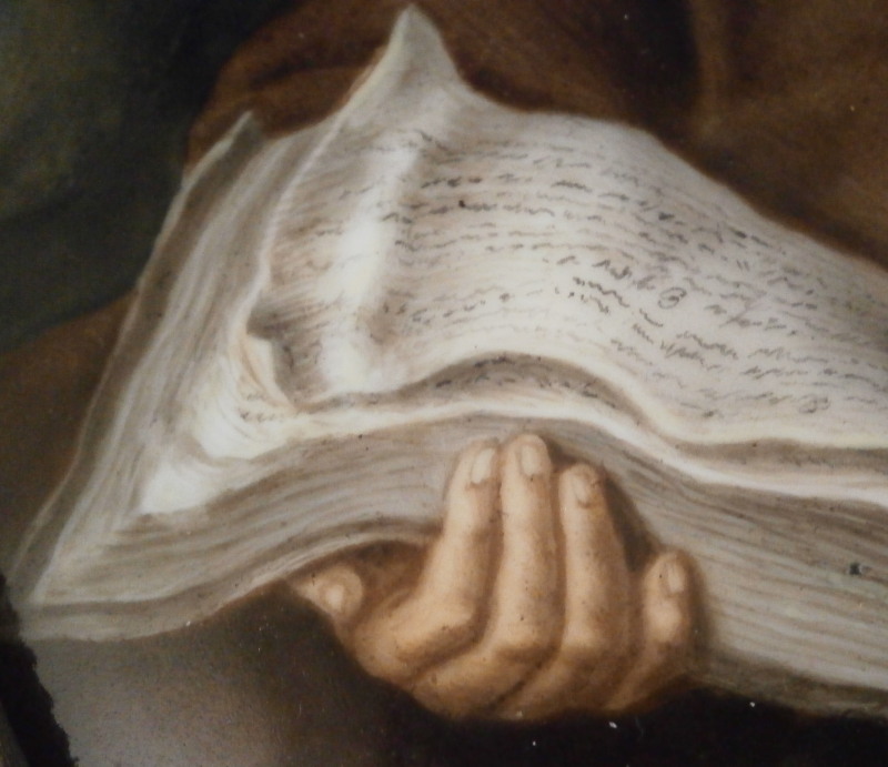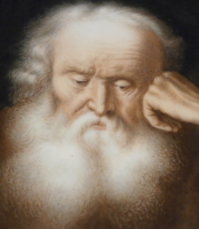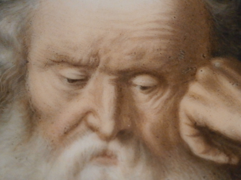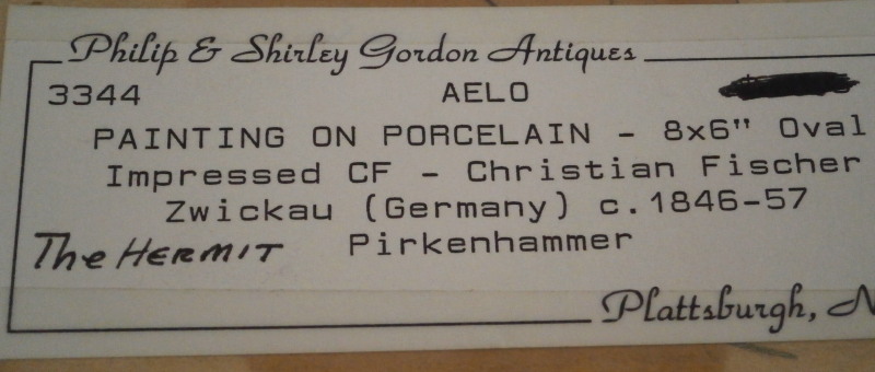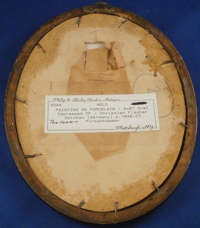 This is a superb plaque made by Pirkenhammer which is now located in Zwickau in the Czech Republic but it used to be in Germany around the mid 19th century. A Mr. Hoeke founded the factory around 1803 with the help of the Greiner family (from the Thuringia area), in about 1810 Christian Fischer & Reichenbach bought it and after 1845 Reichenbach was left. They won a few very high prestige awards for their porcelain which after the 1840's became more decorative and higher quality. This piece here is a great example of their best work. The plaque is hand painted with a superb design after the painting "The Hermit" which was painted by Salomon Koninck in the 17th century. The piece has an old bearded man reading a large book in the center with some dark landscape design all around. The quality is top notch and not like these modern printed pieces one sees all the time now. All hand painted! The plaque comes in a nice frame with a nice design to it. The frame is also older though I am not sure how old. The plaque is marked with an impressed CF mark as shown with a number below it. The painting is of a nice size being about 8 inches tall and 5.75 inches wide. The frame is 8.75 inches by 6.625 inches. The piece is in great condition with a one small damage to the left side of the frame which could easily be hidden and a flaw to the porcelain painting as shown about an inch below the left side of the book. A firing flaw circular in nature which doesn't take away from the piece. The back has an older label on it from a previous owner/dealer as shown. Please email me for more information or other pictures.