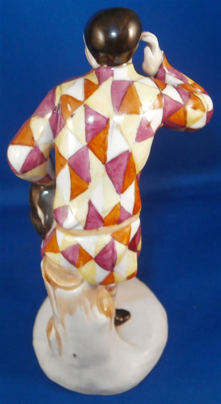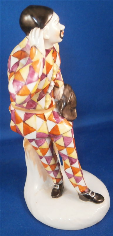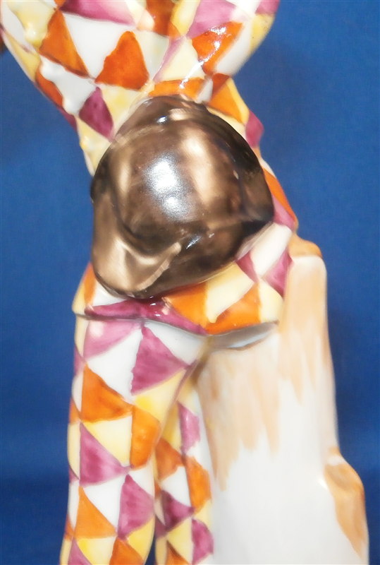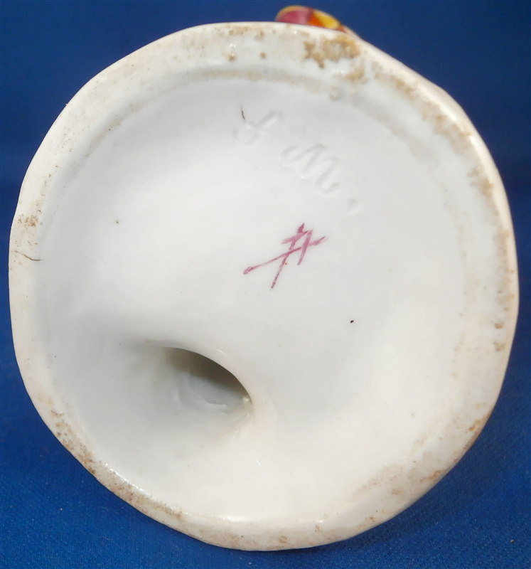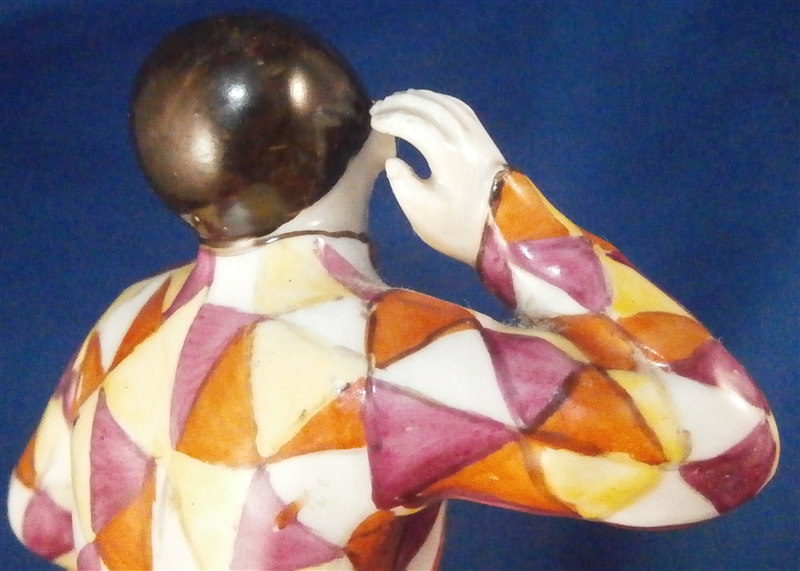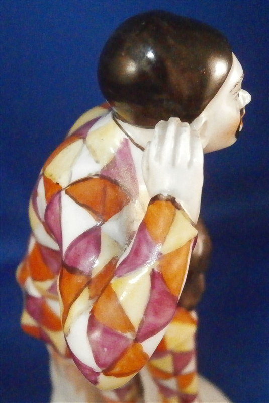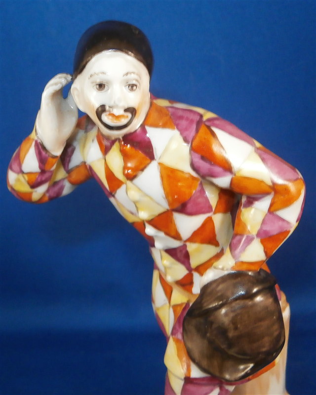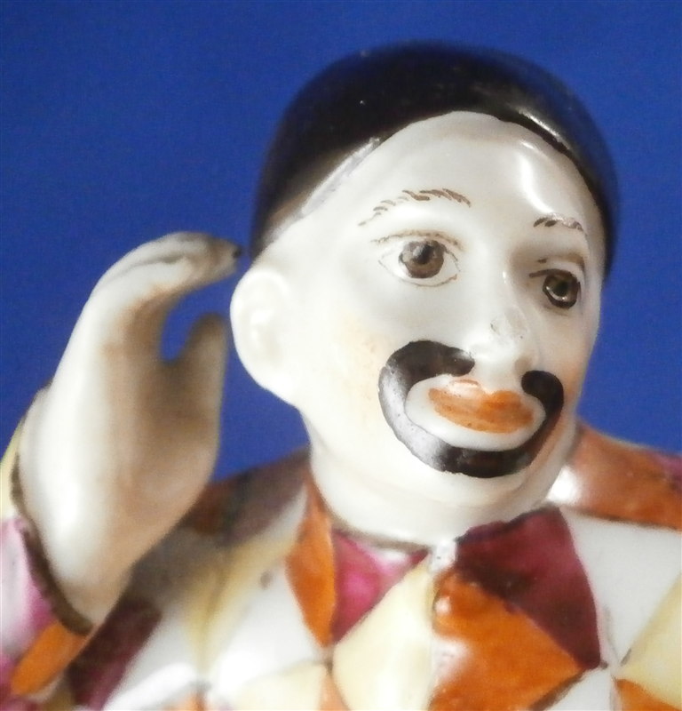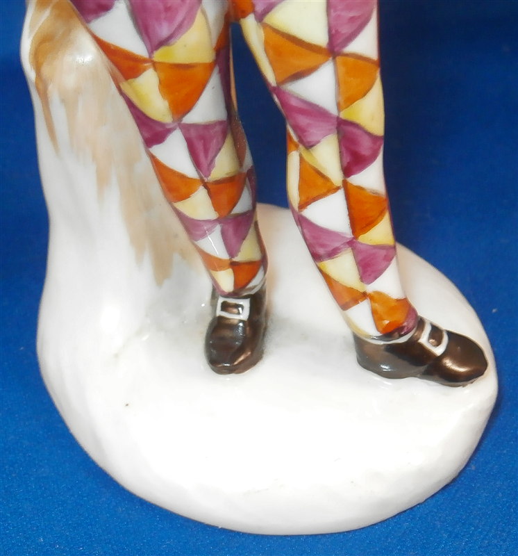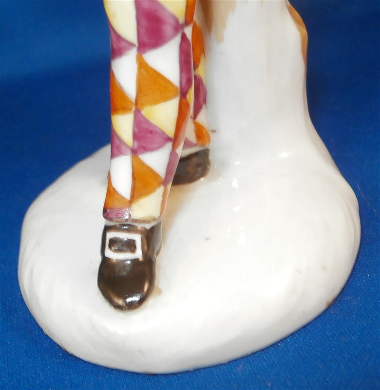 This is a rare figurine made by Kloster Veilsdorf in about 1765. Kloster-Veilsdorf was the most important Thuringian factory of the 18th century. It was founded in 1760 by Prince von Hildburghausen with the help of the arcanist Meyer. In 1795 the factory went to the Duke of Sachsen Altenburg who sold it to the Greiner family who owned most of the other makers in this region by then. The figurine is one of the rarer and most sought after pieces - a piece from the Commedia dell'arte - a Harlequin hand painted with a superb suit in orange, puce and yellow triangles. He is wearing a black cap and holding his hat in his left hand while holding the other hand up to his right ear. Standing on a typical base with a tree stump in the back painted in light brown colors. The figure is in superb condition with a bit of a rough nose - seems to be a glaze flake but it doesn't show when on display and a small puce stray color mark on the back of the tree stump. Otherwise he is perfect! An amazing piece by a small but important maker! The figurine is marked with a puce crossed swords mark - another example of a maker copying Meissen marks to try to sell their product :) Also incised the letters fn. or something along those lines. Definitely made by Kloster Veilsdorf! The piece is 5.5 inches tall, 2.75 inches wide and 2.625 inches deep. Please e-mail me for more information or photos.