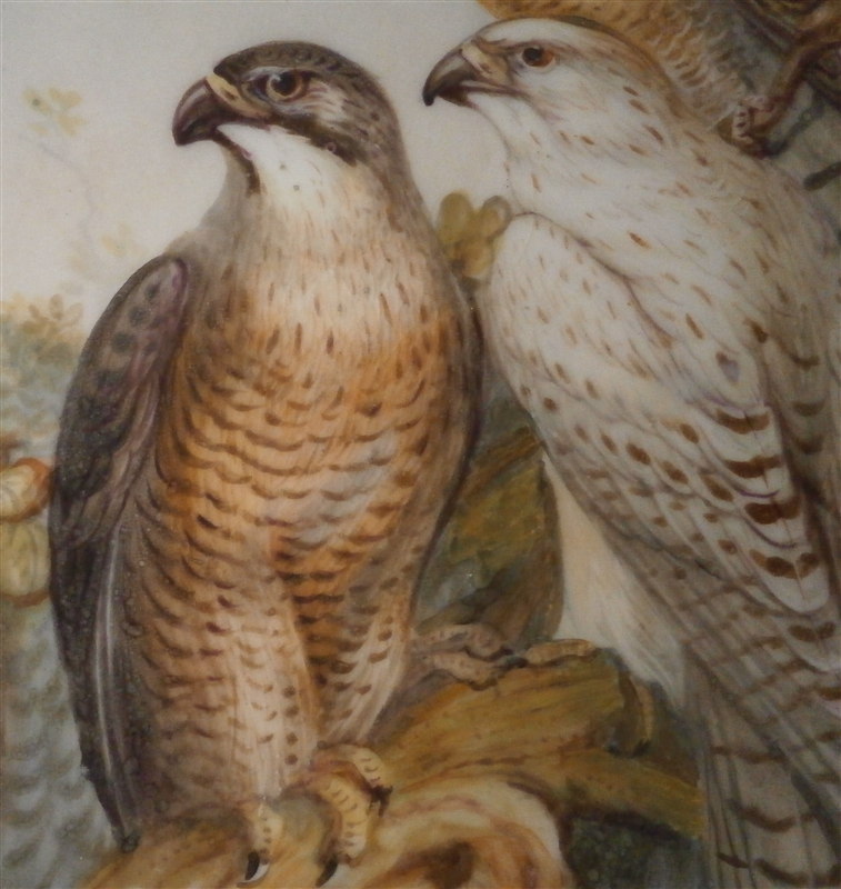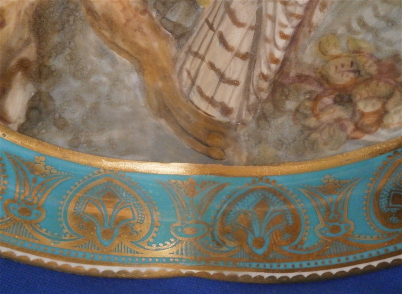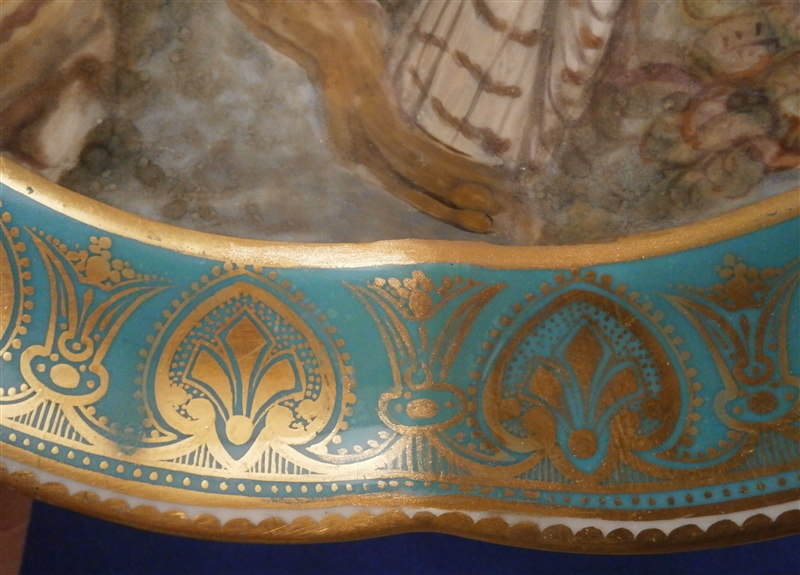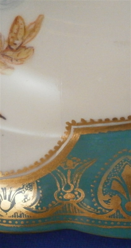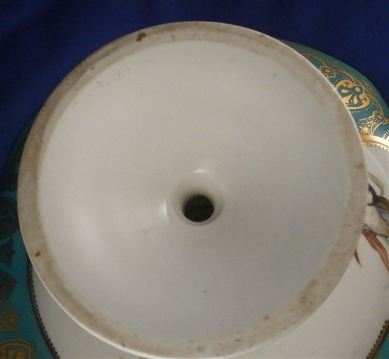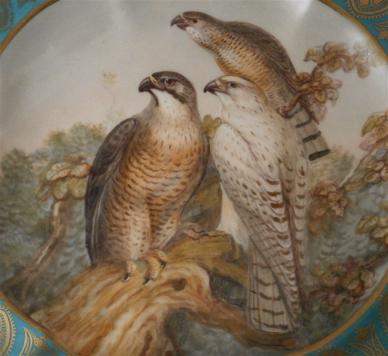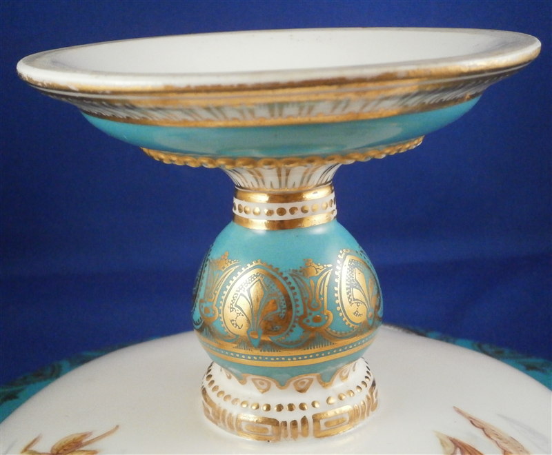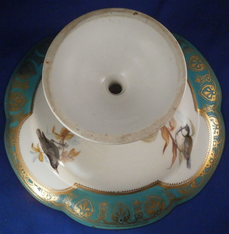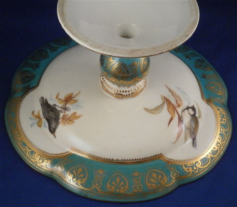 This is a really nice compote / tazza / cake stand made by Coalport or possibly Copeland in the mid 19th century. Probably one of the nicest I have ever come across with a large hand painted scene in the center of three birds of pray sitting in a tree with the rim having a nice shape and a turquoise ground color with some fancy gilding on top. Even the underside has three bird scenes on it and the foot has the same turquoise and gold design to it. A true beauty! The piece is not marked underneath which is fairly normal still during this period. This cake plate displays perfectly with a tiny bit of wear bit the top part has had a hairline perfectly restored which is only visible when shining a light through it. A superb job!! The compote is 4.625 inches tall and the top plate has a diameter of 9.375 inches. Please email me for more information or other pictures.