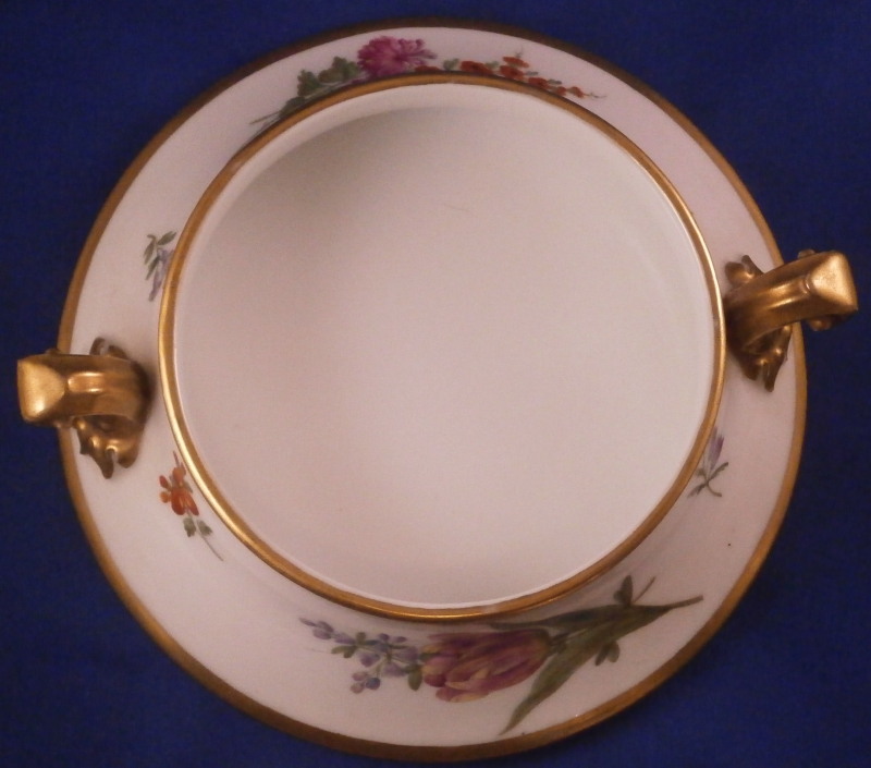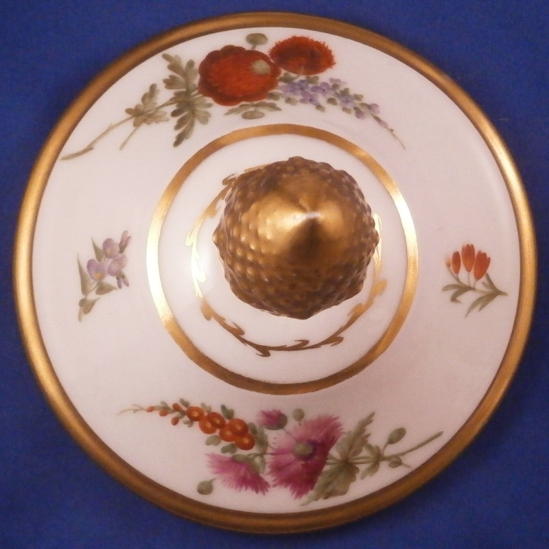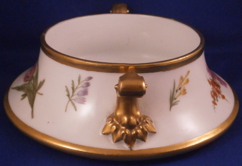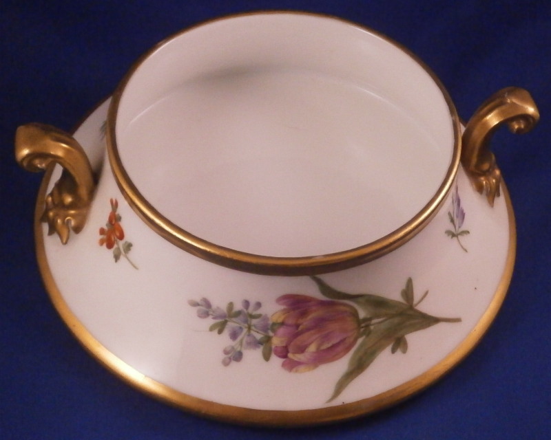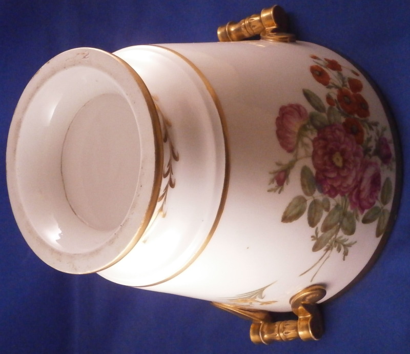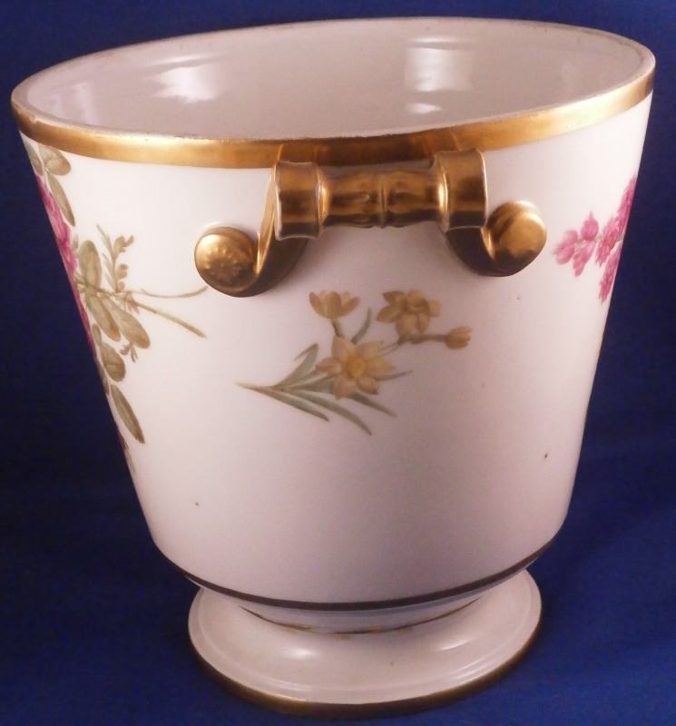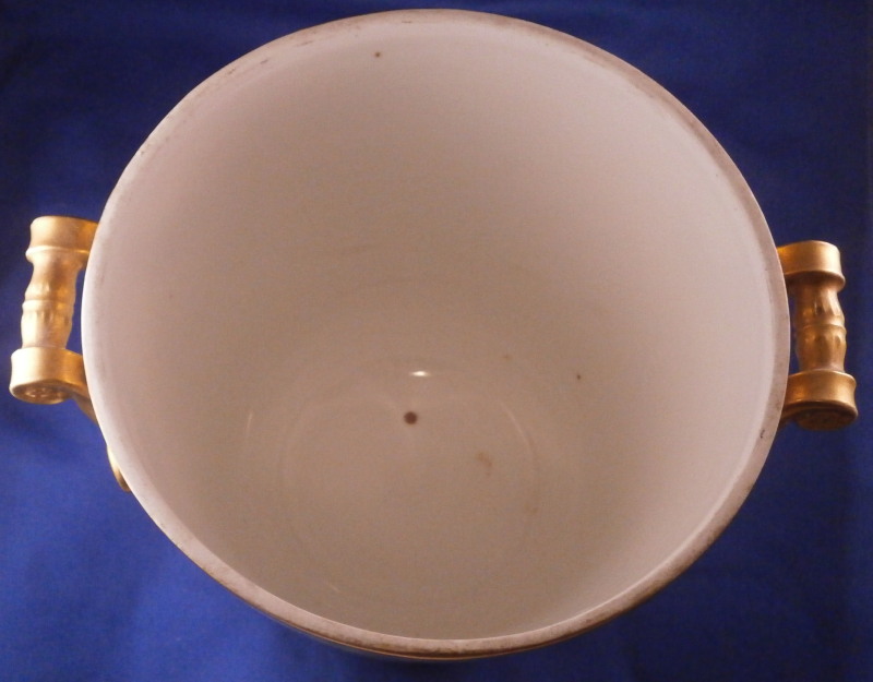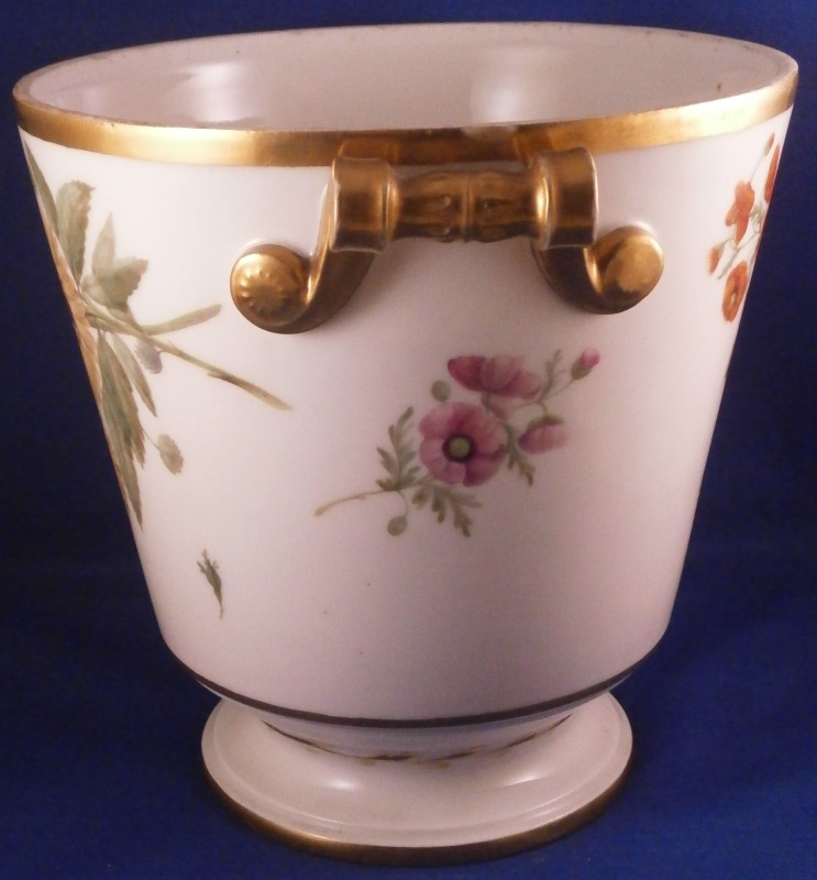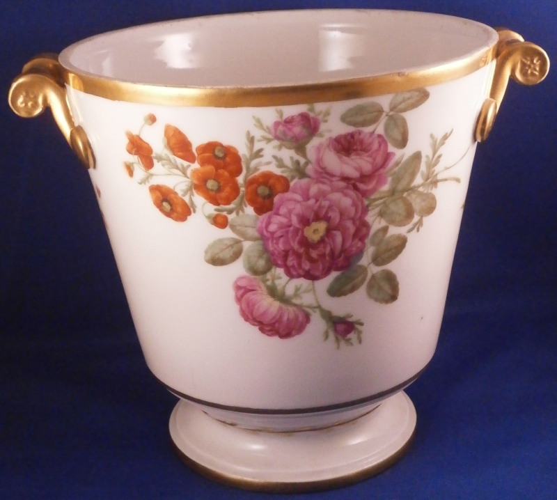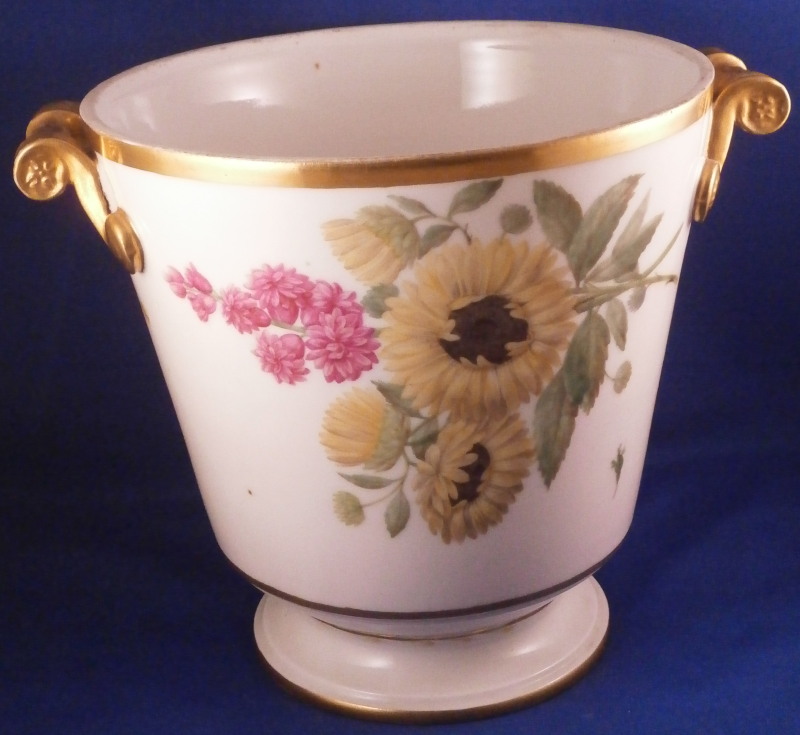 This is an amazing fruit cooler / ice pail made by Coalport around 1810. These pieces are very hard to find especially in this sort of condition and decoration. It comes in 4 pieces which is fancier than any other ones I ahve ever come across. The main body, the insert, a lid to put ice into and a cover to top the lid which is just fun. The pieces are hand painted with some amazing flowers as well as lots of gilding with handles to either side of the main body as well as the lid and a nice finial to the lid all fully gilded. My favorite flower by far would have to be the sun flower. Just stunning. I could not find another piece that well painted by them and they might have been painted by one of the famous painters of the period like Thomas Baxter , William Billingsley or even Thomas Pardoe ! Amazingly this piece is in perfect condition with almost no wear , just a few minor firing flaws like a random black spot and firing crack where the handle meets the body. Normal flaws and not real damage and completely normal on these early wares. The entire setup is about 14 inches tall, with a diameter of about 8 inches and the handles tick out a bit from there. Not marked except for an incised number 2 (possibly) but that is pretty normal! Their early pieces were rarely marked. I also own a matching second piece if anyone is interested in a pair but it has some minor damage. Please email me for more information or other pictures.