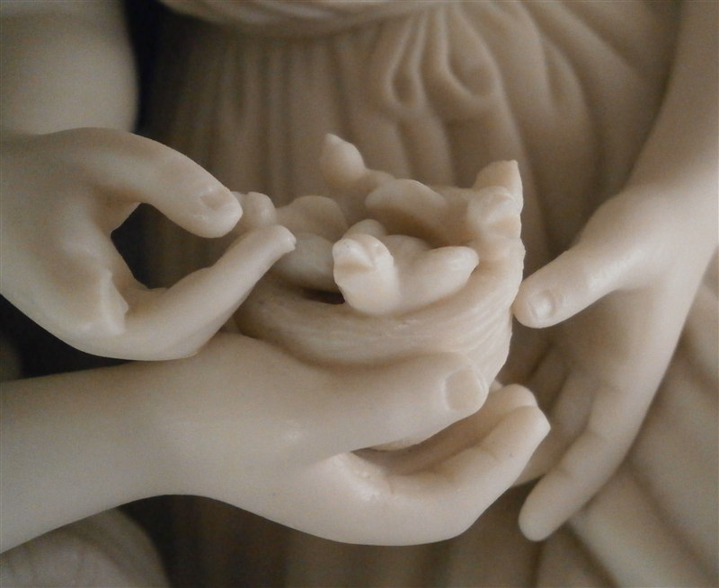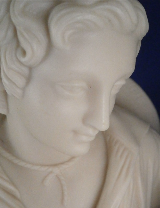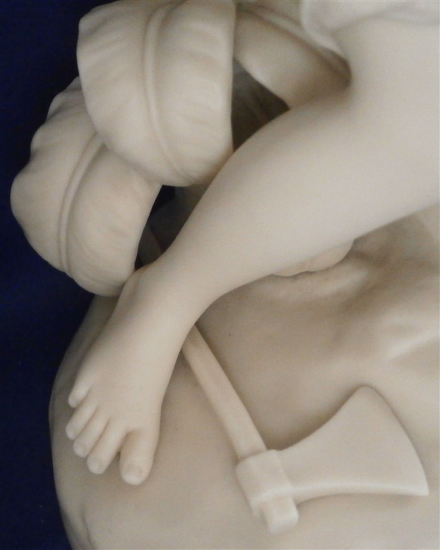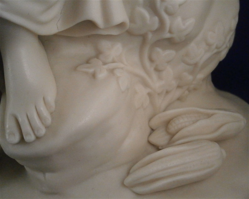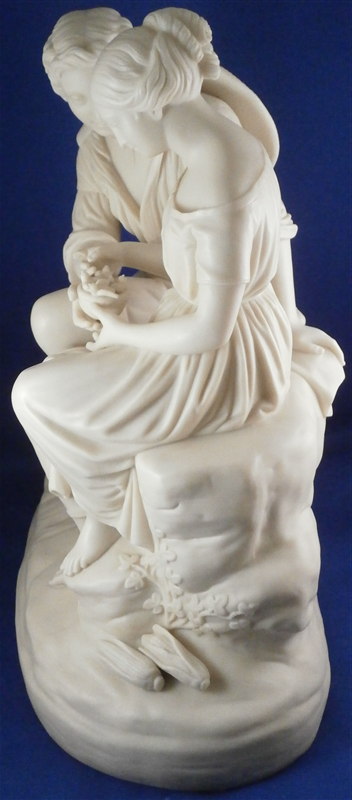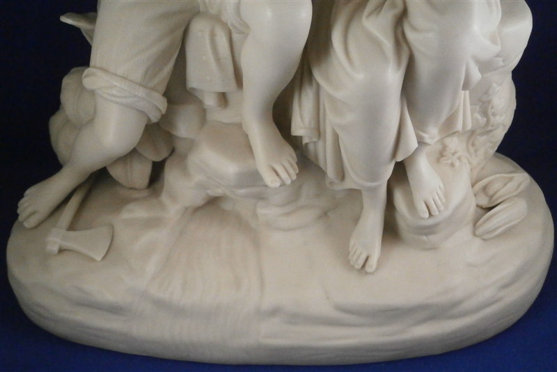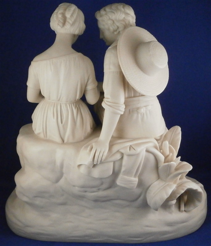 This is a superb early Parian figure made by Copeland in the mid 19th century. It is called Paul and Viriginia and was modeled by Cumberworth around 1846 which makes it a very early parian figurine by them. The couple is seated on some rocks with their feet bare, an axe by his right foot, some corn by her left foot with her holding a nest of baby birds in her hand. He has a straw hat hanging off his nack on his back and there is a ncei plant behind him. A superbly modeled piece that is just stunning. Nice size, too - being just under 12 inches tall, 11.25 inches wide and 6 inches deep. It is marked with the impressed COPELAND mark to the back edge of the base as shown. A fairly haevy piece due to its size. Amazingly in great condition with just the index finger of her right hand missing the front part otherwise perfect. The piece is based on a romance novel by Jacques-Henri Bernardin de Saint-Pierre about the love of two poor fatherless kids raised on a tropical island. Please email me for more information or other pictures.