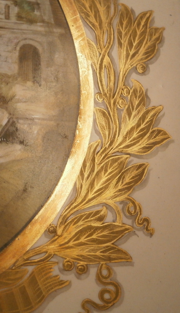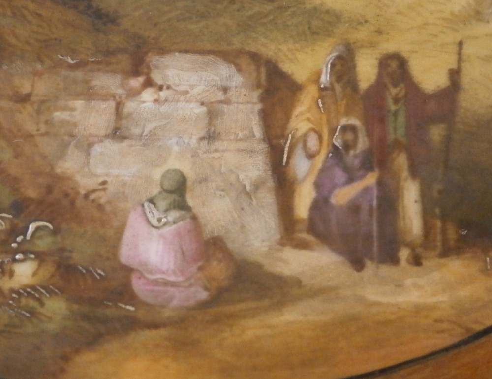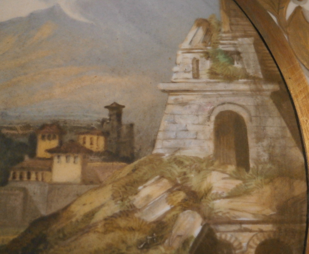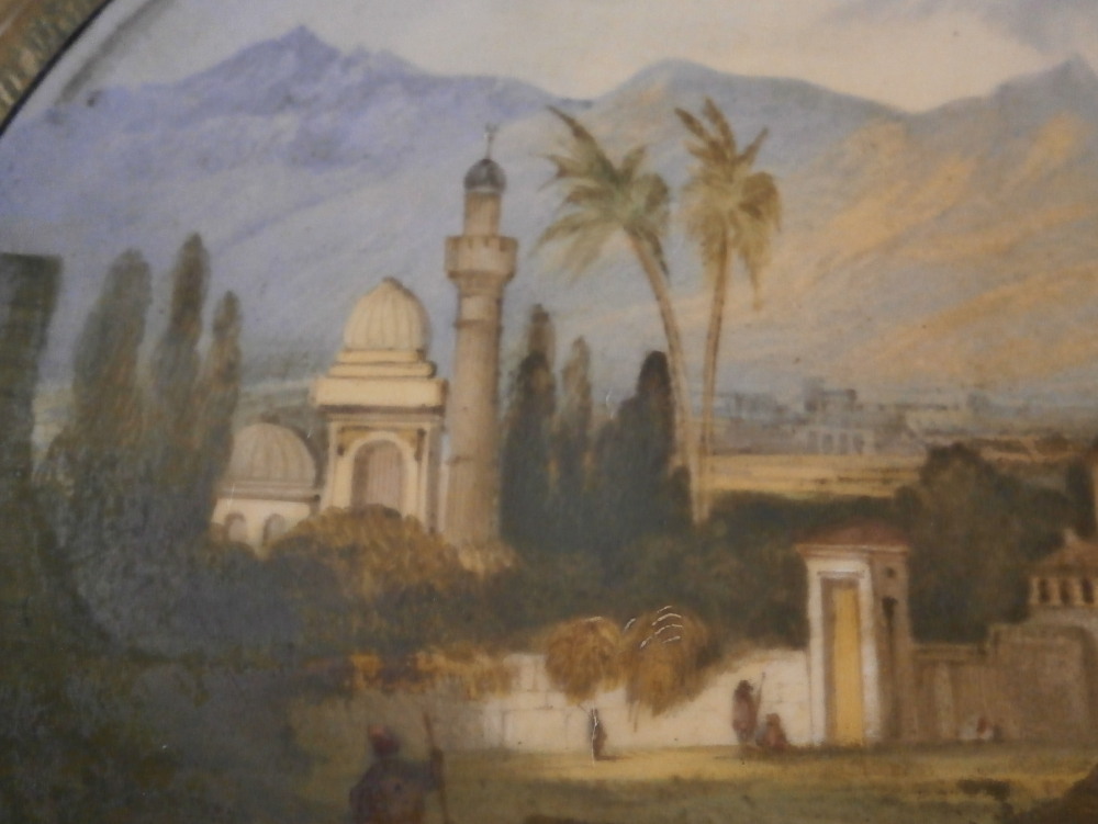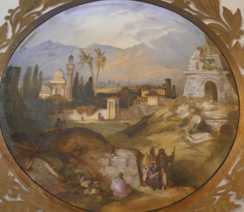 This is a superb large scenic plaque made by Copeland in England in the mid to later 19th century. It is a tile made by Copeland that was also painted by Copeland hence it being double marked which is neat. The tile has an off white ground color to it with the center having a superb hand painted circular scene to it of the city of Miletus which was a Greek city and is now located in Turkey . It was among the wealthiest of Greek cities before they Perian rule fo the 6th century. The scene is of a very nice quality and includes a few people, some ruins, mountains in the background, trees and what looks to be a mosque possibly the Ilyas Bey mosque. Great landscape all around. The scene is surrounded by a thin black ring as well as a thick gold ring and then some fancy leaf garland all around with some nicely tooled details to it. The bottom has a banner with the name of the city in it. It is a relaly nice piece! The plaque is in superb condition with some very minor oxidation to the thick gold ring around the scene which makes the gilding reddish in color in some places as well as some dark marks to the edge of the scene probably from an old frame of sorts. I got most of it off but did not want to be too rough and it does not distract from the piece.Couple of tiny nibbles to the bottom edge so not visible when on display. Displays perfectly! The entire piece is square and 8 inches on each side. Marked Copeland twice - once impressed and once printed as shown. Please email me for more information or other pictures.