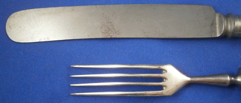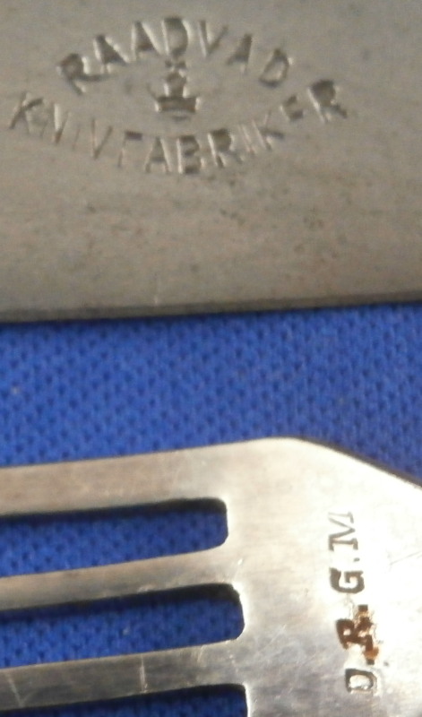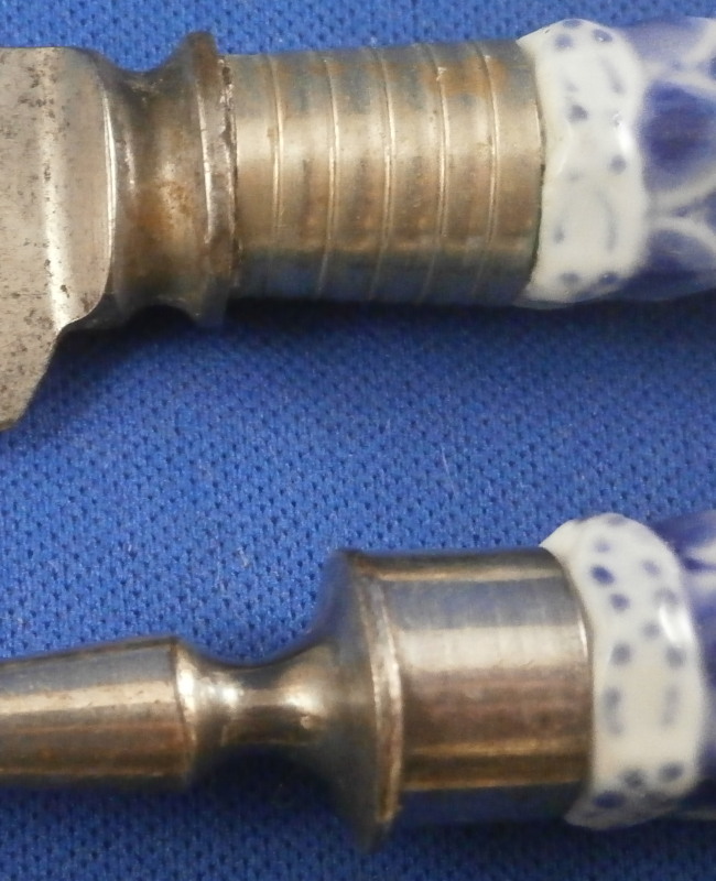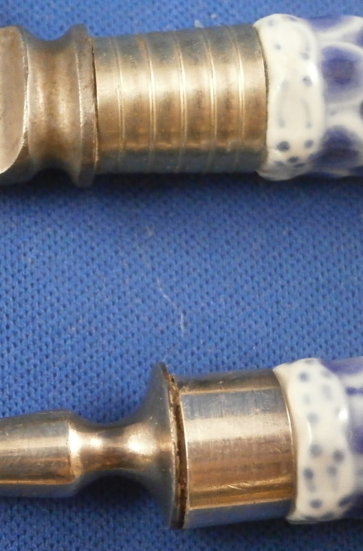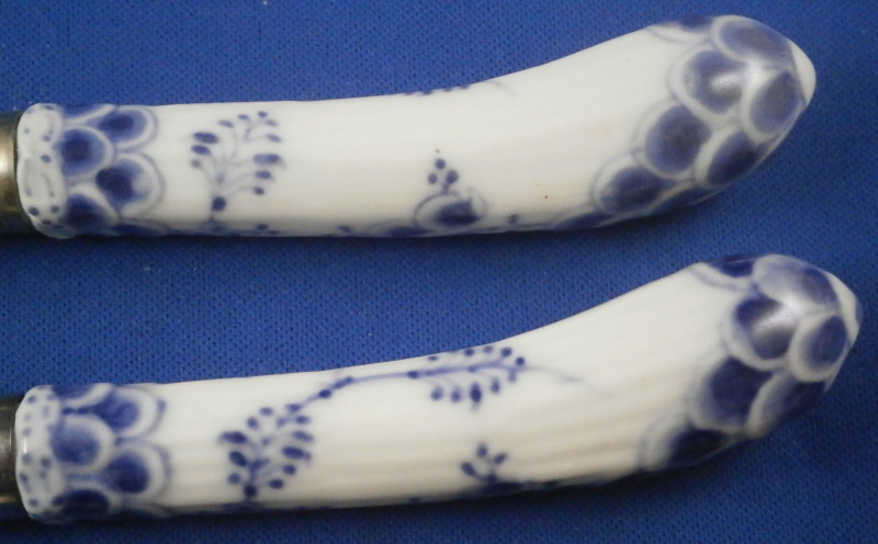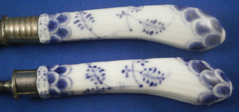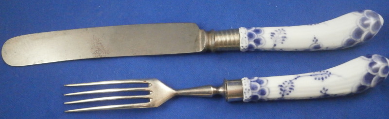 This is a very rare matching knife and fork pair where the handle is made of Royal Copenhagen porcelain. These are in the Blue Fluted style - their version of the blue and white strawflower pattern and I cannot recall ever having seen a set like this. A very nice pattern indeed. I am unsure as to the date of the porcelain handles or the metal parts. I am assuming they are at least 19th century with the porcelain possibly older since the metal parts were often replaced but they also have some good age to them already. Either way a superb set in perfect condition except for some oxidation to the metal parts which is normal. The metal part is steel - not sure what the collar is made of but it is not marked. These are unmarked which is always the case or at least not visibly marked. Might be hiding under the collar part. The metal blade is marked RAADVAD KNIVFABRIKER and the fork D.R.G.M. The fork is 7.25 inches long of which the visible part of the handle is about 3.375 inches. The knife is 8.625 inches long of which the visible part of the handle is about 3.5 inches.