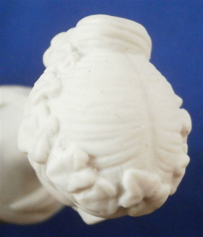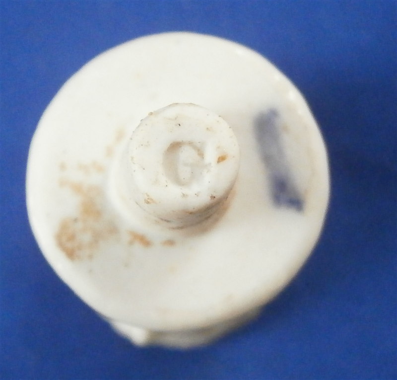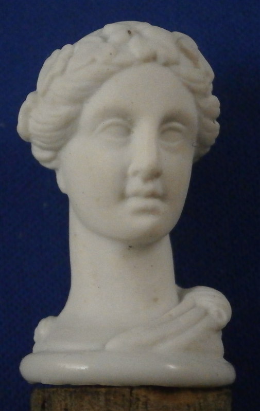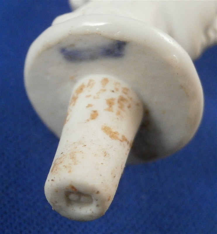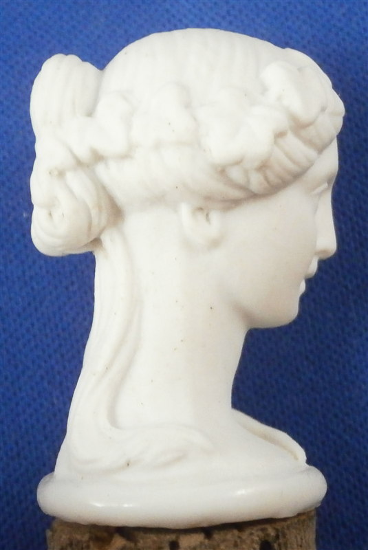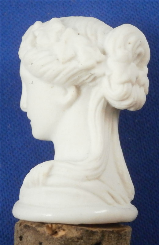 This is a figural bottle stopper made by Royal Copenhagen around 1900. It is in the shape of a lady's head with a bit of an Art Nouveau flavor to it. This version is unglazed except for the ring on the bottom edge but I also have a version that is completely glazed on my site. The piece is in perfect condition. Marked underneath as shown since the cork is loose and comes off. It has the three wavy blue lines as well as the letter G on the tip of the piece that goes into the cork. The porcelain part is 1.625 inches tall with the bottom ring ahving a diameter of about 1 inch. The cork part is an additional 1.875 inches long and it is 0.875 inches in diameter at the top. Please email me for more information or other pictures.