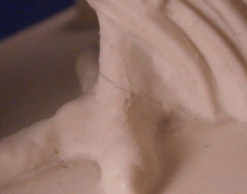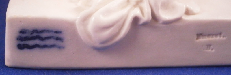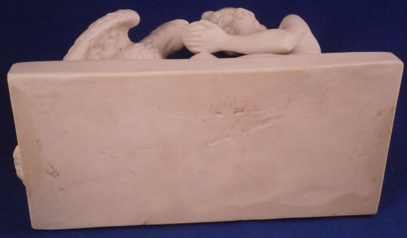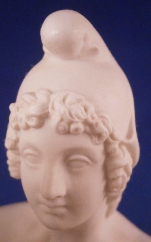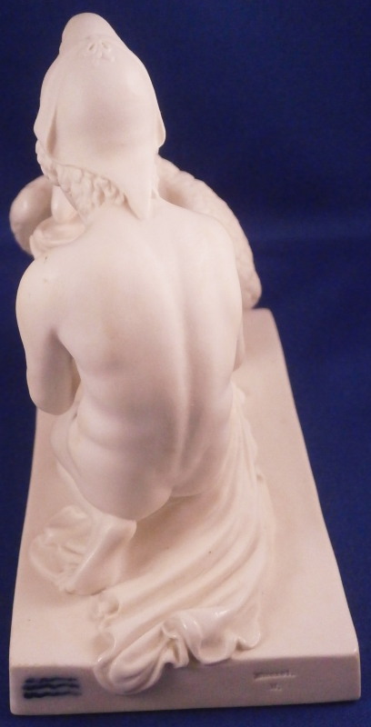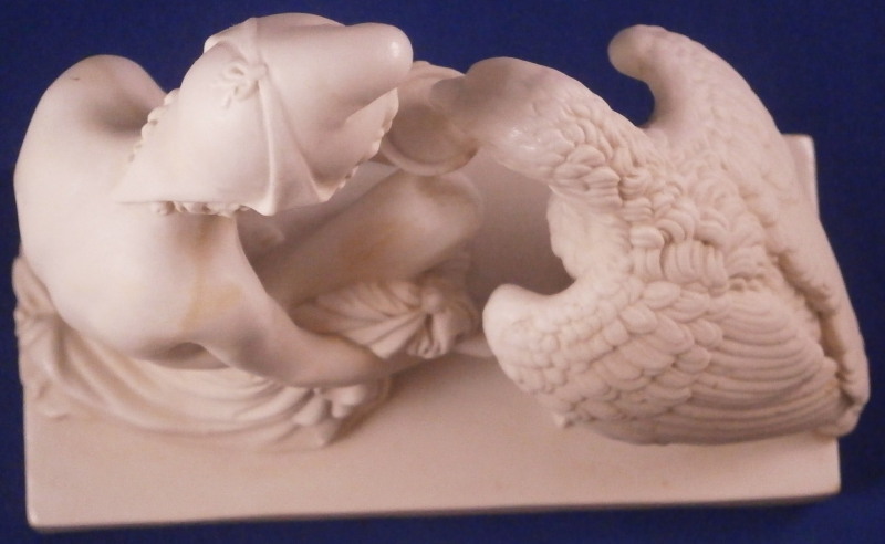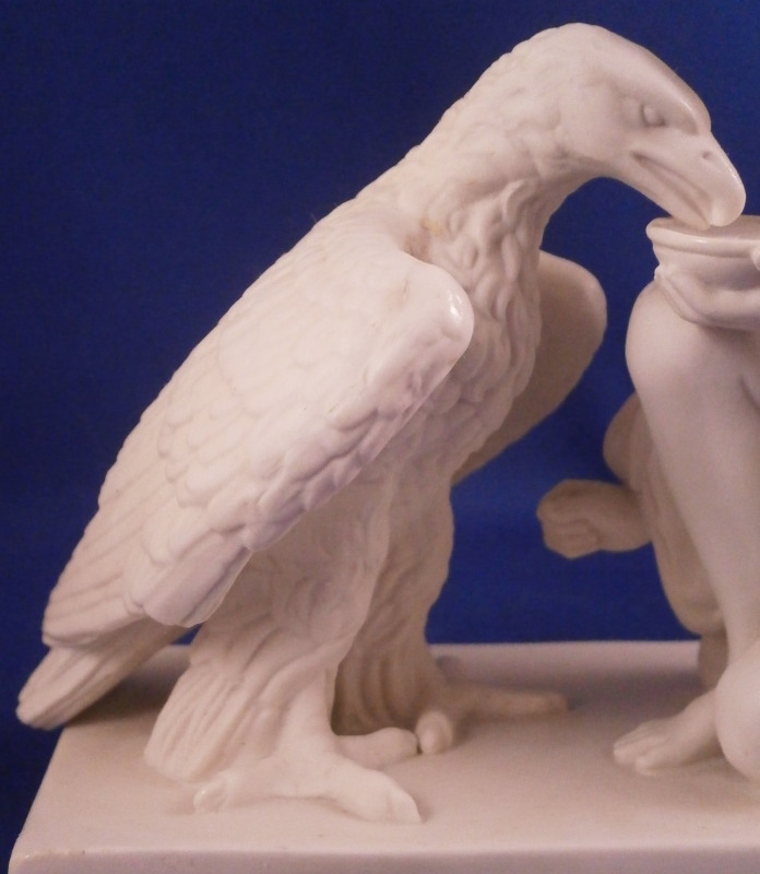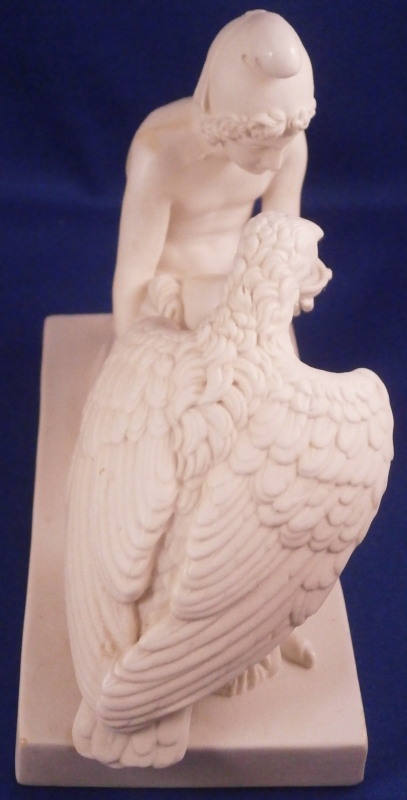 This is a superb biscuit porcelain figurine made by Royal Copenhagen in the late 19th century. It is of a Ganymede with Jupiter's eagle. The original marble figure was sculpted by Bertel Thorvaldsen in 1817 I believe. The boy figure is feeding the eagle from a cup. It is a really well done piece and one I have been wanting to have for a while. Left unglazed it shows off all that amazing detail that is often hidden by the glaze. Jsut stuning! The figure is in nice condition but he would have normally held a pitcher in his right hand which is missing. A problem that is quite common on this model. A few small firing cracks from when it was made with a larger one under the eagle's wing where it meets his body which was filled in at some point to hide it more like right after production which is not an uncommon thing to find. It does not show at all when displayed and the piece displays perfectly. The side of the base is marked with the wavy three blue lines underneath as well as the word Eneret (I think it stands for Copyright) with the letter B. under it as shown. The piece is 4.375 inches tall, 5.5 inches wide and 2.375 inches deep. Please email me for more information or other pictures.