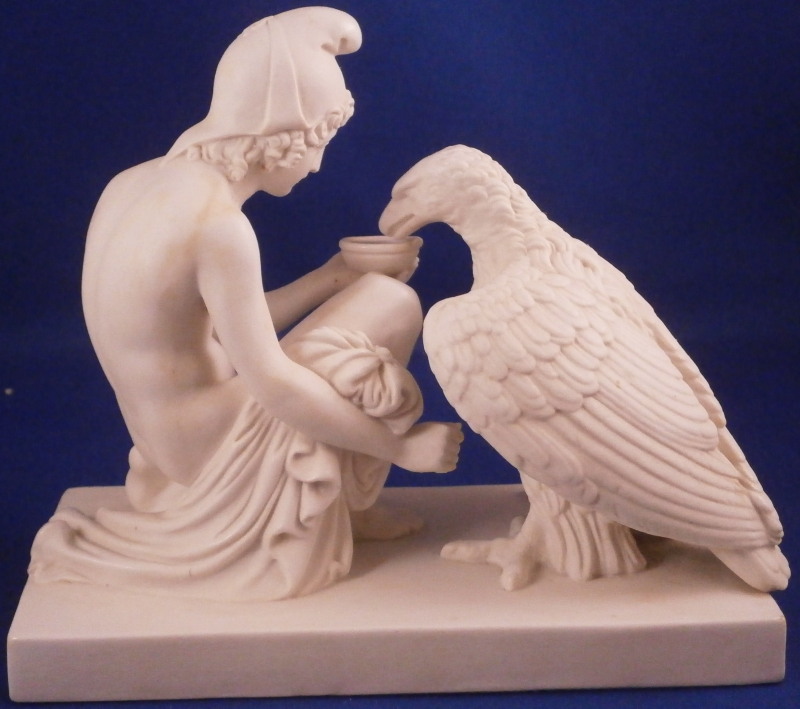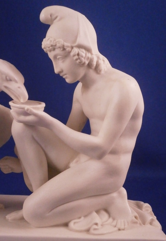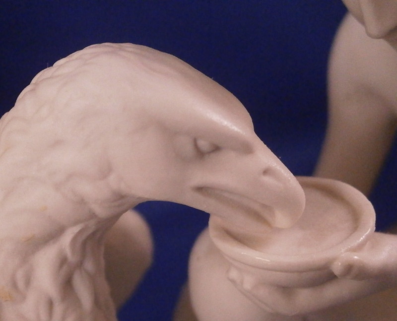Some more info on the subject: In Greek mythology the boy Ganymede was carried up into the sky, to the home of the gods on Olympus to be the gods’ taster. According to legend it was Zeus, in the shape of an eagle, who took the beautiful boy from Phrygia in the north-western part of Asia Minor (Turkey). The effect of Thorvaldsen’s sculpture is created mostly by the contrast between the smooth skin of the boy and his trusting nature, which is juxtaposed by the detailed rendering of the eagle’s feathers, its harsh look and its sharp beak. Ganymede was to take the place of Hebe as the taster of the gods, because she spilled the drink – the nectar – that made the gods immortal.