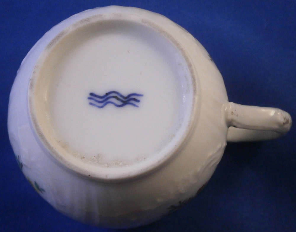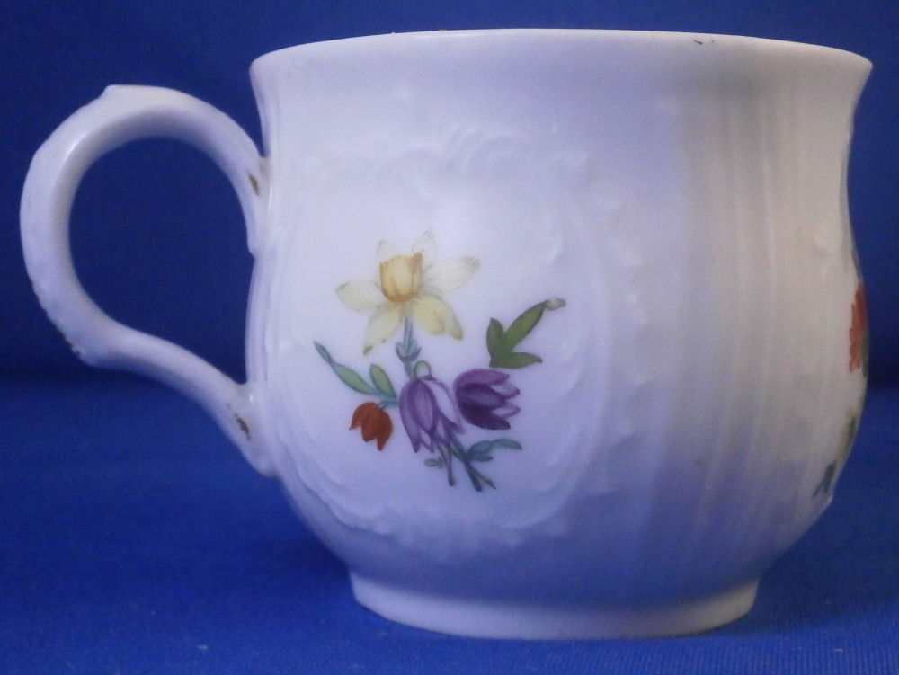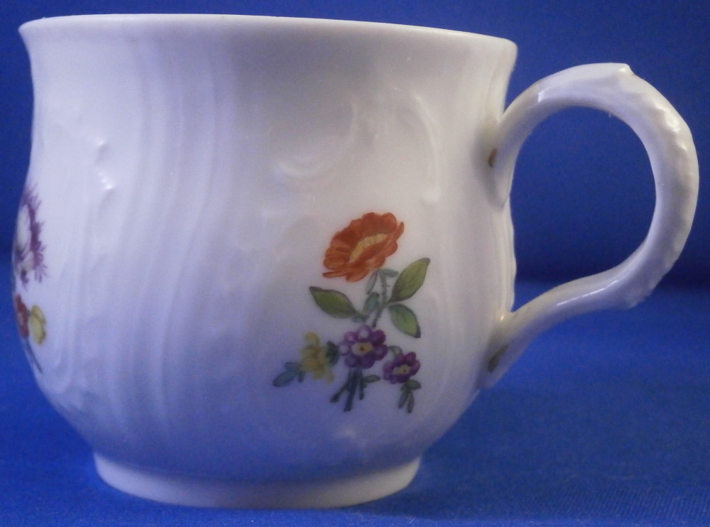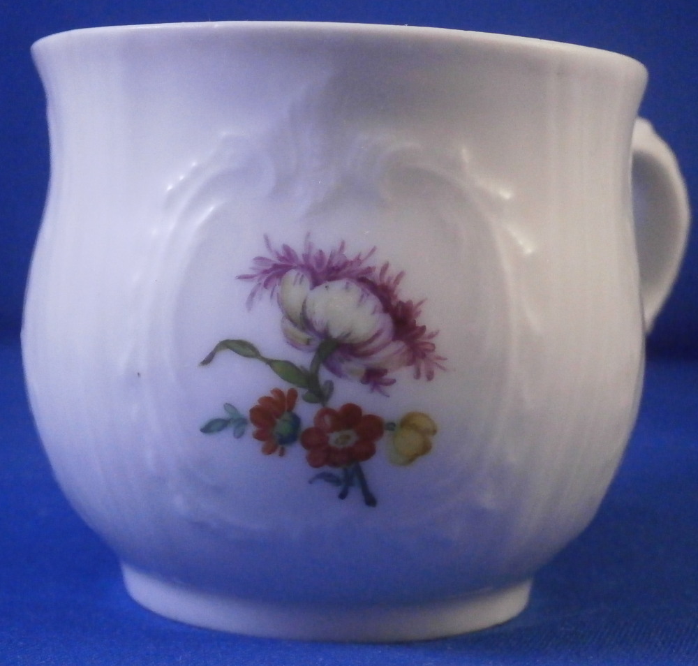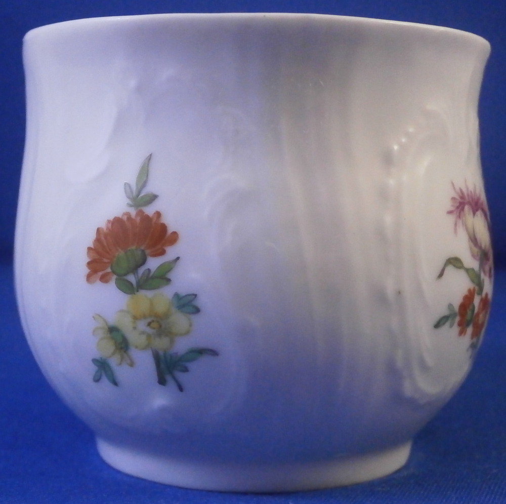 This is a a lidded cup / pot au jus / pot de creme / hot chocolate / custard cup with its lid made by Royal Copenhagen in about 1785-1790. A rare early example that is superbly modeled with a relief design all around and a floral finial to the lid. The main body has four hand painted floral arrangements to it and the lid has three small single flowers. Gilding to the handlke and leaves of the finial. A really nice early example by a great maker! The set is in good condition with some minor chipping to the petals of the finial and its leaves as well as some imperfections from when it was made - the worst of it is on the bottom inside where something stuck to it during the firing. Typical issues of early examples by any maker and not really considered damage. One rarely ever sees any of their early examples so it's a special piece. The cup is marked with the three wavy blue lines as well as an impressed numbers 7 and a script m or an incised 3 hard to make that one out. The cup and lid are 3 inches tall including the finial and 2.25 inches in diameter. Please email me for more information or other pictures.