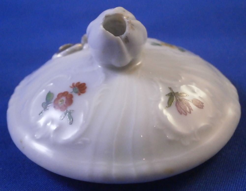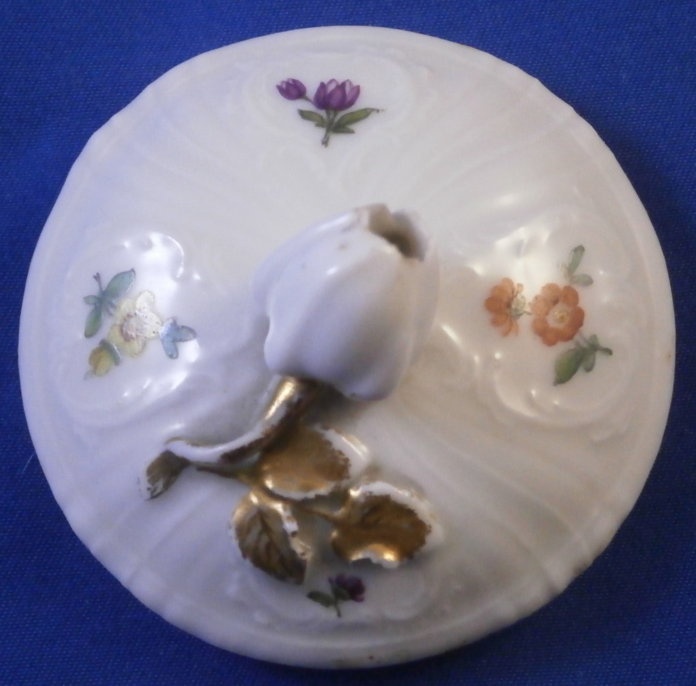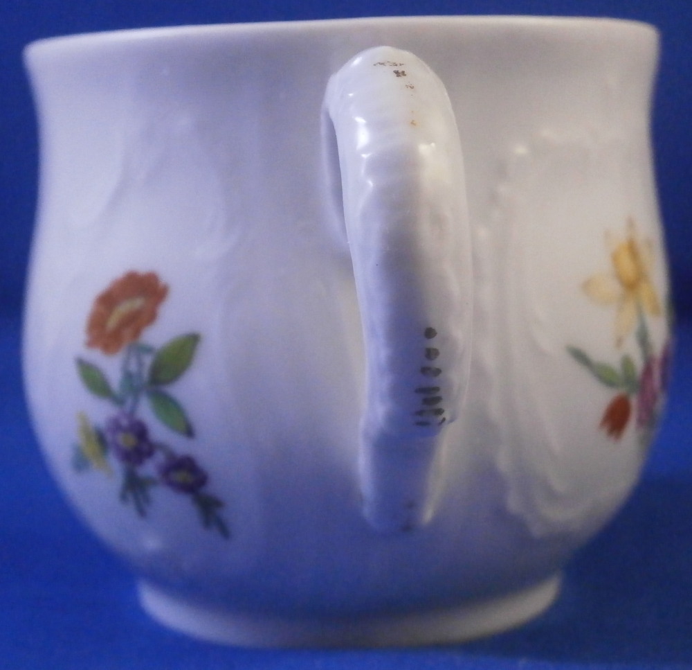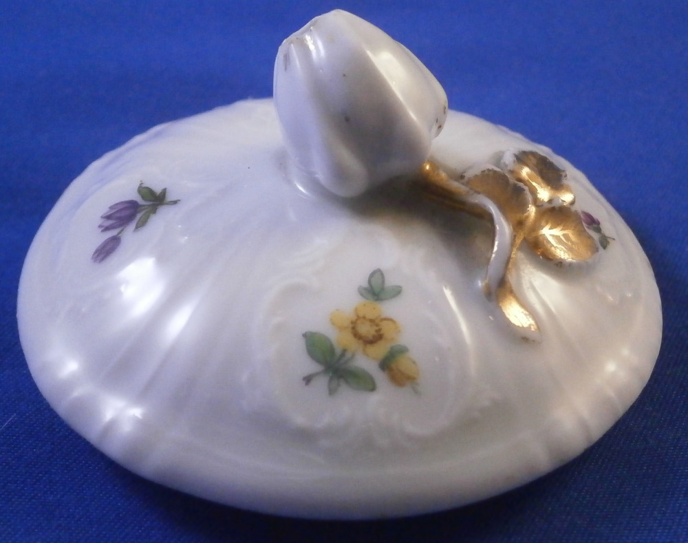 This is a a lidded cup / pot au jus / pot de creme / hot chocolate / custard cup with its lid made by Royal Copenhagen in about 1785-1790. A rare early example that is superbly modeled with a relief design all around and a floral finial to the lid. The main body has four hand painted floral arrangements to it and the lid has three small single flowers. Gilding to the handlke and leaves of the finial. A really nice early example by a great maker! The set is in good condition with some minor chipping to the petals of the finial and its leaves as well as some imperfections from when it was made - the worst of it is on the bottom inside where something stuck to it during the firing. Typical issues of early examples by any maker and not really considered damage. One rarely ever sees any of their early examples so it's a special piece. The cup is marked with the three wavy blue lines as well as an impressed numbers 7 and a script m or an incised 3 hard to make that one out. The cup and lid are 3 inches tall including the finial and 2.25 inches in diameter. Please email me for more information or other pictures.