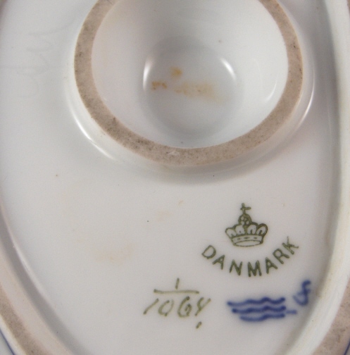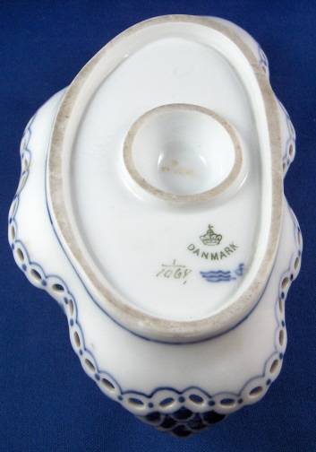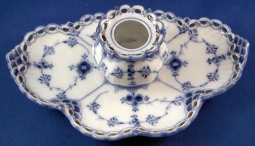 This is an inkwell made by Royal Copenhagen in the late 19th century. It is handpainted with an underglaze blue strawflower design I do believe is called full lace with the reticulated edge. A very typical design for them but not often found from this time period. The tray and inkwell are one piece and then the lid is separate. The tray and inkwell are in perfect condition but the lid is a replacement someone made. It's a good match but it's not original to the piece sadly. The inkwell is marked underneath with the three wavy blue lines as well as Danmark under a crown in green and some other marks as shown in the pictures. It is about 6.5 inches long, 3.75 inches deep and 2.75 inches tall. Please email me for more information or other pictures.