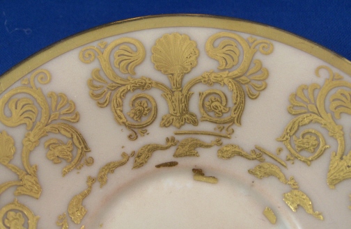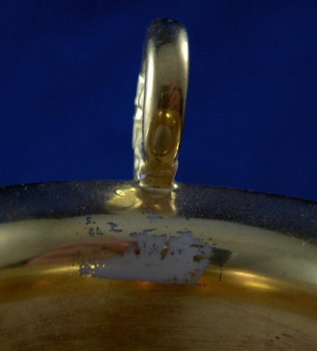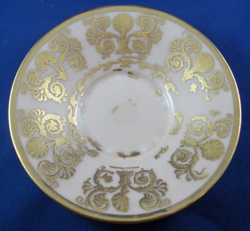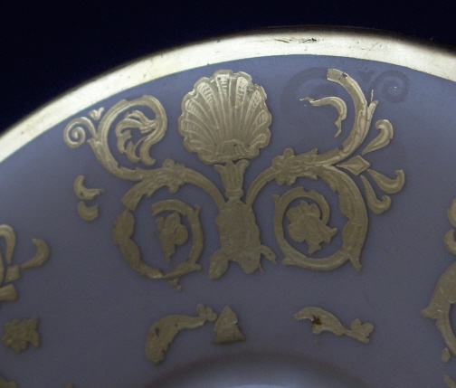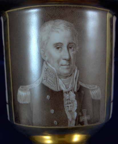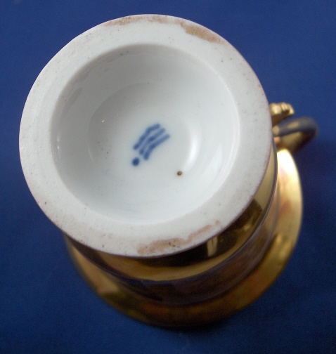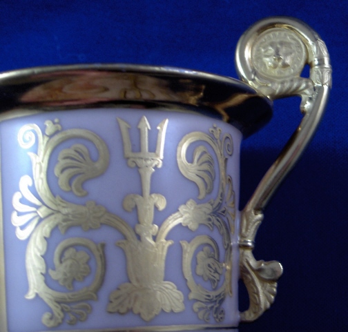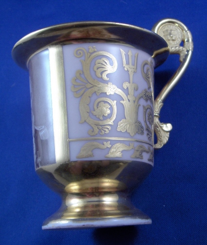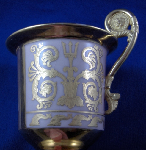 This is a rare cup and saucer made by Royal Copenhagen in about 1800. The cup has a handpainted portrait of King Christian VII (I believe) on the front while the rest of the cup has a salmon colored ground color with a nice fancy gilding on it. Super handle shape as well! The portrait is on the front while the rest of the cup has a salmon colored ground color with a nice fancy gilding on it. Super handle shape as well! The portrait is painted in shades of grey which was more common around this time. I have never seen portrait cups by them but am sure they are in museums somewhere. The gilding is top quality with lots of detail even within the gilding itself. The set is in good condition with an old hairline to the top rim of the cup about 1.5 inches down into the cup (it is not too obvious!). The top of the handle has a hairline where it attached to the cup but it was never off and since both cups have this issue I assume it is a weak spot in the design! There is a little bit of wear to one spot on the inside gilding on the cup (by the handle) and the edge of the foot. The saucer has more wear to the gilding but is in better shape than the other saucer. The gilding is thick and actually flaked off in areas instead of just wearing off. There is a small chip to the saucers underside rim which one cannot see from the top. Still a fairly easy fix if need be and I will probably have that done! Both pieces are marked with the three blue lines mark with the dot as well as some impressed marks like three lines and a single line on the saucer and a double line on the cup. The cup is 3.5 inches tall plus the handle and 3.25 inches in diameter. The saucer is 1.125 inches tall and 5.375 inches in diameter. This set is superb and displays very nicely! Please email me for more information or other pictures.