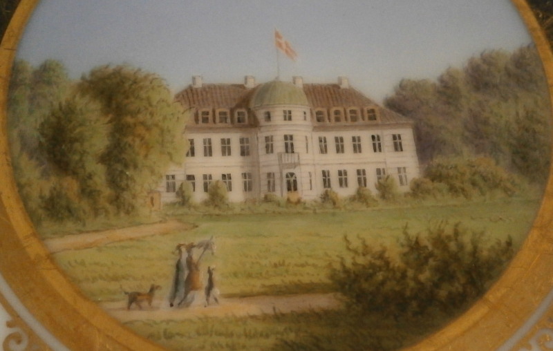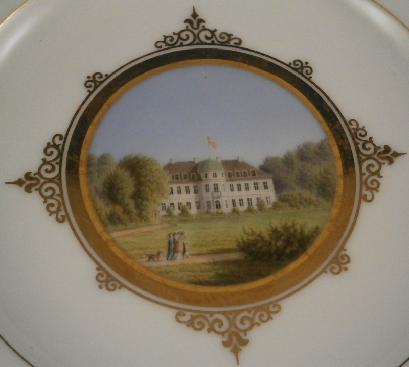 This is a superb plate made by Royal Copenhagen in the 19th century. It is hand painted with a nice large scene in the center of Bernstorff Castle / Slot / Palace in Gentofte , Denmark, was built in the middle of the 18th century for Foreign Minister Johann Hartwig Ernst von Bernstorff. It remained in the possession of the Bernstorff family until 1812 and in 1842 it was bought by Christian VIII. For many years, it was used as a summer residence by Christian IX until his death in 1906. The scene is surrounded by a nice gold trim with another thin gold line around the edge of the well and more gold trim along the rim of the plate. It is very rare to find a nice scenic plate made by Copenhagen and the royal residences are especially nice ones. The plate is in great condition with some minor wear to the gilding. It is marked underneath with the three wavy blue lines in under glaze blue. The plate is 1.125 inches tall and 8 inches in diameter. Please email me for more information or other pictures.