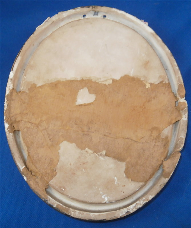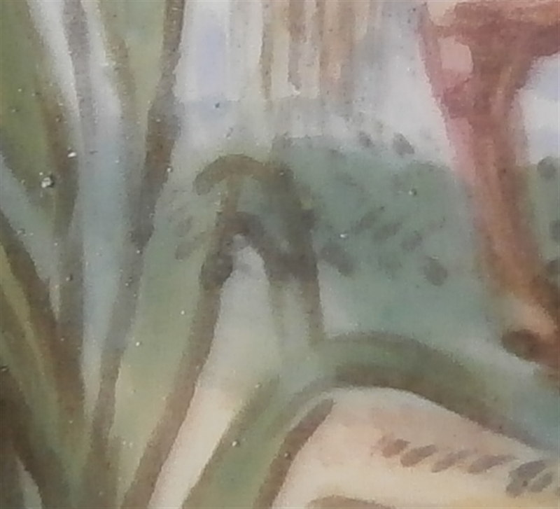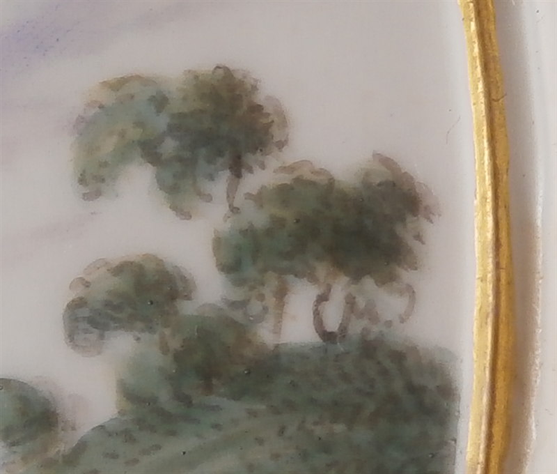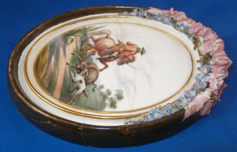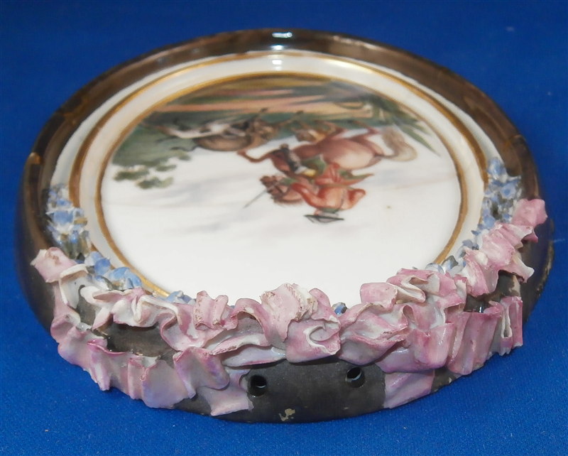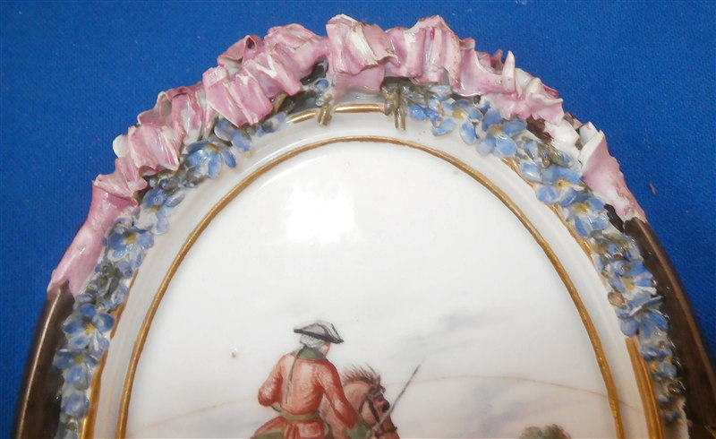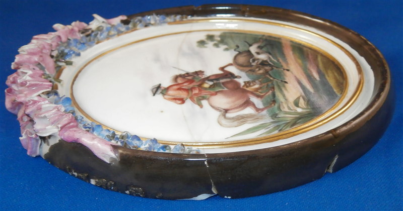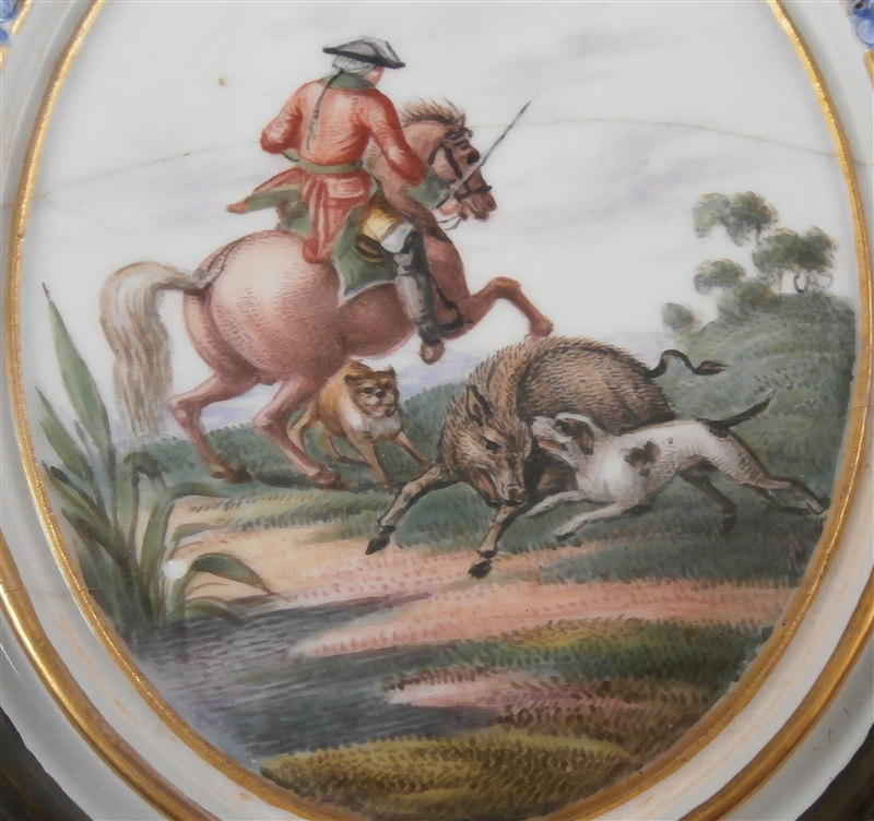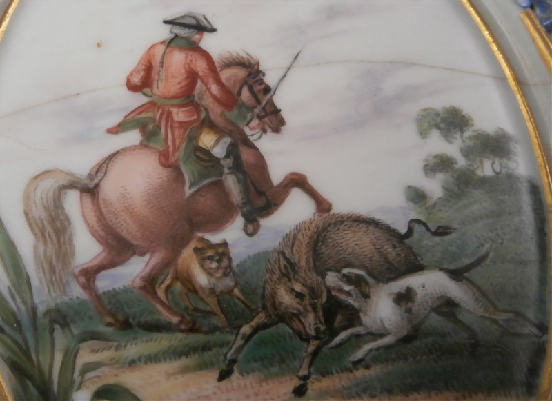 This is a very rare porcelain plaque made by Royal Copenhagen in about 1780. These plaques are from their earliest period and quite rare. This one is hand painted with a scene of a hunter on his horse with two dogs, one of which is attacking a wild boar. Nice landscape scene with gold trim around it and what is meant to look like a frame with some nice small handpainted attached flowers around the top as well as a pink ribbon. These pieces are really nice and scenic pieces like this are pretty much impossible to find by Copenhagen. The plaque is of top quality and displays nicely but there are some major condition issues. There are a some minor chips to the small blue flowers, the pink ribbon has damage to it and the piece was broken into three pieces as shown a long time ago. Put back together very well but the brown frame looking part has some small chips missing some of which have been filled in and have been painted over to hide them better. Still looks great and it is so rare that is is fine as is or one could get it easily restored! The piece has two holes in the back to string it up to hang on the wall. Right by those holes it is marked with the three blue lines as shown. The piece is 0.5 inches thick, 4.625 inches wide and 5.75 inches high. I took some close ups of areas that seem to have initials or signatures in it but as always might just be there by chance. Please email me for more information or other pictures.