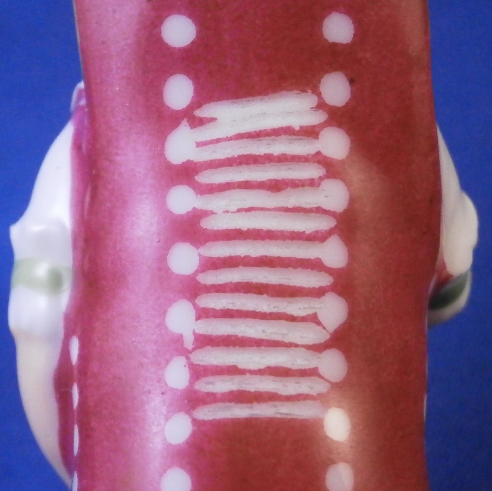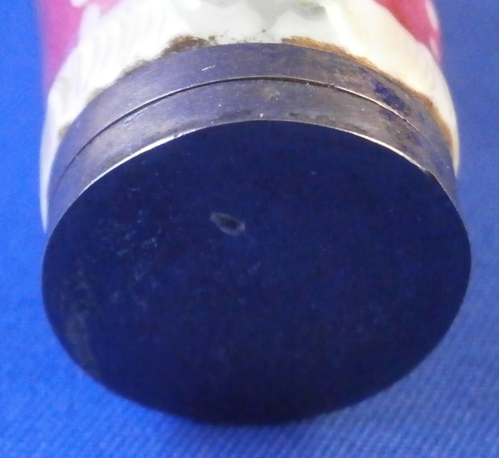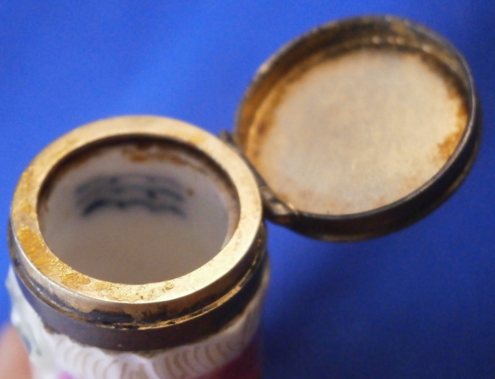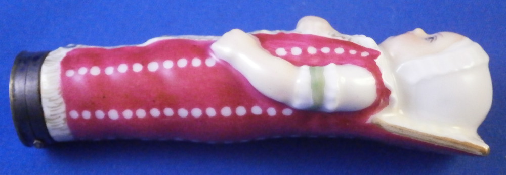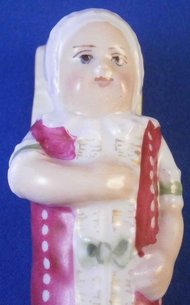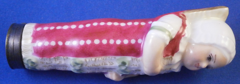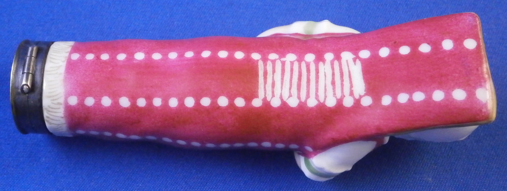 This is a rare figural needle / bodkin case / sewing etui in the shape of a swaddled baby made in Denmark by Royal Copenhagen in the early 19th century. Superbly modeled as a baby in a dark pink blanket with green bows to the front and some gold details. Her arms are across the chest and one to the side. Super cute piece and it is hand painted so nicely especially the face. The lid is made of silver but is not marked which later examples are so it's an early piece for sure. The inside of the porcelain has their three wavy blue lines mark as shown. The piece is in great condition with the lid having a tiny dent in the edge and it is tarnished from age which can be polished but I prefer not doing it so I left it. The back of the piece has straight lines cut into it to connect the dots. This is not glazed so not sure when it was done but it looks nice and fits. The entire piece is 3.375 inches tall, 1.25 inches wide and 1.125 inches deep. Please email me for more information or other pictures.