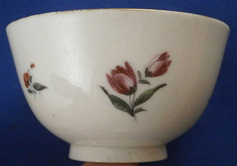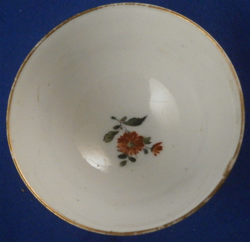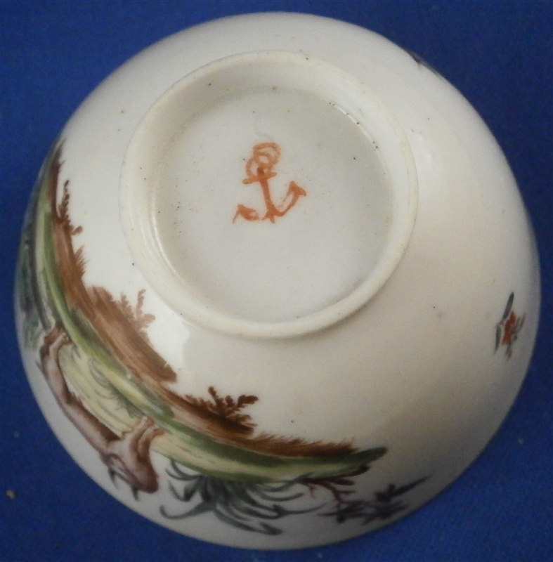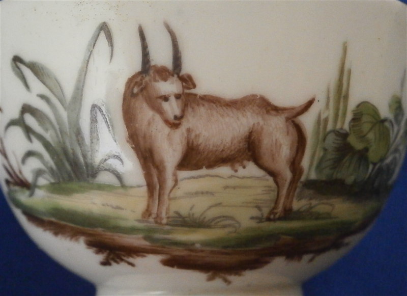 This is a superb cup made by Cozzi in the late 18th century. The factory made soft-paste porcelain in Venice and was founded by Geminiano Cozzi in 1764. It closed in 1812. The cup is hand painted with a nice animal (goat ?) in a landscape surrounding with three flowers on the back side and another on on the bottom inside. Gold trim to the edge. The cup is in perfect condition with some wear to the gold trim. It is 1.625 inches tall and has a diameter of 2.875 inches and marked underneath with the red anchor mark as shown. Please email me for more information or other pictures.