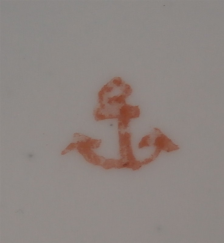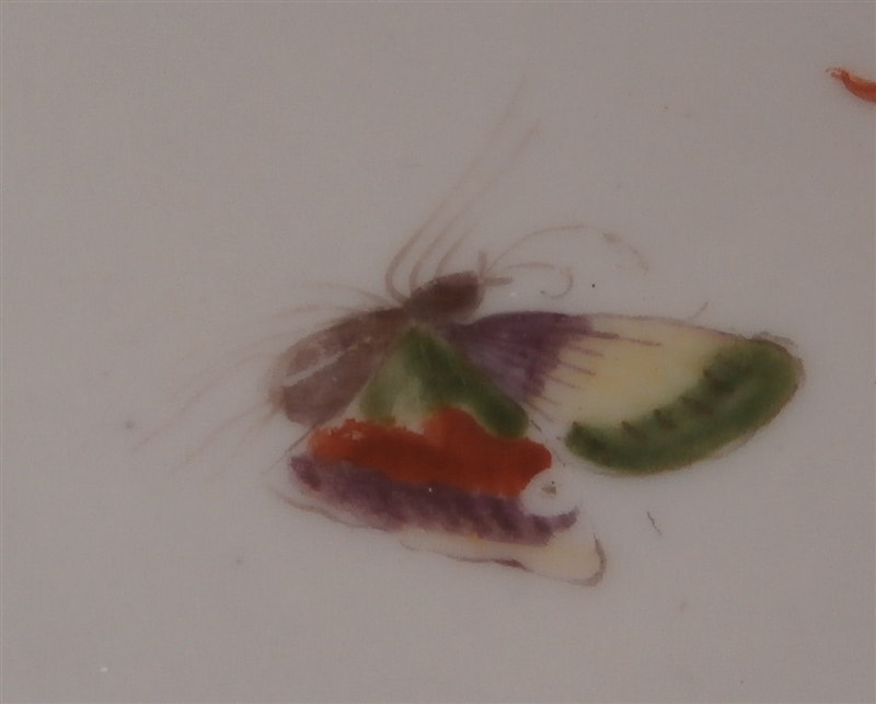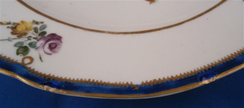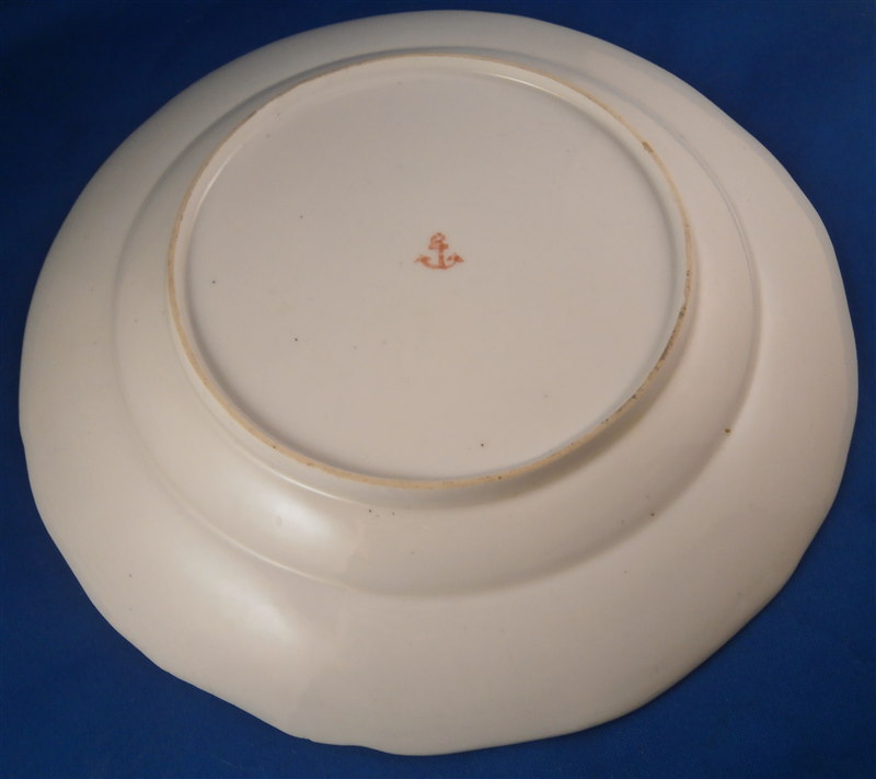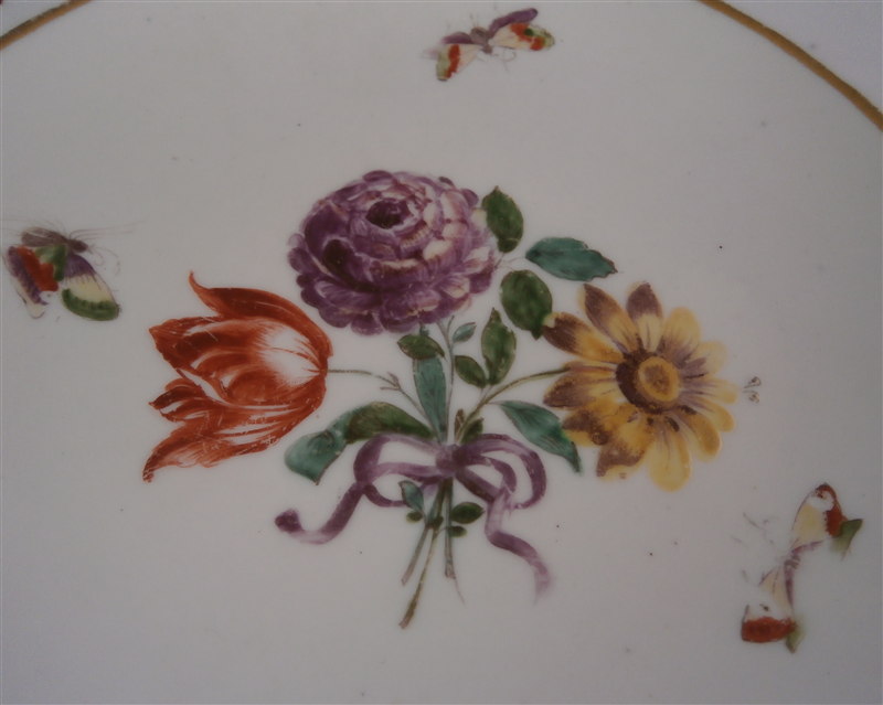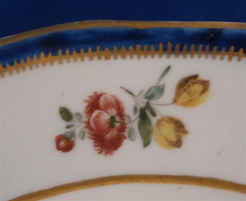 This is a nice floral plate made by Cozzi around 1770. The factory made soft-paste porcelain in Venice and was founded by Geminiano Cozzi in 1764. It closed in 1812. The plate is handpainted with a floral arangement in the center held together with a purple bow as well as three fun bugs around the bouquet, a gold ring around the well, five smaller flower arrangements along the rim with a gold and cobalt blue trim along the edge. A superp plate that is just plain fun to look at! The piece is in decent condition with some use wear as well as two small painted in chips along the rim as shown. It displays nicely and is a quite rare example to find. The plate is 1.25 inches tall and 9.375 inches in diameter. It is marked with their red anchor mark underneath as shown. Please email me for more information or other pictures.