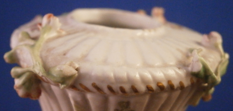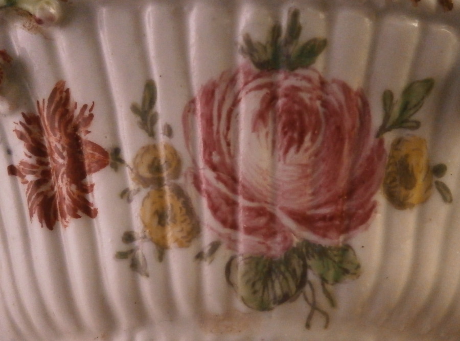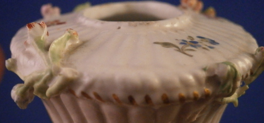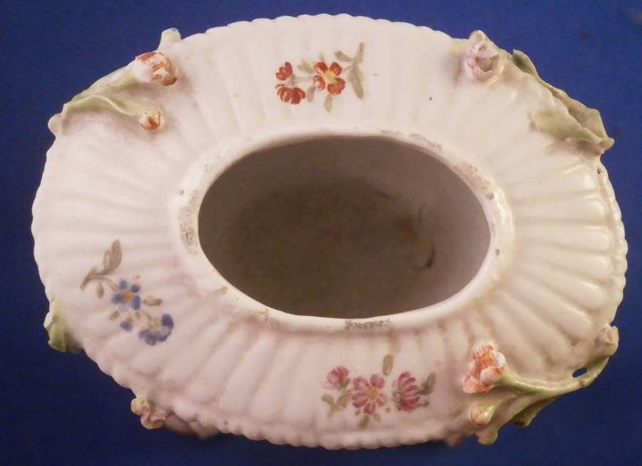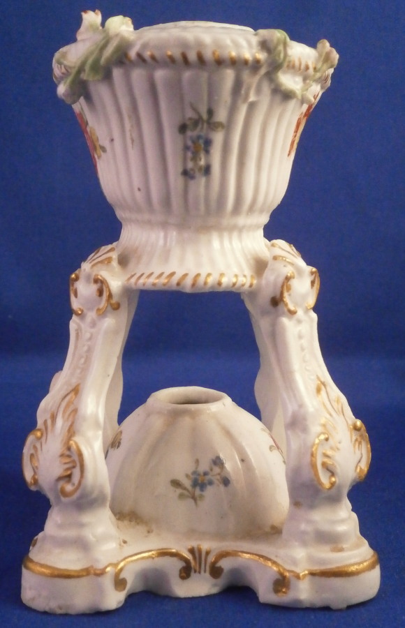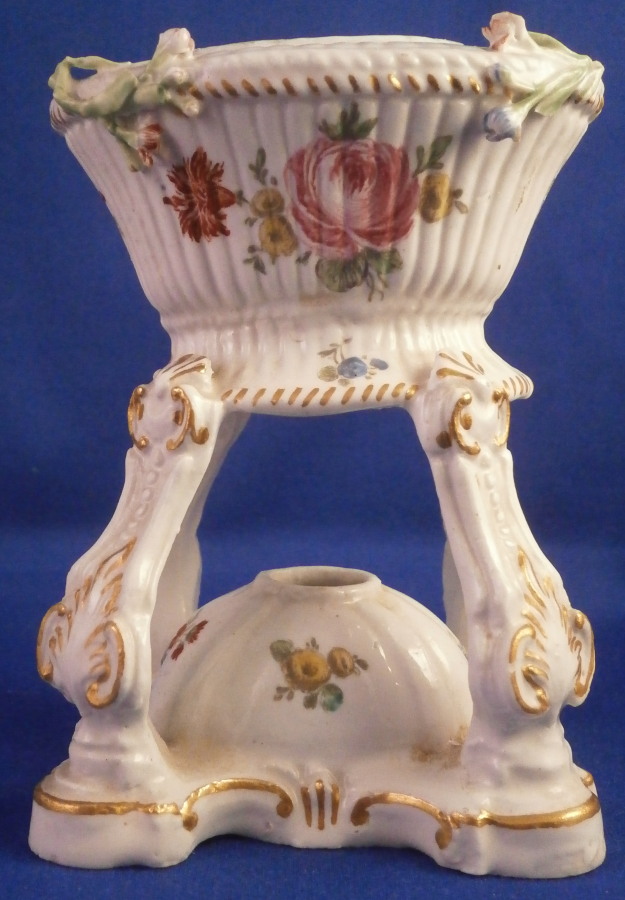 This is a potpourri dish I think was made by Cozzi in the 18th century. The factory made soft-paste porcelain in Venice and was founded by Geminiano Cozzi in 1764. It closed in 1812. I have looked at this for a while now and it is not German with those delicate little flowers and leaves and the paste looks Italian to me. Cozzi fits the best in terms of the flowers. Either way it is a nice little dish that is modeled superbly with those four feet supporting the top part where the liquid would sit and the burner part in the base. Hand painted with a flower design to the front and back as well as several single flowers throughout. Applied flowers and leaves to the top which I think are the terminals of where a handle would have been on either side. These often had lids though the opening on this one here is much smaller so it might have not had one. The piece is in good condition with the handles I think it had missing and two flowers missing on one of the terminals but otherwise in tip top shape and a rare survivor. It is 4.125 inches tall and the base is 3 inches wide and 2.625 inches deep. Unmarked which makes it much harder to ID. I am pretty certain it is by Cozzi and definitely Italian in origin. Please email me for more information or other pictures.